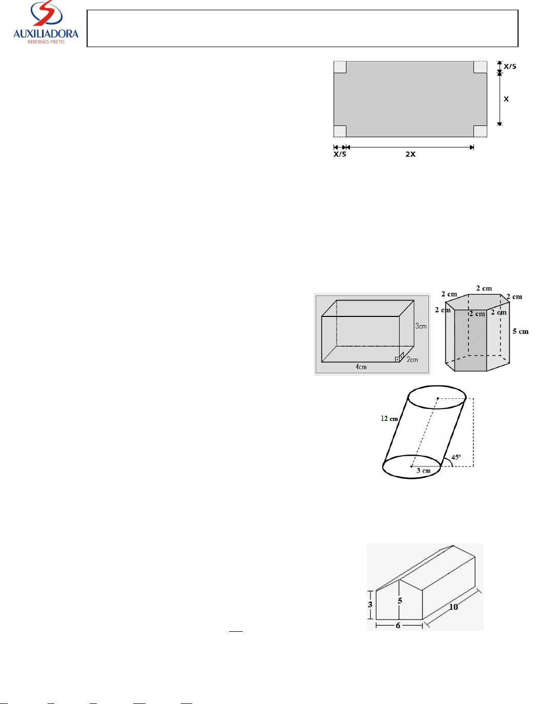 1. Um poliedro possui seis faces quadrangulares e duas hexagonais. Calcule o número de vértices desse poliedro. 2. Um poliedro convexo tem cinco faces quadrangulares e duas faces pentagonais. Determine o número de arestas e o número de vértices. 3. Num poliedro convexo, o número de arestas é 16 e o número de faces é 9. Determine o número de vértices. 4. Qual a soma das medidas dos ângulos das faces de um poliedro que possui 12 faces e 30 arestas? 5. Sabendo que em um poliedro de 8 arestas a soma das medidas dos ângulos internos de todas as faces é igual a 1.080º, determine o número de faces. 6. (Fuvest) O número de faces triangulares de uma pirâmide é 11. Pode-se, então, afirmar que essa pirâmide possui quantas arestas e quantos vértices? 7. Dispondo-se de uma folha de cartolina, de 70cm de comprimento por 50cm de largura, pode – se construir uma caixa, sem tampa, cortando-se um quadrado de 8cm de lado em cada lado. Determine o volume desta caixa. 8. As dimensões a, b e c de um paralelogramo são proporcionais aos números 2,4 e 7. Determine essas dimensões sabendo que a área total desse sólido é de 900cm² 9. A partir de 64 cubos brancos, todos iguais, forma-se um novo cubo. A seguir, esse novo cubo tem cinco de suas seis faces pintadas de vermelho. O número de cubos menores que terão pelo menos duas de suas faces pintadas de vermelho é: (a) 24 (b) 26 (c) 28 (d)30 (e)32 10. (FUVEST 2002) Em um bloco retangular (isto é, paralelepípedo reto retângulo) de volume 8 27 , as medidas das arestas concorrentes em um mesmo vértice estão em progressão geométrica. Se a medida da aresta maior é 2, a medida da aresta menor é: a) 8 7 b) 8 8 c) 8 9 d) 8 10 e) 8 11 11. (Unicamp 01) A figura abaixo é a planificação de uma caixa sem tampa: a) Encontre o valor de x, em centímetros, de modo que a capacidade dessa caixa seja de 50 litros. b) Se o material utilizado custa R$ 10,00 por metro quadrado, qual é o custo de uma dessas caixas de 50 litros considerando-se apenas o custo da folha retangular plana? 12. Determine a área total e o volume dos prismas abaixo: 13. (EUMT - LONDRINA) Qual é o volume de ar contido em um galpão com a forma e as dimensões dadas pela figura abaixo? 14.Calcule a diagonal, a área total e o volume de um paralelepípedo de dimensões 3cm, 4cm e 6cm. 15. Calcule a diagonal, a área total e o volume de um cubo de 2cm de aresta. 16. Qual é a distância entre os centros de duas faces adjacentes de um cubo de 4cm de aresta? 17. Um prisma triangular regular tem 4 cm de altura e o apótema da base mede 3cm. Calcule o seguinte, desse prisma: (a) a aresta da base; (b) a área da base; (c) a área de uma face lateral; (d) a área lateral; (e) a área total; (f) o volume. Lista de exercícios — Geometria Espacial Professor Daniel 18. Calcule o volume de um prisma triangular de 6 cm de altura, cujas arestas da base medem 5cm , 5cm e 8cm. 19. (Unicamp 01) A base de uma pirâmide é um triângulo eqüilátero de lado L = 6cm e arestas laterais das faces A = 4cm. a) Calcule a altura da pirâmide. b) Qual é o raio da esfera circunscrita à pirâmide? 20. Aproximando-se a casquinha de um sorvete a um cone reto invertido e a bola do sorvete a uma meia esfera, sabendo-se que a castinha tem uma geratriz de 5 cm e a meia esfera encaixada perfeitamente na base do cone tem 3 cm, qual é o volume de sorvete? 21. No problema anterior, considere a mesma casquinha, mas em vez de meia esfera temos uma esfera de raio 5 cm no topo do cone encaixando-se a este a uma distância de 4 cm do centro da esfera. Nessas condições, qual é o volume de sorvete? 22. Em um barzinho alguém propõe um desafio: Descobrir se ao colocarmos uma bolinha de gude em um copinho de plástico com um pouco de líquido esse líquido transbordará. O copinho pode ser aproximado a um tronco de cone invertido e a bolinha a uma esfera. Como você é esperto, faz algumas medições para vencer o desafio. Ao medir a circunferência máxima da bolinha descobre que esse comprimento é de 6𝜋 cm de e que o copinho tem 15 cm de altura e duas circunferências formando as bases desse copo, a de cima, aberta, com o diâmetro de 6 cm, e a de baixo, fechada, com diâmetro de 4 cm. Se o líquido possui um volume de 60𝜋 cm3, ele transbordará ou não quando colocarmos a bolinha dentro do copo? 23. As áreas das bases de um cone circular reto e de um prisma quadrangular reto são iguais. O prisma tem altura 12 cm e volume igual ao dobro do volume do cone. Determinar a altura do cone. 24. Uma pirâmide tem a altura medindo 30 cm e área da base igual a 150 cm². Qual é a área da seção superior do tronco desta pirâmide, obtido pelo corte desta pirâmide por um plano paralelo à base da mesma, sabendose que a altura do tronco da pirâmide é 17 cm? 25. Considere dois tubos de ensaio. Um na forma de cilindro circular reto de raio r e outro na forma de um cone circular reto de raio R. Suponha que o cilindro contenha um líquido até o nível H e que a altura do cone seja sH, onde s é o número real positivo. a) Determine o volume do líquido contido no cilindro e a capacidade do cone. b) Admitindo que para s = 3 o líquido caiba todo no cone, mostre que a razão entre o raio do cone e o raio do cilindro é maior ou igual a 1. 26. A figura abaixo representa um galpão de base circular e suas medidas estão nela representadas. Quantos metros quadrados de telhado, aproximadamente, foram gastos para cobrir esse galpão? 27. Um recipiente na forma de um cone reto invertido está preenchido com água e óleo, em duas camadas que não se misturam. A altura, medida na vertical, da camada de óleo é metade da altura da parte de água, como ilustrado a seguir.Se o volume do recipiente é 54cm3, qual o volume da camada de óleo? 28. Um reservatório de forma cônica para armazenamento de água t em capacidade para atender às necessidades de uma comunidade por 81 dias. Esse reservatório possui uma marca