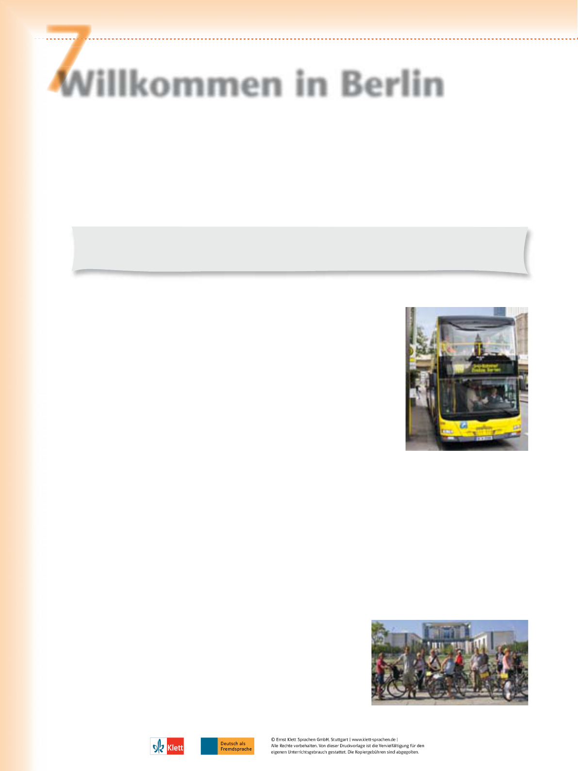 78 $1 Sie kommen in Berlin an. Ordnen Sie zu. Schreiben Sie wie im Beispiel. 1. Sie möchten in Berlin übernachten. a) Sie brauchen ein Ticket. 2. Sie möchten eine Pause machen. b) Sie brauchen eine Wohnung. 3. Sie möchten Deutsch lernen. c) Sie machen eine Stadtrundfahrt. 4. Sie möchten mit der U-Bahn fahren. d) Sie machen einen Sprachkurs. 5. Sie möchten in Berlin leben. e) Sie suchen ein Café und bestellen ein Mineralwasser. 6. Sie möchten die Stadt besichtigen. f) Sie suchen ein Hotel oder eine Jugendherberge. $2 Berlin kennenlernen Ergänzen Sie die Dialoge. Dialog 1 # Entschuldigung, wo ist denn die Touristeninformation? a s > Tut mir leid, d__ __ weiß ich ni__ __ __. Was suchen S__ __ denn? Ich woh__ __ hier, vielleicht kann ich Ih__ __ __ helfen. # Ich bin d__ __ erste Mal hier und mö__ __ __ __ eine Stadtrundfahrt mac__ __ __. > Da ha__ __ ich einen guten Ti__ __. Die beste Stadtrundfahrt kön__ __ __ Sie mit dem B__ __ 100 machen. Der startet am Bah__ __ __ __ Zoo und fä__ __ __ bis Alexanderplatz. Die Fahrt dau__ __ __ ungefähr eine halbe Stu__ __ __. Das ist wirklich su__ __ __ und kostet nur d__ __ normalen Buspreis! # Wie o__ __ fährt der Bus? > Das we__ __ ich nicht genau. Fragen Sie doch dort bei der BVG-Information. Dialog 2 # Bist du das erste Mal in Berlin? > Ich le__ __ seit zwei Monaten hi__ __, aber ich ken__ __ nur mein Bü__ __ in Berlin-Mitte und meine Woh__ __ __ __ in Friedrichshain. U__ __ am Wochenende le__ __ __ ich Berlin ken__ __ __ ! Heute mache i__ __ mit Leuten eine Stadtrundf__ __ __ __ mit dem Fahrrad. Da tri__ __ __ man nette Le__ __ __ , lernt die St__ __ __ kennen und ma__ __ __ Sport! # Das ist e__ __ guter Tipp. Wer organisiert das? > Das weiß ich ni__ __ __ genau, wir tre__ __ __ __ uns an der Kulturbrauerei. Ab__ __ hier habe ich die Internetadr__ __ __ __ . www.berlinonbike.de achtundsiebzig Willkommen in Berlin 1. Ich möchte in Berlin übernachten. Ich suche ein Hotel oder eine Jugendherberge. 7 79 7 $3 Wo ist bitte …? Wie komme ich …? Ich suche … Wegbeschreibungen – Sehen Sie die Skizze an und schreiben Sie. neunundsiebzig Internet- Cafe / 0 1 1. „Entschuldigung, wie komme ich zur Post?“ Gehen Sie geradeaus,da sehen Sie die Post. _________________________________________ an der Ampel links _________________________________________ Gehen Sie geradeaus, _________________________________________ und die nächste rechts, _________________________________________ 2. „Wo ist das Arbeitsamt?“ dann gleich wieder rechts, _________________________________________ an der zweiten Kreuzung sehen Sie das Arbeitsamt. _________________________________________ Gehen Sie die nächste links, _________________________________________ 3. „Entschuldigen Sie, wir suchen das Internetcafé.“ und dann gleich links, _________________________________________ dann die dritte Straße rechts _________________________________________ da sehen Sie das Internetcafé. _________________________________________ Gehen Sie geradeaus, _________________________________________ die dritte Straße … rechts/links die zweite Straße … die erste/nächste (Straße) … / gleich … (immer) geradeaus an der Ampel … an der Kreuzung … Arbeits- amt Post 80 achtzig $4 Auskunft geben – Imperativ Schreiben Sie Imperativsätze: a) Sie-Form, b) Du-Form. 1. am Bahnhof a) Steigen Sie am Bahnhof aus. b) Steig am Bahnhof aus. aussteigen ____________________________________________________________________________ 2. den Bus 32 nehmen ____________________________________________________________________________ 3. das Fahrrad benutzen ____________________________________________________________________________ 4. in den Stadtplan schauen ____________________________________________________________________________ 5. in den Park gehen ____________________________________________________________________________ 6. ein Ticket kaufen ____________________________________________________________________________ 7. die Tür schließen ____________________________________________________________________________ 8. die Frau fragen ____________________________________________________________________________ $5 Präpositionen mit Dativ 5.1 Ergänzen Sie die Dativ-Formen. er1. Meike wohnt mit ein_________ Freundin zusammen. 2. Julian fährt mit ein_________ Freund nach München. Sie fahren zusammen mit d_________ Zug. 3. Ich feiere meinen Geburtstag mit mein_________ Mutter und mein_________ Geschwistern. 4. Fährst du mit d_________ Straßenbahn oder mit d_________ Auto nach Hause? 5. Geht ihr am Sonntag mit d_________ Kindern in den Park? 6. Klaus fährt mit sein_________ Frau und seine_________ Sohn nach Frankfurt. 5.2 Ergänzen Sie die Präpositionen und Artikel. u1. # Sind die Kinder z_________ Hause? > Jan ist i_________ d_________r Schule und Daniela a_________ d_________ Sportplatz. 2. # Fährst du z_________ Bahnhof? Erik kommt u_________ halb zehn an. > In Ordnung. 3. # Wann fahrt ihr n_________ Hamburg? > Am Wochenende. 4. # Wo ist das Cinemaxx? > Das ist a_________ Bahnhof. 5. # Entschuldigung, ich suche eine Sparkasse. > Kein Problem, a_________ d_________ Kreuzung links und dann bis z_________ Ampel. 6. # Liest du morgens Zeitung? > Natürlich, aber nicht z_________ Hause. Ich lese sie immer i_________ d_________ Straßenbahn. 81 7 einundachtzig 5.3 Bestimmter und unbestimmter Artikel – Ergänzen Sie. em1. mit d_________ Bus fahren 11. e_________ Salat machen 2. d_________ Linie 3 nehmen 12. e_________ Kilo Bananen kaufen 3. e_________ Haltestelle suchen 13. e_________ Pizza essen 4. z_________ Bahnhof gehen 14. d_________ Gemüse kochen 5. d_________ Ticket bezahlen 15. mit d_________ Freunden essen 6. mit d_________ Straßenbahn fahren 16. e_________ Text hören 7. an d_________ Haltestelle warten 17. d_________ Aussprache üben 8. in e_________ Cafè Eis essen 18. e_________ Dialog sprechen 9. e_________ Kaffee nehmen 19. mit d_________ Partner sprechen