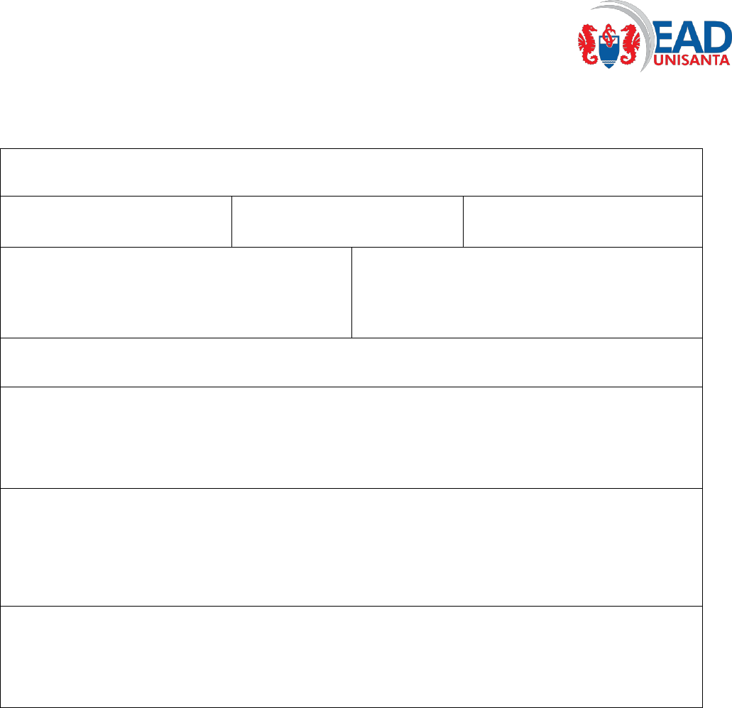 EaD UNISANTA Rua Cesário Mota, 08 - Bloco F, Sala F12 – Boqueirão – Santos/SP – CEP 11045-040 – Tel. (13) 3202-7159 UNIVERSIDADE SANTA CECÍLIA FACULDADE DE EDUCAÇÃO ESPECIAL ∞ FaEE Curso de Graduação em Educação Especial, Licenciatura. RELATÓRIO DE ATIVIDADES COMPLEMENTARES Aluno: Queila Cristina Ferreira Campos Martins RA: 165067 Curso: Educação Especial Semestre: 4º Atividade (curso, palestra, voluntariado, etc.): Curso Livre Carga Horária: 100 horas Título da atividade: Planejamento e Estratégias da Gestão Escolar Nome do professor da atividade (ou instituição onde realizou): Não consta no curso, apensas Fundação Getúlio Vargas Objetivo (por que realizou/escolheu esta atividade?): È um curso livre online, onde eu tenho tempo e comodidade para realizar, para que eu tenha mais conhecimento poe esse curso que é muito interessante e para que eu pudesse estar montando minha pasta complementar Materiais (utilizou algum material, apostila ou recurso?): Apostila e arquivos em Pdf para que podemos ler e interpretar.