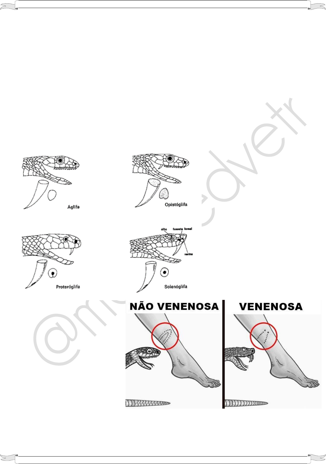 Zoologia e Parasitologia Veterinária – Prof. Dr. Gustavo G. Cavalcante SUBORDEM OPHIDIA • Características gerais: o Pele escamosa lisa ou carenadas; o Corpo alongado; o Sem apêndices locomotores e cintura escapular; o Perda da sínfise mandibular; o Pálpebras fixas; o Audição fraca, visão binocular, olfato aburado; o Língua bífida e protátil → órgão de Jacobson (câmaras sensitivas no palato); o Fosseta loreal → característica de serpentes peçonhentas; o Dentição: ▪ Áglifa: muitos dentes fixos e pequenos e ausência de presas inoculadoras → jiboias e sucuris; ▪ Opistóglifa: dois ou mais dentes inoculadores no fundo da boca com um sulco externo → falsas corais; ▪ Proteróglifa: presença de um par de presas anteriores no maxilar → corais verdadeiras e najas; ▪ Solenóglifa: par de dentes bem desenvolvidos, móveis, grandes e pontiagudos → jararacas, cascavéis e surucucus; Zoologia e Parasitologia Veterinária – Prof. Dr. Gustavo G. Cavalcante Diferenciar serpentes peçonhentas e não peçonhentas Características Peçonhenta Não peçonhenta Cabeça Achatada, triangular e destacada Estreita, longa e pouco destacada Olhos e Fosseta loreal Olhos pequenos, pupila em fenda vertical e possuem fosseta loreal entre os olhos e as narinas Olhos grandes, pupila circular e sem fosseta loreal Escamas Alongadas, pontudas, imbricadas e ásperas Achatadas, lisa e lubrificada Cauda Curta e afina bruscamente Longa e afina gradualmente Atitude Ataca quando perseguida Fogem quando perseguidas Hábitos Noturnos Diurnos Acidente botrópico em animais Fichamento do artigo “Acidente com serpente do gênero Bothrops em cão – Relato de caso” • Responsável por 90% dos acidentes por serpentes na América do Sul; • Veneno: possui ação proteolíticas, coagulante e hemorrágica; • Ação inflamatória: devido á ação proteolítica do veneno; • Necrose: histamina, bradicinina, prostalglandinas, leucotrienos e eicosanoides; • Sinais clínicos: o Hemorragia e edema; o Taquicardia; o Dispneia; o Aumento da temperatura; o Insuficiência respiratória; • Tratamento: soro antibotrópico/soro polivalente intravenoso; • Contraindicações: o Não utilizar o torniquete; o Não cortar o local da picada.