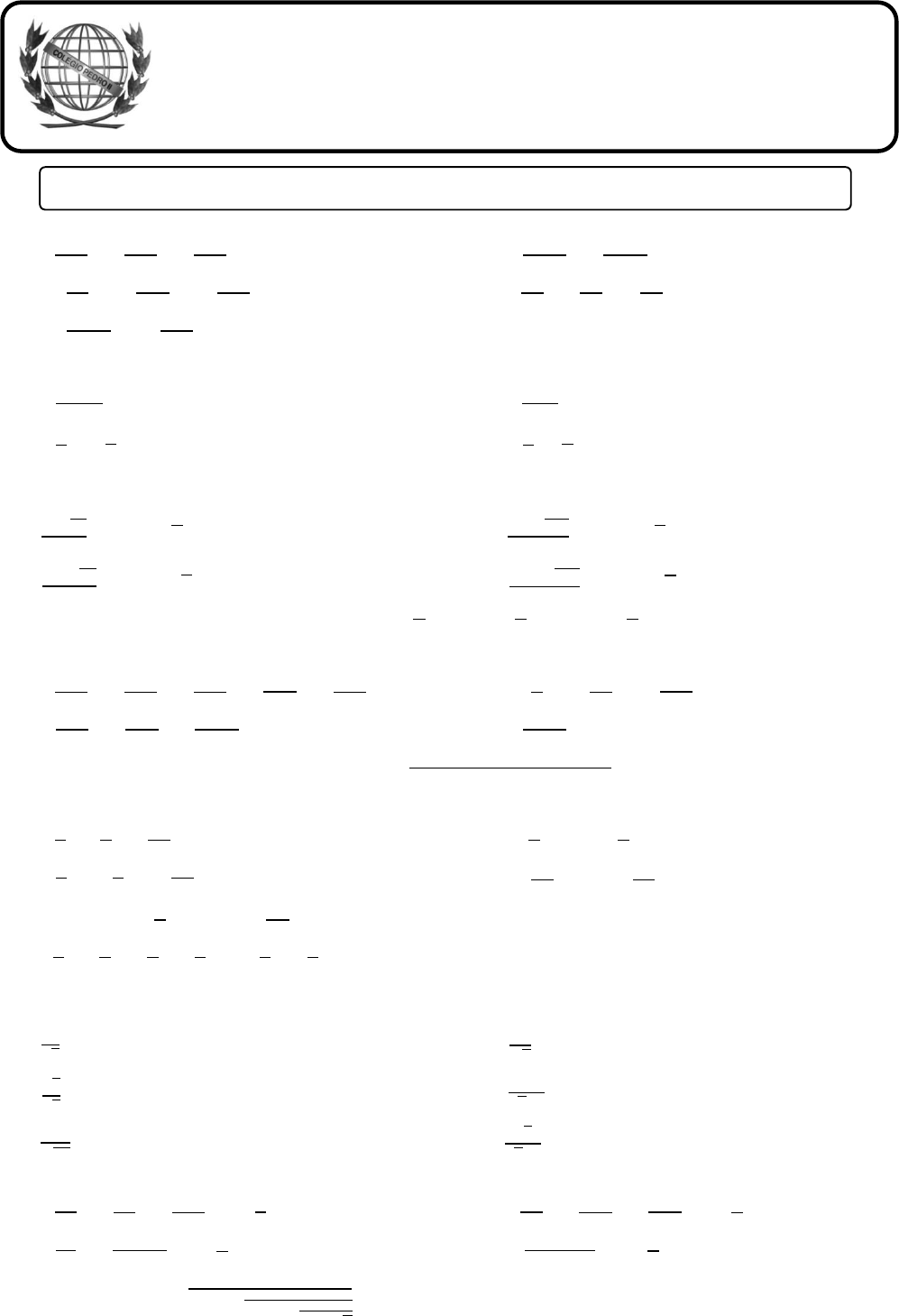 COLÉGIO PEDRO II – CAMPUS SÃO CRISTÓVÃO II Nome: __________________________________ N°: ____ Turma: _____ Professor (a): _____________________________ Data: ____/____/____ Lista 2 – Simplificação de radicais, operações com radicais e racionalização de denominadores 1. Calcule o valor de cada expressão. (a) √121 + √144 + √169 (b) 2√64 + 3√225 + 4√529 (c) 4√1331 3 − 3√125 3 (d) √1764 + √1849 (e) √64 + √81 + √81 4 2. Sendo 𝒙 = 𝟗 e 𝒚 = 𝟏𝟔, calcule. (a) √𝑥 + 𝑦 (b) √𝑥 + √𝑦 (c) √𝑥 ∙ 𝑦 (d) √𝑥 ∙ √𝑦 3. Calcule os valores de 𝒙 e 𝒚. (a) 4+√80 2 = 𝑥 + 𝑦√5 (b) 20+√72 4 = 𝑥 + 𝑦√2 (c) 18+√108 3 = 𝑥 + 𝑦√3 (d) 432−√150 6 = 𝑥 − 𝑦√6 4. Considere, com aproximação de centésimos, √𝟐 ≈ 𝟏, 𝟒𝟏, √𝟑 ≈ 𝟏, 𝟕𝟑 e √𝟓 ≈ 𝟐, 𝟐𝟑. Determine o valor de cada expressão a seguir. (a) √200 + √300 + √400 + √500 + √600 (b) √800 + √900 + √1000 (c) 2√8 + 3√27 + 4√125 (d) √1125 5. Explique, sem utilizar a calculadora, porque √𝟐𝟑𝟒𝟓𝟓𝟏𝟐𝟓𝟏𝟓𝟏𝟖𝟐𝟒𝟖𝟗𝟖 não é um número inteiro. 6. Aplicando a propriedade distributiva, calcule os produtos abaixo. (a) √2 ∙ (√8 + √32) (b) √3 ∙ (2√3 + 3√27) (c) (√2 − 1) ∙ (√2 + 1) (d) (√13 − 3) ∙ (√13 + 3) 7. Sabendo que √𝟔 ≈ 𝟐, 𝟒𝟓 e √𝟏𝟎 ≈ 𝟑, 𝟏𝟔, com aproximação de centésimos, calcule o valor aproximado de √2 ∙ (√2 + √3 + √5) + (√2 + √3)2. 8. Racionalize o denominador dos seguintes números. (a) 1 √3 (b) √3 √5 (c) 4 √12 3 (d) 3 √2 4 (e) 4 √2+1 (f) √3 √3−3 9. Calcule o valor de 𝒙 em cada item a seguir. (a) √45 + √80 + √180 = 𝑥√5 (b) √25 + √23 ∙ 32 = 𝑥√2 (c) √54 + √128 + √250 = 𝑥√8 (d) √2356695 3 = 𝑥 √5 3 10. Calcule o valor de √16 + √13 + √7 + √4.