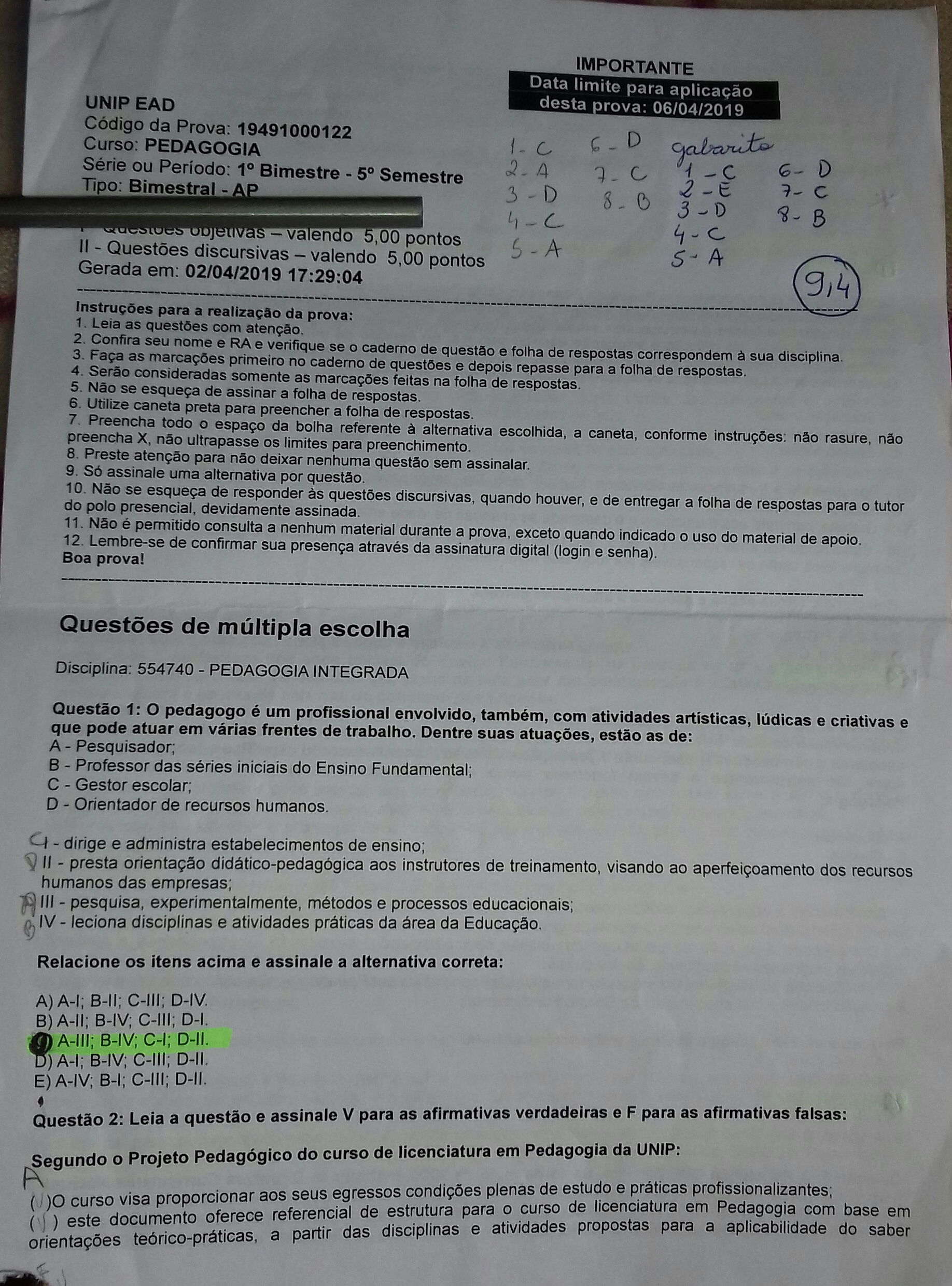 Questao 1: pedagogo e um profissional envolvido, tambem, com atividades artisticas, ludicas e criativas e que pode atuar em varias frentes de trabalho. Dentre suas atuacoes, estao as de: Relacione itens acima e assinale a alternativa correta: A - Pesquisador; B - Professor das series iniciais do Ensino Fundamental; C - Gestor escolar; - Orientador de recursos humanos. - dirige e administra estabelecimentos de ensino; - presta orientacao didatico-pedagogica aos instrutores de treinamento, visando ao aperfeicoamento dos recursos humanos das empresas; III - pesquisa, experimentalmente, metodos e processos educacionais; IV - leciona disciplinas e atividades praticas da area da Educacao. A) A-I; B-II; C-III; D-IV. B) A-II; B-IV; C-III; D-I. C) A-III; B-IV; C-I; D-II. D) A-I; B-IV; C-III; D-II. E) A-IV; B-I; C-III; D-II.