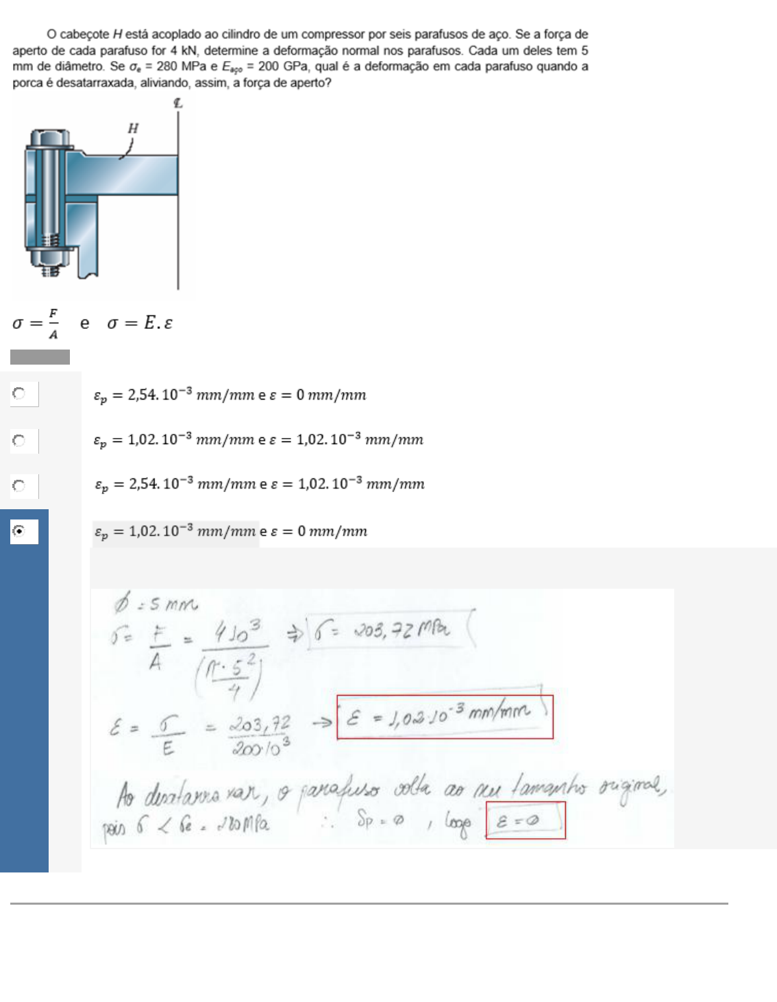APOL 5 Questão 1/5 - Principios de Mecânica e Resistência dos Materiais Nota: 20.0 A B C D Você acertou! Aula 5, tema 1 Questão 2/5 - Principios de Mecânica e Resistência dos Materiais A peça de máquina feita de alumínio está sujeita a um momento M=75 N.m. Determine as tensões de flexão máximas tanto de tração quanto de compressão na peça. Nota: 20.0 A "a" é a alternativa correta. B "b" é a alternativa correta. Você acertou! C "c" é a alternativa correta. D "d" é a alternativa correta. Questão 3/5 - Principios de Mecânica e Resistência dos Materiais Para determinar características do comportamento dos materiais, os engenheiros fazem ensaios em laboratórios. Através destes ensaios, é possível construir um diagrama tensão-deformação. Sobre este diagrama, é INCORRETO afirmar: Nota: 20.0 A Este diagrama relaciona cargas aplicadas a um material com as deformações geradas no mesmo; B Ocorre o comportamento elástico do material quando a chamada tensão de escoamento é atingida e superada; Você acertou! SOLUÇÃO: Problema conceitual, dado por definição. Ver Hibbeler – Resistência dos Materiais, página 58. C Este diagrama é importante na engenharia porque proporciona os meios para se obterem dados sobre a resistência à tração (ou compressão) de um material sem considerar o tamanho ou a forma física do material, isto é, sua geometria; D No limite de resistência, a área da seção transversal começa a diminuir em uma região localizada no corpo de prova. Como resultado, tende a formar-se uma constrição (ou “estricção”) gradativa nessa região; Questão 4/5 - Principios de Mecânica e Resistência dos Materiais O eixo maciço está preso ao suporte em C e sujeito aos carregamentos de torção mostrados. Determine a tensão de cisalhamento nos pontos A e B. Analise as alternativas abaixo e marque a correta: Nota: 20.0 A "a" é a alternativa correta. Você acertou! B "b" é a alternativa correta. C "c" é a alternativa correta. D "d" é a alternativa correta. Questão 5/5 - Principios de Mecânica e Resistência dos Materiais As sapatas do freio do pneu de uma bicicleta são feitas de borracha. Se uma força de atrito de 50 N for aplicada de cada lado dos pneus, determine a deformação por cisalhamento média na borracha. As dimensões da seção transversal de cada sapata são 20 mm e 50 mm. Dica: a Lei de Hooke para cisalhamento é dada por , e G e E são relacionados pelo coeficiente de Poisson. O módulo de elasticidade ao cisalhamento da borracha é dado por G=0,20 MPa. Nota: 20.0 A 0,185 rad B 0,200 rad C 0,215 rad; D 0,250 rad; Você acertou!