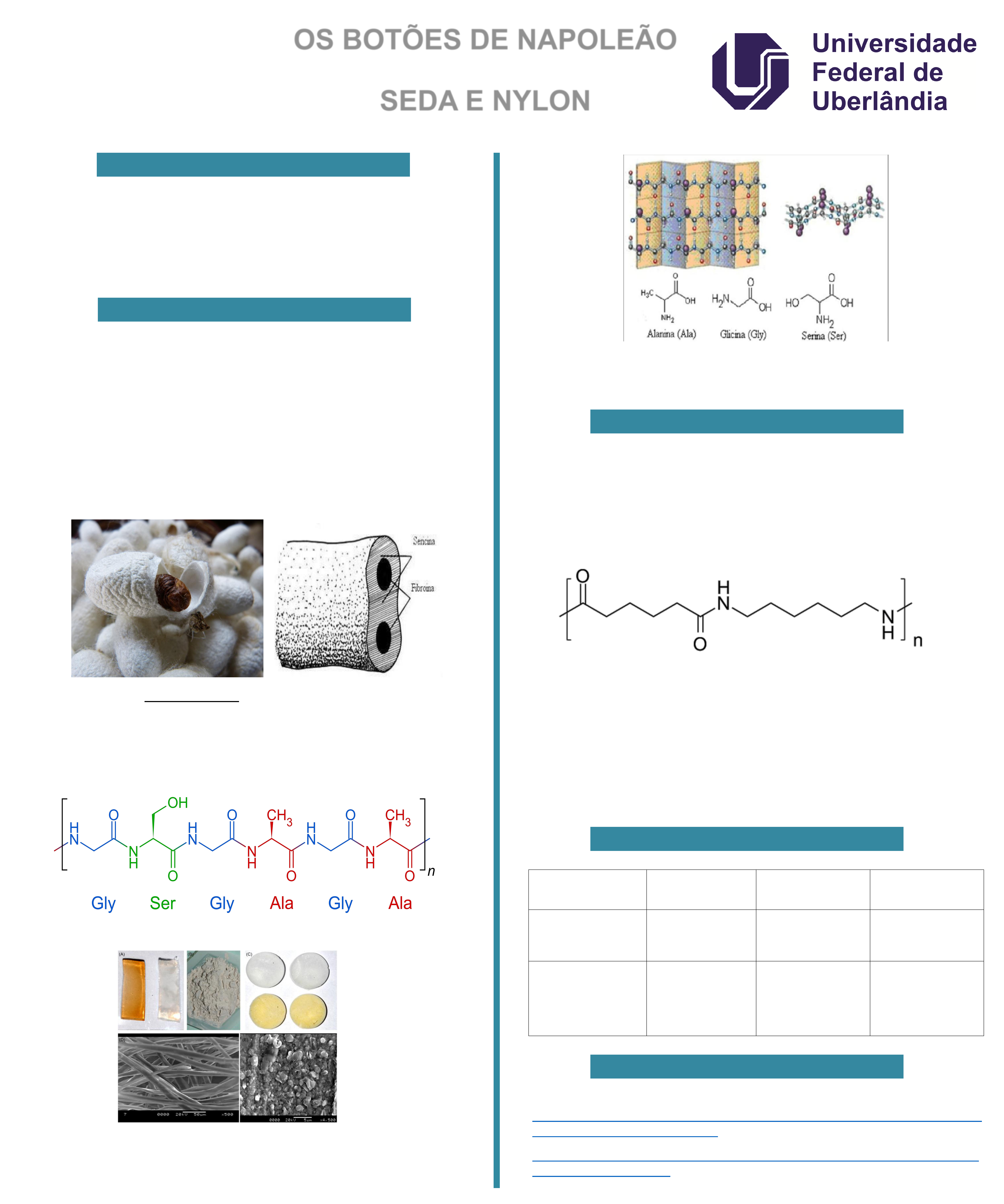 * * OS BOTÕES DE NAPOLEÃO SEDA E NYLON A seda e o nylon partilham uma herança comum. Trata-se de mais que uma mera estrutura química comparável e uma notável adequabilidade para uso em meias e paraquedas. Os dois polímeros contribuíram — cada um à sua maneira — para a enorme prosperidade econômica de seus tempos. Seda é uma fibra proteica obtida a partir dos casulos do bicho-da-seda, por um processo designado de sericicultura. A fibra de seda natural é um filamento contínuo da proteína, produzido pelas lagartas de certos tipos de mariposas, sendo uma das matérias-primas mais caras. As lagartas expelem através das glândulas o líquido da seda (a fibroína) envolvido por uma goma (a sericina) que se solidificam imediatamente quando em contato com o ar. A fibroína é biodegradável, termicamente estável, altamente cristalina, flexível, resistente à tração, além de insolúvel em água e na maioria dos solventes inorgânicos. O nylon, cuja base não é a celulose, é um polímero obtido a partir da poliamida 6, cujas excelentes propriedades mecânicas, elétricas e térmicas permitem as mais variadas aplicações, nos mais diversos ramos da indústria mecânica, elétrica e químicas. O elo amida no nylon, da mesma maneira que na seda, é formado pela eliminação de uma molécula de água entre as extremidades das duas moléculas, do átomo H de NH2 e do OH de COOH. A ligação amida resultante, mostrada como -CO-NH- (ou, em ordem inversa, como -NHCO-) une as duas diferentes moléculas. https://crispassinato.files.wordpress.com/2016/03/osbotoesdenapoleao-140222075916-phpapp02.pdf http://repositorio.unicamp.br/jspui/bitstream/REPOSIP/266056/1/Bergamasco_DaivesArakem_M.pdf Autores: Luciana, Lucas, Vitor Disciplina: Química Orgânica Professora/Orientadora: Amanda Danuello FIGURA 2 – Estrutura Primaria da Fibroína. (NOGUEIRA, 2005). FIGURA 3 – Biomateriais fabricados a partir da fibroína da seda: (A) hidrogéis; (B) pó liofilizado; (C) andaimes poderosos 3D; (D) tapete de seda nativa; (E) micropartículas de seda. Figura 1 – Bombys Mori L., o bicho-da-seda em casulo e filamento de seda. Introdução Seda e Fibroína Nylon FIGURA 5 – Estrutura do Nylon 6,6. Comparativos Referências FIGURA 4 – Estruturas folha-β da fibroina e dos principais aminoácidos que a compõem (Nelson e Cox, 2000).
