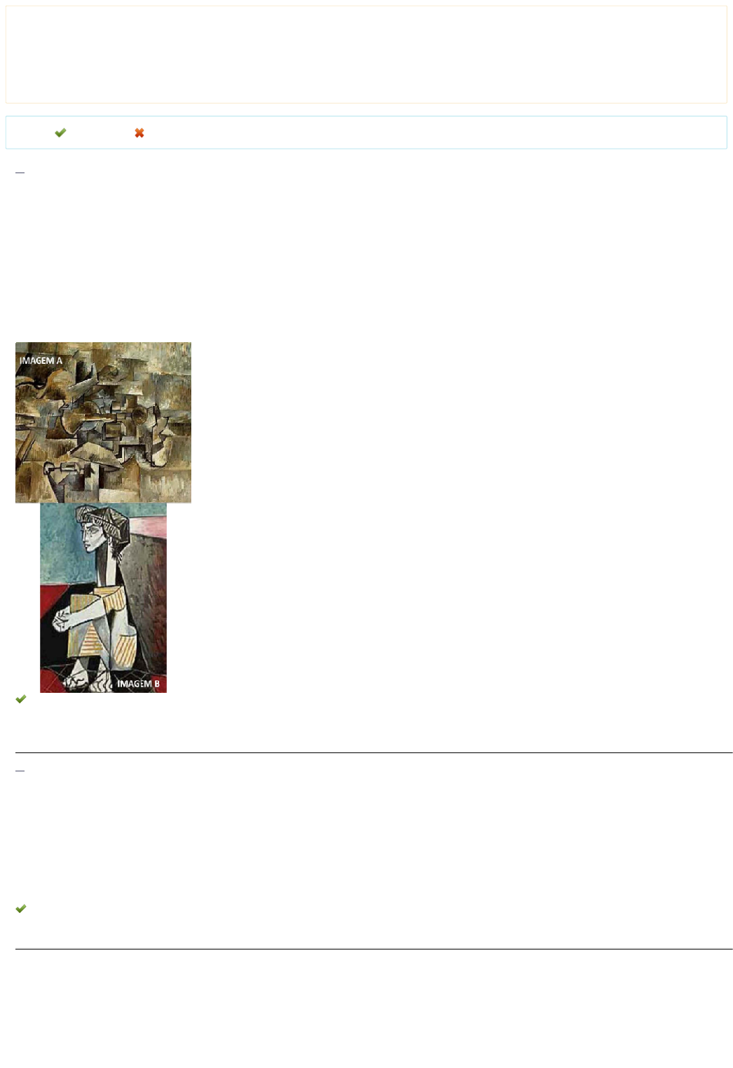 Disciplina: História da Arte II (ART28) Avaliação: Avaliação I - Individual FLEX ( Cod.:455354) ( peso.:1,50) Prova: 12643201 Nota da Prova: 10,00 Legenda: Resposta Certa Sua Resposta Errada 1. Os cubistas caminharam dentro da pintura para uma nova perspectiva referente à forma. Deixaram um pouco o lado emotivo, que era evidente em movimentos artísticos e trouxeram uma intensa curiosidade racional e analítica. Artistas que fizeram parte deste movimento e se tornaram referên Pablo Picasso e Georges Braque. Esses dois caminharam para as duas fases cubistas: o analítico e o sintético. Observe as imagens A e B e, com b fases, analise as sentenças a seguir: I- A imagem A pertence ao Cubismo Analítico, pois a obra apresenta-se desfragmentada. II- A imagem B traz uma pintura pertencente ao Cubismo Sintético. III- A obra Guernica, de Pablo Picasso, foi inspiração para realizar a imagem B. IV- As duas figuras foram inspiração para criar a terceira fase do Cubismo, o Concretismo. Assinale a alternativa CORRETA: FONTE DA IMAGEM: Disponível em: <http://www.artchive.com/artchive/b/braque/cndlestk.jpg>; <http://img4.hostingpics.net/pics/297053pablopicassojacquelineI.jpg>. Acesso em: 2 dez. 2014. a) As sentenças I e II estão corretas. b) Somente a sentença IV está correta. c) Somente a sentença III está correta. d) As sentenças II, III e IV estão corretas. 2. Fauvismo é um estilo de pintura cujas características destacam-se pelo uso exagerado de cores e pinceladas furiosas. A preocupação maior é a e o uso de cores brilhantes e não naturais. É o estilo de pintura com características expressionistas, como o uso de cores intensas, especialmente v Sobre o Fauvismo, analise as sentenças a seguir: I- A palavra fauvismo significa feras e vem do francês fauves. II- As cores puras eram usadas sem intenção de suavizá-las. III- O artista Matisse gostava de propor misturas, formando cores neutras e análogas. IV- Gostavam de representar pessoas e natureza-morta. Assinale a alternativa CORRETA: a) As sentenças I, III e IV estão corretas. b) As sentenças I, II e IV estão corretas. c) Somente a sentença III está correta. d) As sentenças II, III e IV estão corretas. 3. Em 20 de Fevereiro de 1909 foi lançado pelo poeta italiano Felippo Tommaso Marinetti, no jornal francês Le Figaro, o Manifesto Futurista. Este foi inicial para dar início à criação de um movimento de cunho artístico e literário denominado Futurismo. O Futurismo caracterizou-se principalmente rompimento com a arte e a cultura do passado, celebrando o progresso e a tecnologia moderna, a vida urbana, a velocidade e a energia ao ponto d extremos, exaltarem as armas e a violência. Os integrantes desse estilo foram os grandes divulgadores do movimento, recorrendo a palestras e à para dar visibilidade a este estilo. Sobre a arte do futurismo, classifique V para as sentenças verdadeiras e F para as falsas: ( ) A forma dos artistas se manifestarem era por meio da beleza da velocidade, pois estavam vivendo com a tecnologia. ( ) Os artistas, para realizar a pintura, se apropriavam das cores do fauvismo e planos fragmentados do Cubismo. ( ) Como o movimento surgiu na era da industrialização, novos materiais fizeram parte da construção artística, como a borracha e o alumínio. ( ) Os artistas futuristas se espelharam na pintura barroca e rococó para propor esculturas e pinturas com movimento. Assinale a alternativa que apresenta a sequência CORRETA: FONTE: OLEQUES, Liane Carvalho. Futurismo. Disponível em: <https://www.infoescola.com/artes/futurismo>. Acesso em: 9 maio 2018. a) F - F - V - V. b) V - V - F - F. c) V - F - F - V. d) F - V - F - V. 4. O Dadaísmo queria provocar o mundo da arte, sendo que alguns artistas se propuseram a realizar novas práticas artísticas, migrando para o movim Surrealismo, nascido em 1924 na Europa. De acordo com Canton (2002), os surrealistas queriam explorar o inconsciente e o subconsciente. Sobre movimento, analise as seguintes afirmativas: I- Pintavam obras que pareciam representar o futuro. II- Um dos artistas representativos foi Salvador Dali. III- As obras parecem sonhos, os elementos (objetos, sujeitos) estão em locais improváveis. IV- Arquitetos e designers se apropriaram do movimento para inovações em suas áreas. Assinale a alternativa CORRETA: FONTE: CANTON, Katia. Retrato da Arte Moderna: uma história no Brasil e no mundo ocidental. São Paulo: Martins Fontes, 2002. a) Somente a afirmativa III está correta. b) As afirmativas II e III estão corretas. c) As afirmativas I, II e IV estão corretas. d) Somente a afirmativa II está correta. 5. No início do século XX, surge um movimento artístico que questionava as crenças culturais da Europa, além da postura do homem na sociedade q condiciona, torna-se ser ativo e atuante no meio em que vive. Na arte, apresentam-se adeptos do Dadaísmo. No entanto, as telas começam a se tr e ganhar elementos que seriam impossíveis na vida real, somente em sonhos. Essas obras de arte apresentam ser do movimento: a) Expressionista. b) Cubista. c) Surrealista. d) Contemporâneo. 6. A Primeira Guerra Mundial teve grande impacto na Europa. Com isso, um grupo de artistas começou a ver o mundo com outros olhos, sendo que d que a melhor resposta seria não levar tudo a sério. Portanto, o resultado disso foi o surgimento do Dadaísmo. Sobre este movimento, analise as se afirmativas: I- Estavam engajados neste movimento poetas, músicos, arquitetos, engenheiros e matemáticos. II- Uma das propostas no surgimento era trazer elementos do acaso, como, na pintura, o uso da colagem. III- Fez uma abordagem filosófica e religiosa sobre suas produções, recebendo o nome de "arte sensível". IV- Críticos de arte não concordavam com este movimento, sendo que muitas obras foram queimadas em forma de protesto pelos artistas. Assinale a alternativa CORRETA: a) Somente a afirmativa IV está correta. b) Somente a afirmativa II est