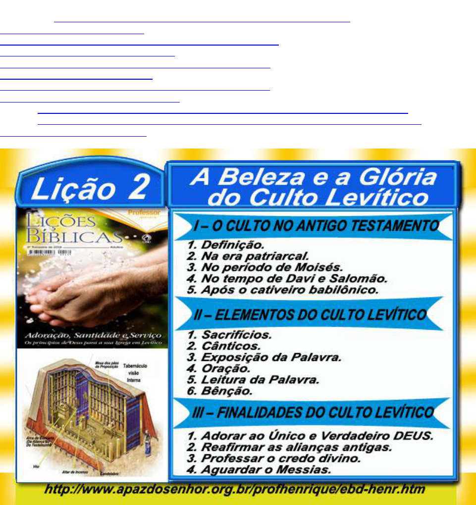 A Beleza e a Glória do Culto Levítico 3º Trimestre de 2018 - Adoração, santidade e serviço ao Senhor - Os princípios de DEUS para a Sua Igreja em Levítico Comentarista: Pr. Claudionor Correia de Andrade, conferencista e Consultor Doutrinário e Teológico da CPAD Complementos, Ilustrações e Vídeos: Pr. Luiz Henrique de Almeida Silva - 99-99152-0454. Para Ajuda http://www.apazdosenhor.org.br/profhenrique/licao8-mp-2tr11-ogenuinocultopentecostal.htm http://www.apazdosenhor.org.br/profhenrique/licao11-davi-daviearestauracaodocultoajeova.htm http://www.apazdosenhor.org.br/profhenrique/licao5-dvc-asublimidadedocultocristao.htm http://www.apazdosenhor.org.br/profhenrique/licao11-es-decenciaeordemnocultoaosenhor.htm SLIDES https://ebdnatv.blogspot.com/2018/07/slides-da-licao-2-beleza-e-gloria-do.html SLIDES https://www.slideshare.net/henriqueebdnatv/slides-licao-2-a-beleza-e-a-gloria-do-culto-levitico-3tr18-pr-henrique TEXTO ÁUREO “Entăo, entraram Moisés e Arăo na tenda da congregaçăo; depois, saíram e abençoaram o povo; e a glória do SENHOR apareceu a todo o povo.” (Lv 9.23) VERDADE PRÁTICA O verdadeiro culto divino năo se impőe pelo ritualismo nem por sua pompa, mas pelo quebrantamento de coraçăo e pela integridade de espírito. A glória de DEUS năo pode faltar. LEITURA DIÁRIA Segunda – Gn 4.4 Abel inicia o culto divino Terça – Gn 12.1-3 Abraão é chamado a cultuar Quarta – Êx 4.31 A fé conduz ao culto Quinta – Êx 12.27 A explicação do culto Sexta – Êx 10.9 A reivindicação do culto Sábado – Rm 12.1-3 Um culto perfeito LEITURA BÍBLICA EM CLASSE - Levítico 9.15-24 15 - Depois, fez chegar a oferta do povo, e tomou o bode da expiaçăo do pecado, que era pelo povo, e o degolou, e o preparou por expiaçăo do pecado, como o primeiro. 16 - Fez também chegar o holocausto e o preparou segundo o rito. 17 - E fez chegar a oferta de manjares, e a sua măo encheu dela, e a queimou sobre o altar, além do holocausto da manhă. 18 - Depois, degolou o boi e o carneiro em sacrifício pacífico, que era pelo povo; e os filhos de Arăo entregaram-lhe o sangue, que espargiu sobre o altar, em redor, 19 - como também a gordura do boi e do carneiro, e a cauda, e o que cobre a fressura, e os rins, e o redenho do fígado. 20 - E puseram a gordura sobre o peito, e ele queimou a gordura sobre o altar; 21 - mas o peito e a espádua direita Arăo moveu por oferta de movimento perante o SENHOR, como Moisés tinha ordenado. 22 - Depois, Arăo levantou as măos ao povo e o abençoou; e desceu, havendo feito a expiaçăo do pecado, e o holocausto, e a oferta pacífica. 23 - Entăo, entraram Moisés e Arăo na tenda da congregaçăo; depois, saíram e abençoaram o povo; e a glória do SENHOR apareceu a todo o povo. 24 - Porque o fogo saiu de diante do SENHOR e consumiu o holocausto e a gordura sobre o altar; o que vendo todo o povo, jubilou e caiu sobre as suas faces. OBJETIVO GERAL - Conscientizar de que o verdadeiro culto divino não se impõe pelo ritualismo, mas pelo quebrantamento de coração e pela integridade de espírito. OBJETIVOS ESPECÍFICOS Mostrar como era o culto no Antigo Testamento; Elencar os elementos do culto levítico; Explicar as finalidades do culto levítico. INTERAGINDO COM O PROFESSOR Na liçăo de hoje refletiremos a respeito do culto divino. O que é mais importante em um culto? A liturgia? Aqueles que estăo prestando um serviço a DEUS? O que realmente agrada ao Senhor? Essas săo indagaçőes importantes, que precisamos fazer se queremos adorar a DEUS da forma que Ele merece e que lhe agrada. Contudo, vocę professor(a), precisa estar atento para que năo venha fazer de suas aulas um espaço de debates teológicos inúteis. Precisamos de reflexăo, de debates que promovam a interaçăo da classe. Também precisamos ouvir mais nossos alunos, no entanto que o nosso alvo seja sempre o crescimento espiritual deles. No decorrer da aula, ressalte o cuidado que devemos ter para não caírmos no formalismo, pois DEUS não está preocupado com a forma, mas com o coração daqueles que se achegam a Ele. É necessário que aqueles que desejam cultuar ao Senhor o faça em espírito e em verdade (Jo 4.24). PONTO CENTRAL - DEUS não se agrada de um culto que se impõe pelo ritualismo. Resumo da Lição 2, A Beleza e a Glória do Culto Levítico I – O CULTO NO ANTIGO TESTAMENTO 1. Definição. 2. Na era patriarcal. 3. No período de Moisés. 4. No tempo de Davi e Salomão. 5. Após o cativeiro babilônico. II – ELEMENTOS DO CULTO LEVÍTICO 1. Sacrifícios. 2. Cânticos. 3. Exposição da Palavra. 4. Oração. 5. Leitura da Palavra. 6. Bênção. III – FINALIDADES DO CULTO LEVÍTICO 1. Adorar ao Único e Verdadeiro DEUS. 2. Reafirmar as alianças antigas. 3. Professar o credo divino. 4. Aguardar o Messias. SÍNTESE DO TÓPICO I - Levítico era o manual do culto no Antigo Testamento. SÍNTESE DO TÓPICO II - Os sacrifícios, os cânticos, a exposiçăo da Palavra e a bęnçăo eram elementos centrais do culto levítico. SÍNTESE DO TÓPICO III - As finalidades do culto Levítico eram: adorar a DEUS, reafirmar as alianças divinas, professar o credo mosaico e aguardar o Messias. RESUMO RÁPIDO DO Pr. HENRIQUE da Lição 2, A Beleza e a Glória do Culto Levítico INTRODUÇÃO Já vemos no Antigo Testamento Abel e Caim oferecendo culto a DEUS e depois Sete, com certeza aprenderam com Adão, que em minha opinião foi o primeiro a prestar culto a DEUS. Depois vemos que Enoque andou com DEUS, com certeza cultuava a DEUS e depois vemos Noé prestando culto a DEUS e Abraão e seus descendentes também. No período da Lei Moisés é ensinado sobre como oferecer um legítimo e verdadeiro culto a DEUS e isso é repassado à sua geração e às posteriores. O que é o culto divino? Basicamente é um serviço de adoração prestado a DEUS. este culto não pode ser engessado, ou formalista, ou ritualista. O culto não pode ser totalmente controlado pelo homem.