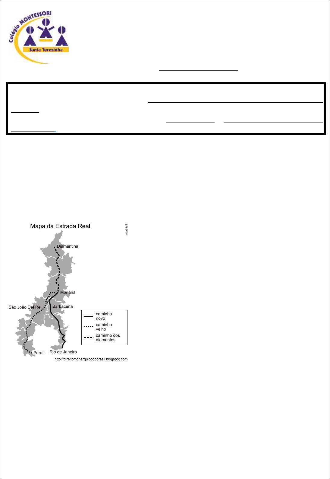 1 ATIVIDADES DE RECUPERAÇÃO PARALELA – 2º Trimestre 8º. Ano DISCIPLINA: História Observações: 1- Antes de responder às atividades, releia o material entregue sobre Sugestão de Como Estudar. 2 - Os exercícios devem ser resolvidos em folha timbrada e entregues no dia da Prova de Recuperação. Conteúdo: Unidade 8 – O Ouro no Brasil Unidade 9 – O Liberalismo contra o Pacto Colonial Unidade 10 - A família real no Brasil e a Independência Exercícios: 1) A Estrada Real, nos dias de hoje, é a reunião dos vários caminhos construídos no Brasil-Colônia, principalmente nos séculos XVII e XVIII, para o transporte das riquezas do interior para o litoral do Rio de Janeiro, de onde seguiam para a metrópole portuguesa. São 1.512 km que permitem mergulhar na história brasileira. A circulação de pessoas, mercadorias e riquezas era obrigatoriamente feita por aqueles caminhos, constituindo crime de lesa-majestade a abertura de outros não autorizados pela administração metropolitana. Adaptado de http://360graus.terra.com.br A expansão da colonização na América portuguesa, nos séculos XVII e XVIII, ocasionou o surgimento de novas atividades econômicas, de núcleos de povoamento e de caminhos e estradas, como os que compuseram a Estrada Real. 2 Cite a principal atividade econômica que condicionou o surgimento dos caminhos da Estrada Real e identifique dois interesses da Coroa portuguesa em controlar esses caminhos, no decorrer do século XVIII. 2) Onde houve escravidão, houve resistência. E de vários tipos. Mesmo sob a ameaça do chicote, o escravo negociava espaços de autonomias com os senhores ou fazia corpo mole no trabalho, quebrava ferramentas, incendiava plantações, agredia senhores e feitores. Rebelava-se individual e coletivamente. Aqui a lista é grande e conhecida. Houve, no entanto, um tipo de resistência que poderíamos caracterizar como a mais típica da escravidão – a fuga. Adaptado de: SCHIMIDT, Mário. Nova História Crítica. São Paulo: Nova Geração, 2005. p. 207. Escreva sobre a vida do escravo negro africano na região das Minas. 3) "Cada ano, vêm nas frotas quantidade de portugueses e de estrangeiros, para passarem às minas. Das cidades, vilas e recôncavos e sertões do Brasil, vão brancos, pardos e pretos, e muitos índios, de que os paulistas se servem. A mistura é de toda a condição de pessoas: homens e mulheres, moços e velhos, pobres e ricos, nobres e plebeus, seculares e clérigos, e religiosos de diversos institutos, muitos dos quais não têm no Brasil convento nem casa". (André João Antonil, "DAS PESSOAS QUE ANDAM NAS MINAS E TIRAM OURO DOS RIBEIROS", in Cultura e opulência do Brasil, 1a edição 1711) A corrida do ouro às minas brasileiras ocorrida nas primeiras décadas do século XVIII, proporcionou significativas mudanças na economia e na sociedade coloniais. Escreva sobre as principais mudanças ocorridas no Brasil com a mineração. 4) Baseando-se em seus estudos sobre Inconfidência Mineira e Conjuração Baiana, preencha o quadro abaixo: INCONFIDÊNCIA MINEIRA CONJURAÇÃO BAIANA Causas Camadas sociais envolvidas Propostas dos rebeldes Resultados 3 5) Observe a imagem e responda: Na história brasileira, a representação de Tiradentes, um dos protagonistas da Inconfidência Mineira (1788-1789), exemplifica um processo de transformação de alguns de seus personagens em heróis nacionais. Apresente duas propostas políticas da Inconfidência Mineira e justifique a transformação de Tiradentes em herói nacional. 6) Em janeiro de 1808, D. João, Príncipe Regente do Império Português, expediu a seguinte Carta Régia: “Eu, o Príncipe-Regente [...] atendendo à representação que fizestes subir à minha Real presença, [...] sou servido ordenar [...] o seguinte: Primeiro – Que sejam admissíveis nos portos do Brasil todos e quaisquer gêneros, fazendas e mercadorias, transportadas em navios estrangeiros das potências que se conservam em paz e harmonia com a minha Real Coroa [...]. Segundo – Que não só os meus vassalos, mas também os sobreditos estrangeiros possam exportar para os portos que bem lhes parecer, a benefício do comércio e agricultura, que tanto desejo promover, todos e quaisquer gêneros e produções coloniais [...]. O que tudo assim fareis executar com o zelo e atividade que de vós espero.” (Adaptado de Coleção das Leis do Brasil – 1808.) Com base nesse documento e nos conhecimentos históricos, escreva um texto abordando as consequências dessas determinações de D. João sobre o pacto colonial. 4 7) "Houve muita confusão no embarque, e a viagem não foi fácil. Uma tempestade dividiu a frota; os navios estavam superlotados, daí resultando falta de comida e água; a troca de roupa foi improvisada com cobertas e lençóis fornecidos pela marinha inglesa; para completar, o ataque dos piolhos obrigou as mulheres a raspar o cabelo. Mas esses aspectos novelescos não podem ocultar o fato de que, a partir da vinda da família real para o Brasil, transformou as relações Brasil-Portugal, gerando uma reviravolta”. (FAUSTO, Boris. HISTÓRIA DO BRASIL. 2 ed. São Paulo: Edusp, 1995.p.120) Com relação ao evento relatado no texto e a caricatura acima, responda às questões abaixo. a) Por que a Família Real portuguesa resolveu abandonar Portugal e vir para o Brasil? b) Cite duas medidas adotadas pelo governo português no Brasil e que podem ser associadas à "reviravolta" assinalada pelo autor. c) Escreva sobre o processo de independência do Brasil, destacando o retorno de D. João VI à Portugal e as exigências das Cortes em Lisboa.