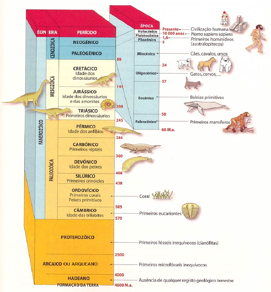 Escala de Tempo Geológico da Terra Evidências de datação radiométrica indica que a Terra é de cerca de 4,570 bilhões de anos. O tempo geológico ou profunda do passado da Terra foi organizada em várias unidades de acordo com os eventos que ocorreram em cada período. Diferentes períodos de tempo na escala de tempo são geralmente delimitados por grandes eventos geológicos ou paleontológicos, tais como extinções em massa. A escala do tempo geológico é um esquema cronológico (ou modelo idealizado) relativo estratigrafia de tempo que é usado por geólogos, paleontólogos e outros cientistas da terra para descrever o momento e as relações entre os eventos que ocorreram durante a história da Terra. Quadro base para esse estudo da Escala Geológica do Tempo quanto às formas de vida. A história da terra é descrita em tempo geológico, o qual é medido em milhões e bilhões de anos. O tempo geológico é dividido em várias partes com duração diferentes e as divisões usadas são: Época é uma divisão de um período geológico. Ela é a menor divisão de tempo geológico, durando vários milhões de anos. Período: Dezenas de milhões de anos. Na divisão do tempo geológico, uma Era compreende períodos geológicos e estes se subdividem em épocas geológicas. Era: Várias centenas de milhões de anos. Compreende períodos geológicos. Dois ou mais períodos geológicos formam uma Era. Éon: Metade de um bilhão de anos ou mais. Duas ou mais eras geológicas formam um Éon, a qual é a maior divisão de tempo geológico. As nomenclaturas brasileiras mais utilizadas que encontrei nessa pesquisa foram: Para Éons: Hadeano, Arqueano ou Arcaico, Proterozoico e Fanerozoico; Para Eras, contidas apenas no Éon Fanerozoico: Paleozoica, Mesozoica e Cenozoica; Para Períodos, de cada uma das eras do Fanerozoico foram: Cambriano ou Câmbrico, Ordoviciano ou Ordovícico, Siluriano ou Silúrico, Devoniano ou Devônico, Carbonífero ou Carbônico, Pérmico, Triássico, Jurássico, Cretáceo ou Cretácico, Paleogênico e Neogênico (Antes denominados respectivamente de Terciário e Quartenário). E por fim as Épocas, que são subdivisões existentes apenas para os períodos da Era do Cenozoico: Períodos Paleogênico e Neogênico (Antes chamados, Períodos Terciário e Quartenário) São as Épocas dos Períodos Paleogênico e Neogênico: Paleoceno, Eoceno, Oligoceno, Mioceno, Plioceno, Pleistoceno e Holoceno. Essa divisão mais comum, fica claro nessa tabela simplificada: Cada um desses nomes tem um significado que define em sua própria formação etimológica e que traz em sua essência algum tipo de característica fundamental àquele referido período. Em geral, tais nomenclaturas, correspondem às características físico-químicas das rochas e fósseis encontrados em dada região do planeta Terra. Os Éons A escala do tempo geológico Éon Hadeano do grego hades, que significa inferno, inicia-se com a formação da Terra a partir da poeira e gás que orbitava no Sol há aproximadamente 4,7 bilhões de anos. Ao consolidar-se, a superfície do planeta transformou-se em uma visão do inferno: um oceano de rochas em ebulição e enxofre líquido. Enormes crateras, resultantes do intenso bombardeio de asteroides e das explosões vulcânicas, completavam a paisagem. Com o tempo, formou-se uma atmosfera quente, densa e carregada de poeira e cinzas, sendo composta principalmente de nitrogênio, amônia, hidrogênio, monóxido de carbono, metano e vapor de água, oriundos dos vulcões. Qualquer rocha que conseguisse resfriar e tomar forma, era imediatamente soterrada por novo fluxo de lava ou explodia em pedaços atingida por outro asteroide. Éon Arqueano do grego, archaios que quer dizer, antigo, durou de 4 Bilhões de anos a aproximadamente 2,5 Bilhões de anos. A Terra estava se diferenciando em núcleo/ manto/ crosta. Organismos unicelulares estão presentes. Dá-se o aparecimento da vida. No entanto, os seres vivos são ainda pequenas células muito simples, procarióticas. Já no Éon Proterozoico do grego protero = anterior/em formação/escondido; zoe= vida], de 2,5 Bilhões de Anos a 650 Milhões de Anos , a estrutura da Terra já estava formada. Com uma quantidade de Oxigênio muito muito baixa. Vida unicelular abundante, com formas mais avançadas de vida apenas no final do Éon. Os seres vivos tornam-se um pouco mais complexos. Aparecem as primeiras células eucarióticas (isto é, com um núcleo bem definido) e os primeiros seres pluricelulares, mas ainda muito simples. O hiato desses bilhões de anos entre o éon Hadeano e o Fanerozoico também é chamado de Período Pré-cambriano. E o Éon Fanerozoico , Zoe = vida; Fane = visível de 550 Milhões de anos até os dias atuais, a vida evolui significativamente. Os seres vivos tornam-se cada vez mais complexos até aquilo que são hoje. O Éon Fanerozoico é dividido em 3 eras distintas: Era Paleozoica (Zoe=vida Paleo=antiga) 550 Milhões de Anos a aproximadamente 245 Milhões de Anos. Dividida em seis períodos, um começa onde outro termina: Cambriano do Latim Cambria, o nome do País de Gales, onde inicialmente foram encontrados fósseis dessa época. 550 milhões de anos, extensos mares invadindo os continentes existentes. Origem de vários filos e classes de invertebrados. Primeiros cordados. Moluscos com conchas. Abundância de trilobitas. Ordoviciano do Latim Ordo = Ordem; Vici = Rua, é nome das região dos Ordovices, tribos Celtas. 510 milhões de anos atrás. Primeiros vertebrados (peixes sem maxila). Invertebrados marinhos em abundância. Primeiras plantas terrestres Siluriano também derivado da região dos Silures, tribos Celtas do País de Gales, onde as rochas desse período foram estudadas pela primeira vez. Tempo há 438 milhões de anos, clima ameno. Topografia em geral plana. Primeiros peixes com maxilares. Primeiros invertebrados terrestres. Devoniano, origem das rochas de Devonshire na Inglaterra, i