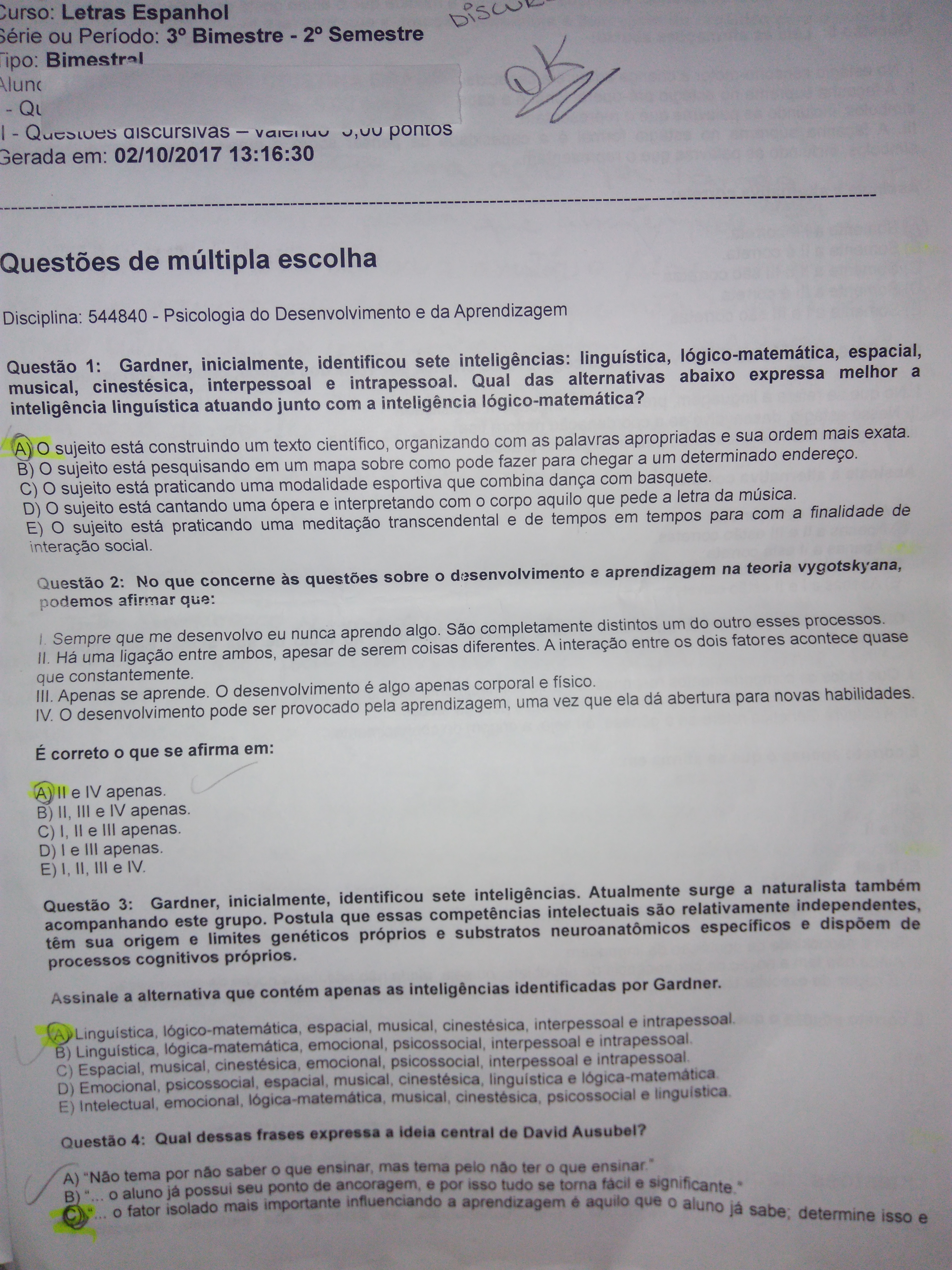 No que concerne as questoes sobre desenvolvimento e aprendizagem na teoria vygotskyana, podemos afirmar que: A interacao entre OS dois fatores acontece quase que constantemente. I. Sempre que me desenvolvo eu nunca aprendo algo. sao completamente distintos um do outro esses processos. II. Ha uma ligacao entre ambos, apesar de serem coisas diferentes. III. Apenas se aprende. O desenvolvimento algo apenas corporal e fisico. IV. O desenvolvimento pode ser provocado pela aprendizagem uma que ela da abertura para novas habilidades. A) e IV apenas. B) II, III e IV apenas. C) e III apenas. D) e III apenas. E) 1, II, III e IV.