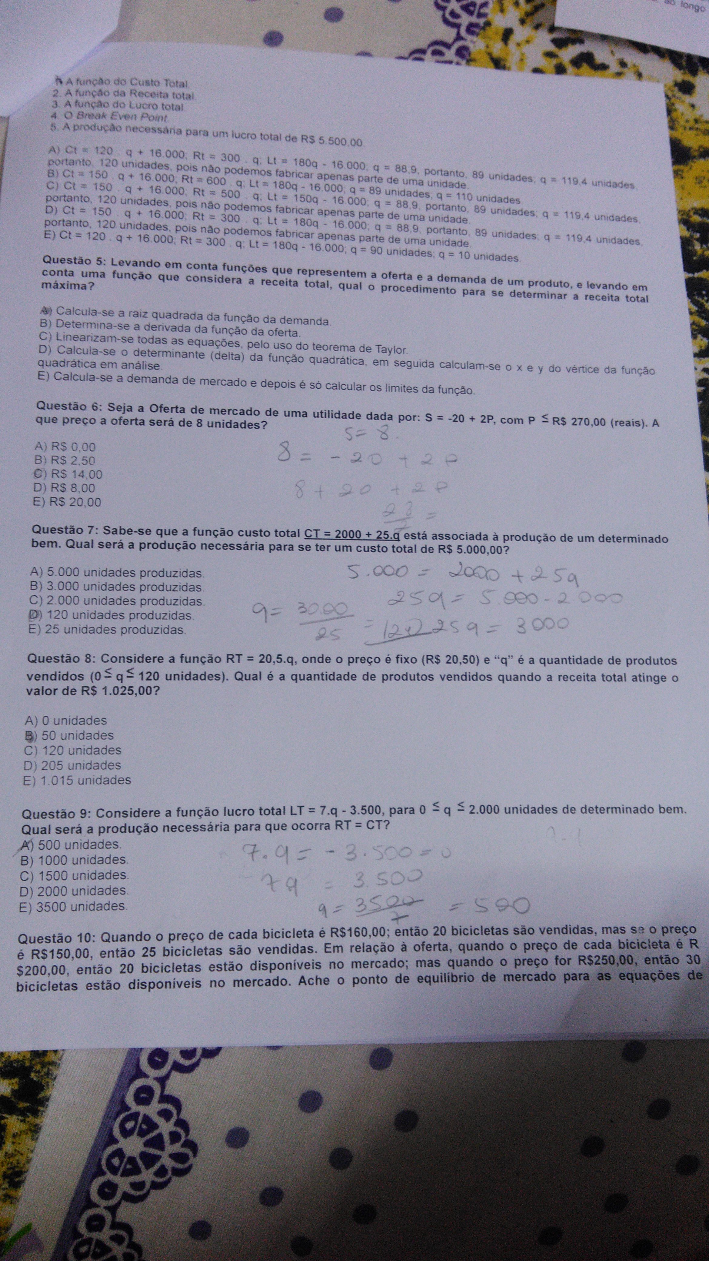 Qual é a quantidade de produtos quando a receita total de produtos atinge valor de 1.025,00? A) 0 unidades B) 50 unidades C) 120 unidades D) 205 unidades E) 1.015 unidades