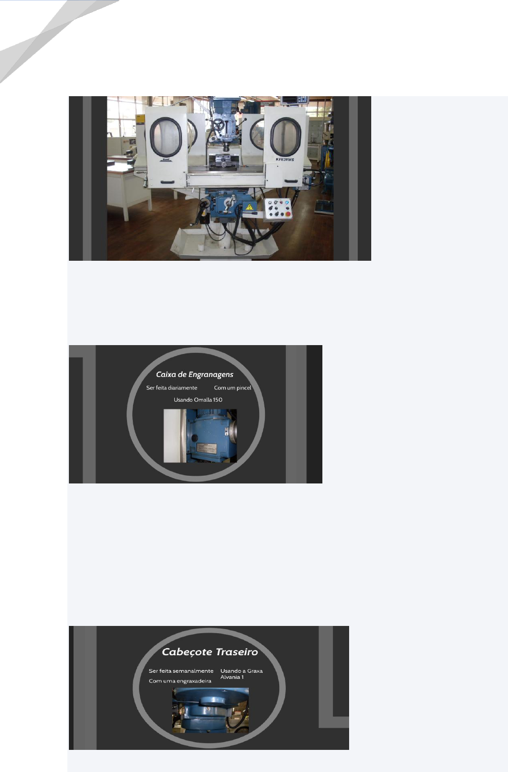 2 PLANO DE LUBRIFICAÇÃO FRESADORA FERRAMENTEIRA Caixa de Engrenagens Com uma engraxadeira Com um pincel Omalla 150 Cabeçote Traseiro Ser feita mensalmente Lubrificante Graxa Alvania 2 Com um pincel Usando Omalla 150 Engrenagens Com um pincel Lubrificante de graxa Alvania 2 Reservatório Ser feita semanalmente Através da verificação do nível Ser feita diariamente Usando a Graxa Alvania 1 FICHA DE INSPEÇÃO Inspeção de segurança Inspecione a fresadora no mínimo uma vez por turno. Informe imediatamente a pessoa responsável sobre quaisquer danos, defeitos ou mudanças na função de operação. Verifique todos os dispositivos de segurança - no início de cada turno (em operação contínua), - uma vez por semana (com a máquina em operação), - após cada serviço de manutenção e reparo. Verifique se as sinalizações e etiquetas de proibição, advertência e informações na fresadora - estão legíveis (limpe-as, se necessário) e - completas INFORMAÇÕES Use a tabela abaixo para organizar as inspeções. Inspeção e manutenção O tipo e a extensão do desgaste dependem em larga escala do uso individual e das condições de serviço. Por este motivo, todos os intervalos são válidos somente para as condições operacionais planejadas.