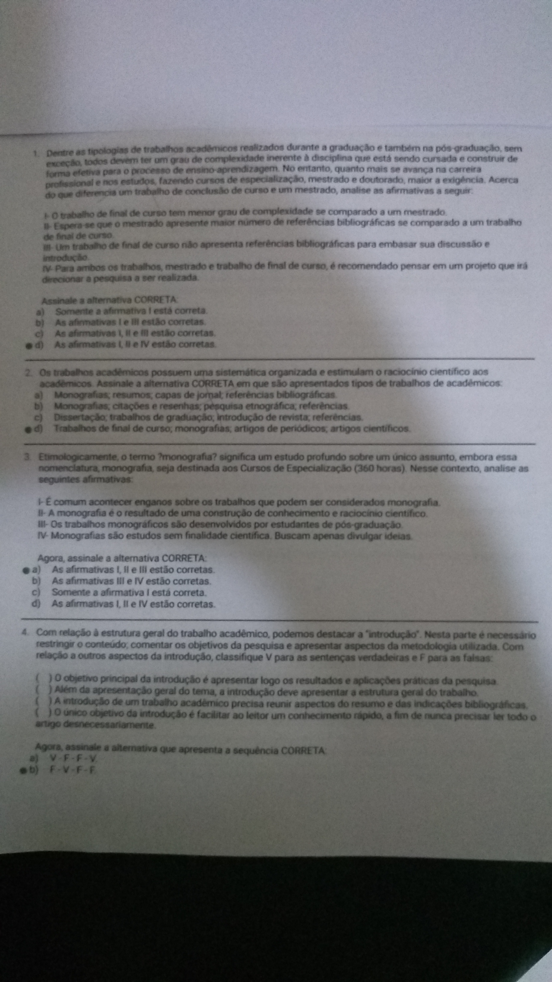 Quanto mais avança a carreira profissional e os estudos, fazendo especialização, mestrado e doutorado, maior a exigência acerca do diferencial entre trabalho de conclusão de mestrado e trabalho de final de curso. Analise as afirmativas sobre o trabalho de conclusão de mestrado e o trabalho de final de curso e assinale a alternativa CORRETA. I. O trabalho de final de curso tem menor grau de complexidade se comparado ao mestrado. II. Espera-se que o mestrado apresente maior número de referências bibliográficas se comparado ao trabalho de final de curso. III. Um trabalho de final de curso apresenta referências bibliográficas para embasar a discussão. IV. Para ambos os trabalhos, mestrado e trabalho de final de curso, é recomendado pensar em um projeto que direcione a pesquisa a ser realizada. a) Somente a afirmativa I está correta. b) As afirmativas I e II estão corretas. c) As afirmativas III e IV estão corretas. d) As afirmativas I e IV estão corretas.