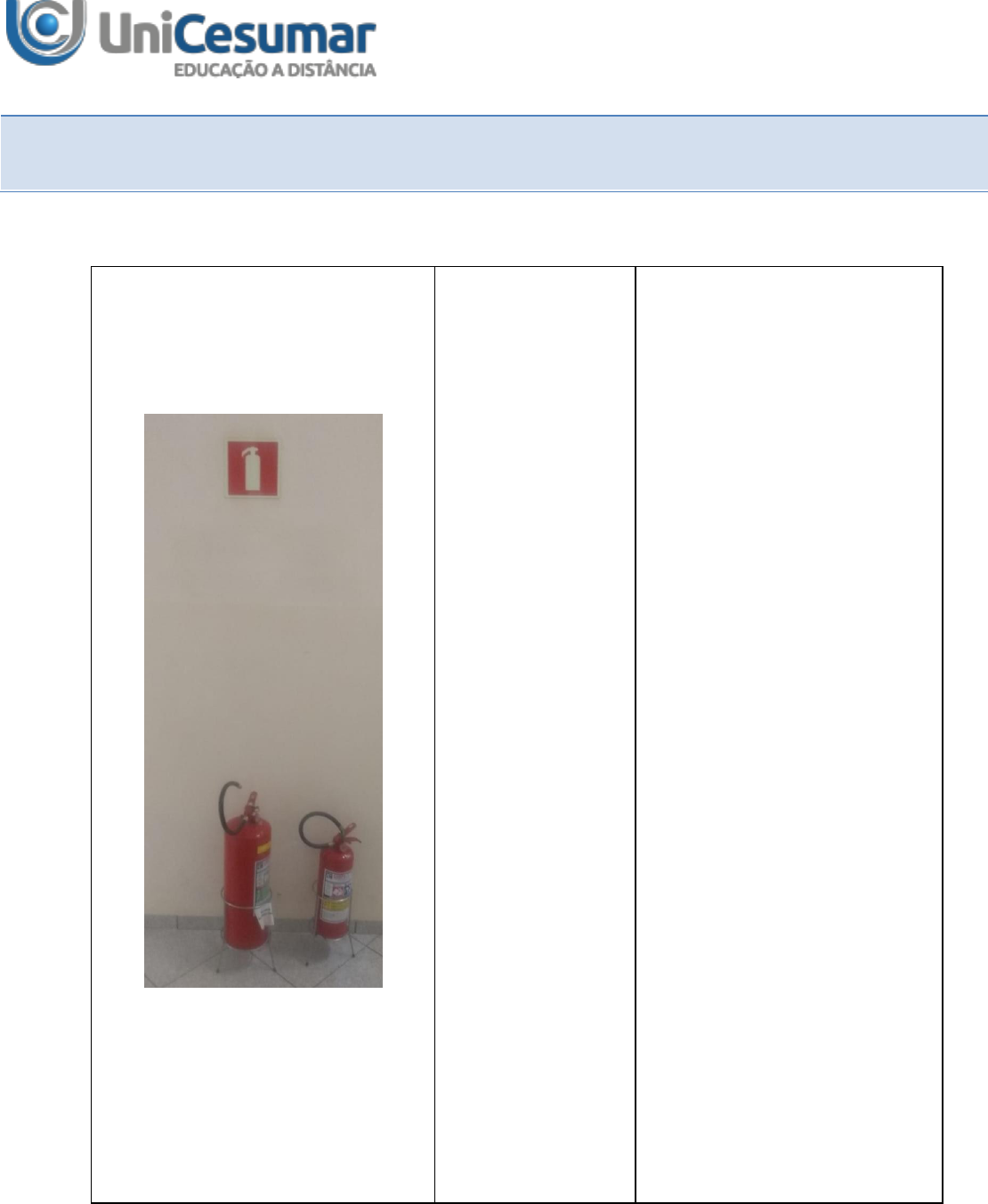 M.A.P.A. Material de Avaliação Prática da Aprendizagem. Curso: Gestão Hospitalar Disciplina: Biossegurança Símbolo 01 – Extintor de Incêndio Descrição e Registro Tipo de Sinal Sinal de controle a incêndio Aplicação Segundo o material didático e em conformidade com a norma, esse sinal tem como objetivo indicar a localização de tipos de equipamentos de combate a incêndios e alarmes disponíveis no local. No caso deste sinal indica a localização de extintores de incêndio. As características dos sinais de controle a incêndio devem ser: Forma: quadrada ou retangular. Cor de fundo (cor de segurança): vermelha. Cor do símbolo (cor de contraste): fotoluminescente. Margem (opcional): fotoluminescente. A sinalização indicada atende as características quanto à forma, segundo a Norma técnica 20/2014. M.A.P.A. Material de Avaliação Prática da Aprendizagem. Símbolo 02 – Saída de emergência Descrição e Registro Tipo de Sinal Sinal de orientação e salvamento Aplicação Segundo o material didático e em conformidade com a norma, esse sinal visa em caso de perigo, indicar as saídas de emergência, o caminho para o posto de socorro ou local em que existem dispositivos de salvamento. No caso deste sinal indica saída de emergência com ou sem complementação do pictograma fotoluminescente (seta ou imagem, ou ambos). As características dos sinais de proibição devem ser: Forma: quadrada ou retangular. Cor do fundo (cor de segurança): verde. Cor do símbolo (cor de contraste): fotoluminescente. Margem (opcional): fotoluminescente. A sinalização indicada atende as características quanto à forma, segundo a Norma técnica 20/2014. M.A.P.A. Material de Avaliação Prática da Aprendizagem. Referências bibliográficas: PALUDO, Michele Putti; MATEUS, Gustavo Affonso Pisano. Biossegurança. Maringá: UniCesumar, 2018. [Unidade 3, p. 123-134].