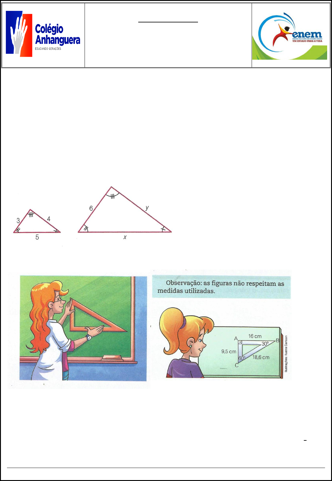 Colégio Anhanguera – Educando gerações 1 Antes de iniciar a lista de exercícios leia atentamente as seguintes orientações: É fundamental a apresentação de uma lista legível, limpa e organizada. Rasuras podem invalidar a lista. Questões discursivas deverão ser respondidas na própria lista. Não há necessidade de folhas em anexo, todas as respostas serão exclusivamente na lista. O não atendimento a algum desses itens faculta ao professor o direito de desconsiderar a lista. A lista deve ser feita a caneta, somente os cálculos podem ser a lápis. Capítulo (s) do livro trabalhado (s): Cap. 8 Data de entrega e prova: 26 /03 /2019. _______________________________________________________________________________________ 1) Determine x e y, sabendo que os triângulos são semelhantes 2) O esquadro que a professora usa no quadro é uma ampliação do esquadro da Vera na razão 3. a) Determine a medida dos três ângulos do esquadro da professora. b) Determine a medida dos três lados do esquadro da professora. c) Determine a medida dos três lados de um esquadro semelhante ao de Vera em que a razão seja 3 2 . Lista de exercícios Aluno (a): __________________________________ Turma: 9° ano Professor: Alex Disciplina: Matemática No Anhanguera você é + Enem Colégio Anhanguera – Educando gerações 2 3) Determine x e y, sabendo que os triângulos são semelhantes. 4) Se os ângulos com “ marcas iguais ” são congruentes, determine x. a) b) 5) Na figura, temos DE // BC. a) Qual é o valor de x? b) Qual é o valor de y? c) Qual é o perímetro do ABC? d) Qual o perímetro do ADE? e) Qual o perímetro do trapézio DBCE? 6) Calcule a medida y e, em seguida, calcule o perímetro do triângulo ABC Colégio Anhanguera – Educando gerações 3 7) Determine a medida de x na figura abaixo, sabendo que: 8) Determine o valor de x na figura a seguir. 9) Os triângulos BCD e EFG são semelhantes e as medidas são dadas em centímetros. Determine a medida do lado EF. 10) Observe a figura e calcule a medida da figura desconhecida. Dado AB // CD. Colégio Anhanguera – Educando gerações 4 11) Sabendo que os ângulos destacados são congruentes, determine a medida x na figura abaixo. 12) Baseando- se em cada figura e nos dados referentes a elas, calcule a medida desconhecida de cada triângulo. a) Dado: AB // CD b) 13) Baseando- se na figura e nos dados referentes a ela, calcule a medida desconhecida do triângulo. 14) No pátio de uma escola, a professora de matemática pediu que Júlio, que mede 1,60m de altura, se colocasse em pé, próximo de uma estaca vertical. Em seguida, a professora pediu a seus alunos que medissem a sombra de Júlio e a da estaca. Os alunos encontraram as medidas de 2m e 5m, respectivamente, conforme ilustraram as figuras abaixo. A altura da estaca média: a) 3,6 m. c) 5 m. b) 4 m. d) 8,6 m. Colégio Anhanguera – Educando gerações 5 15) Observe esses dois triângulos. As medidas de seus lados estão registradas numericamente. Os ângulos com símbolos iguais mostram que possuem medidas congruentes. Sendo assim, assinale a opção que contém a afirmativa correta: a) Os triângulos não são semelhantes, porque não são equiláteros. b) Os triângulos não são semelhantes, porque, apesar de seus lados correspondentes serem proporcionais, seus ângulos correspondentes têm medidas diferentes. c ) Os triângulos não são semelhantes, porque somente seus ângulos correspondentes são congruentes. d) Os triângulos são semelhantes, porque seus ângulos correspondentes são congruentes e seus lados correspondentes são proporcionais. 16) (UFRN) Considerando- se as informações constantes no triângulo PQR, pode- se concluir que a altura PR desse triângulo mede: a) 5 b) 6 c) 7 d) 8 17) (UNIMEP - MG) O valor de x na figura ao lado é: a) 7,2 cm b) 1,25 cm c) 20 cm d) 1,5 cm e) nenhuma das anteriores 18) ( ULBRA) O valor da área do quadrado inscrito no triângulo retângulo do desenho é: a) 6 b) 15 c) 25 d) 36 e) 64 Colégio Anhanguera – Educando gerações 6 19) Observe a paisagem e calcule a altura da árvore. 20) O professor de Matemática passou este trabalho para os seus queridos alunos do 9° ano: medir a altura da escola, sem subir no telhado. Para isso, nós medimos: a altura de nossa colega Karen, obtendo 1,50m; o comprimento da sombra de Karen, obtendo 1,80m; a sombra do prédio da escola, obtendo 12m; Com essas medidas, calculamos a altura da escola. Qual é essa altura?