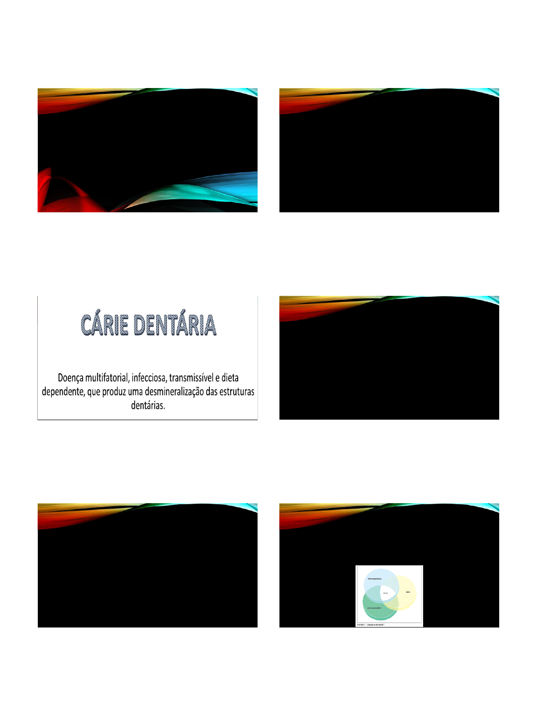26/09/2019 1 PRINCÍPIOS DE CARIOLOGIA Disciplina: Práticas Pré-Clínicas Turma: 4º Período Docente: Héllen Siqueira Cárie Dentária? CÁRIE DENTÁRIA • A cárie dentária é uma doença infecciosa que progride de forma muito lenta na maioria dos indivíduos, raramente é autolimitante e, na ausência de tratamento, progride até destruir totalmente a estrutura dentária (FEJERSKOV; KIDD, 2005) • Problemas mais prevalentes em saúde bucal; • Causa comum de morbidade; • 20 milhões de edêntulos no Brasil; CÁRIE DENTÁRIA • Microorganismo (Fator etiológico) como sendo o principal agente causal da doença • 1890 – Teoria Químico-Parasitária - Todas as bactérias seriam capazes de contribuir para o taque ácido sobre o esmalte dentária - Metabolismo dos carboidratos pelas bactérias com a geração de ácidos seria o processo central de desmineralização dentária • 1950 – cresce o conceito da cárie dentária como doença infecciosa e transmissível • 1960 – Tríade de Keyes - Etiologia da cárie pela intersecção de três fatores primários: hospedeiro susceptível, microbiota e substrato cariogênico (dieta) CÁRIE DENTÁRIA • 1960 – Tríade de Keyes - Etiologia da cárie pela intersecção de três fatores primários: hospedeiro susceptível, microbiota e substrato cariogênico (dieta) 26/09/2019 2 CÁRIE DENTÁRIA • 1980 – Tríade de Keyes Modificada (Newbrum) - Modificada a partir da inserção de um quarto círculo representativo do tempo. MODELOS SOCIAIS • Determinantes Sociais = Condições sociais em que os indivíduos vivem e trabalham • Fatores sociais • Culturais • Econômicos • Étnicos/Raciais Influenciam no desencadeamento dos • Psicológicos problemas de saúde e nos fatores de risco • Comportamentais populacional Cárie Dentária = Doença multifatorial Fatores Necessários Fatores determinantes Fatores Moduladores Biofilme Negativo: açúcares Positivo: exposição a fluoretos Biológicos: saliva Sociais: contexto socioecômico 26/09/2019 3 Streptoccocus Mutans • Principal agente etiológico da cárie; • Acidogênicos e Acidúricos; • Capacidade de colonizar superfícies dentárias; • Produzem polissacarídeos extracelulares a partir da sacarose; (favorece a formação de biofilme espesso) • Fermentadores de grande quantidade de carboidratos; • Ácido lático Lactobacillus • Papel mais importante na progressão do que na instalação; • Capacidade acidogênica e acidúrica; • Frequência predominante em áreas profundas de cárie de dentina; • Não se aderem a surpefícies lisas; • Invasores secundários em algumas lesões de cárie; • Consumo frequente e alto de sacarose. 26/09/2019 4 SALIVA • Funções Limpeza Lubrificação do bolo alimentar Remoção de carboidratos insolúveis Ação antimicrobiana Remineralizante Ação tamponante HALITOSE MATINAL • Fluxo salivar diminuído • Aumento da concentração de compostos sulforados voláteis • Compostos contém enxofre PROPRIEDADE REMINERALIZANTE • Íons cálcio e fosfato saturados na saliva • Além de a saliva evitar a dissolução, tem a tendência de repor (remineralizar) • Quando há fluoretos Formação de fluorapatita 26/09/2019 5 FÚOR • Ação de uso tópico; • Diminui o pH crítico para 4,5; • Formação de fluorapatita; TOXIDADE DO FLÚOR • Toxidade = quantidade de substancia que se caracteriza como nociva para um organismo vivo ou parte específica desse organismo Segundo a OMS o consumo ideal preconizado é de 0,05 a 0,07mg/kg por dia de flúor • Níveis de toxidade DCL (dose certamente letal): 32 a 64 mgF/kg DST (dose seguramente tolerada): 8 a 16 mgF/kg DPT (dose provavelmente tóxica): 5 mgF/kg TOXIDADE DO FLÚOR • Toxicidade Crônica mais comum Ingestão de pequenas quantidades diárias Afeta tecidos mineralizados, particularmente o osso e o esmalte • Toxicidade Aguda Rara Ingestão de uma grande de flúor de uma única vez TOXIDADE DO FLÚOR Tratamento de emergência para diferentes níveis de ingestão excessiva de flúor • Até 4 mgF/kg – sintomas gastrointestinais – leite ou outros derivados com cálcio, pode induzir o vômito • De 5 a 15 mgF/kg – hospitalização, lavagem gástrica, monitorização cardíaca, intubação, exame sanguíneo, infusão de gluconato de cálcio FLUOROSE O que é Fluorose? Alteração devido a ingestão excessiva de flúor durante a formação dos dentes – Hipomineralização 26/09/2019 6 LESÕES CARIOSAS Biofilme é pré-requisito para o processo carioso!!! 1. Película adquirida 2. Biofilme dental 3. “Amadurecimento” do biofilme 4. Cárie dentária CLASSIFICAÇÃO/TERMINOLOGIA • Localização anatômica • Cárie Primária, Recorrente ou Secundária • Lesão cavitada ou Não cavitada • Lesões ativas ou Inativas • Lesões remineralizadas e crônicas • Cárie Rampante • Cárie oculta • Cárie Residual • Evolução LOCALIZAÇÃO ANATÔMICA CLASSE I 26/09/2019 7 CLASSE II CLASSE III CLASSE IV CLASSE V CÁRIE PRIMÁRIA, RECORRENTE OU SECUNDÁRIA Cárie primária Cárie secundária LESÃO CAVITADA OU NÃO CAVITADA 26/09/2019 8 LESÕES ATIVAS OU INATIVAS LESÕES ATIVAS OU INATIVAS LESÕES ATIVAS OU INATIVAS LESÕES REMINERALIZADAS E CRÔNICAS CÁRIE RAMPANTE Diversas lesões ativas encontradas num mesmo paciente Frequentemente envolve superfícies dentárias que em geral não sofrem cárie Classificação de acordo com a causa: • Cárie de mamadeira • Cárie precoce infantil • Cárie após radiação • Cárie medicamentosa 26/09/2019 9 CÁRIE OCULTA • Lesão da dentina que não são detectadas no exame visual, mas são amplas e desmineralizadas o bastante para serem detectadas radiograficamente CÁRIE RESIDUAL • Tecido desmineralizado que foi deixado antes da restauração ser colocada de forma intencional ou inadvertida pelo clínico • Difícil identificar apenas radiograficamente 26/09/2019 10