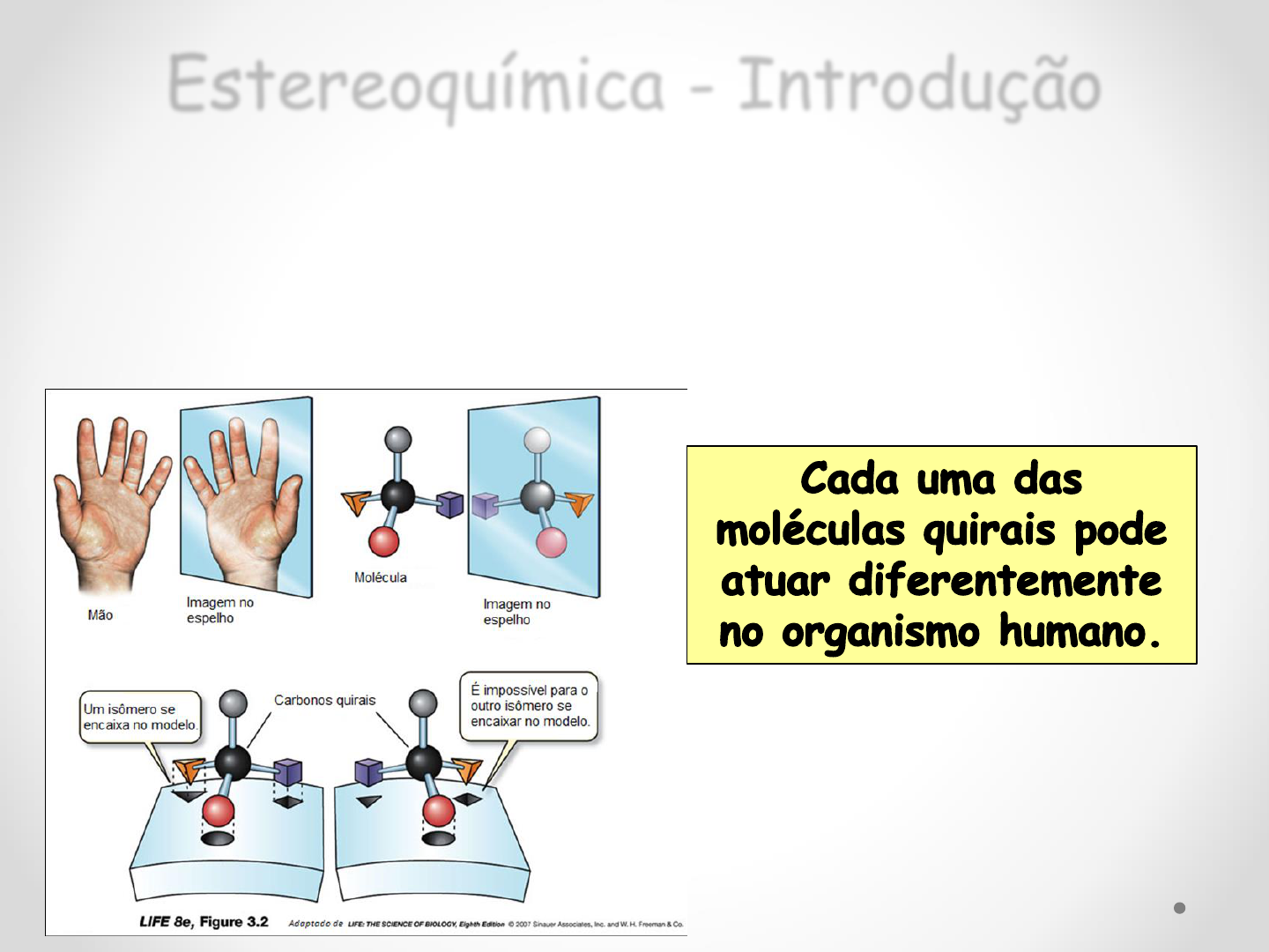 Estereoquímica - Introdução 1 Quiralidade QUIRAL = Cheir (grego) = Mão Moléculas quirais: Suas imagens especulares não são sobreponíveis em três dimensões. Discriminação de Enantiômeros por Moléculas Biológicas Estereoquímica - Introdução Exemplos de moléculas quirais Isomerismo 1. Isômeros Constitucionais e Estereoisômeros Isômeros são compostos diferentes que têm a mesma fórmula molecular. Isômeros Constitucionais: Conectividade Diferente (átomos conectados em uma ordem diferente). Exemplos: Fórmula Molecular: C3H8O C3H7Cl 1-cloropropano e 2-cloropropano 1. Isômeros Constitucionais 1.1 De Função A diferença entre os isômeros está no grupo funcional. Exemplo (C3H6O) 1. Isômeros Constitucionais 1.2 De Cadeia A diferença entre os isômeros está no tipo de cadeia carbônica (mesma função, cadeias diferentes). Exemplo (C3H6) 1. Isômeros Constitucionais 1.3 De Posição A diferença entre os isômeros está na posição do grupo funcional ou da posição da insaturação. Exemplo (C3H8O) (diferente posição do grupo funcional) 1. Isômeros Constitucionais Exemplo (C4H8) (diferente posição da insaturação). Caso particular da isomeria de posição. Ocorre quando os isômeros diferem pela posição de um heteroátomo na cadeia carbônica. Éter Éster C4H10O C3H6O2 Etóxi Etano Metóxi Propano Metanoato de Etila Etanoato de Metila Outros exemplos de metameria são entre as aminas ou entre as amidas comuns e substituídas. 1. Isômeros Constitucionais 1.4 Metameria (Isomeria de Compensação) Caso particular de isomeria funcional em que os dois isômeros ficam em equilíbrio químico dinâmico. Os casos mais comuns de tautomeria ocorrem entre: aldeído e enol cetona e enol Exemplos: 1. Isômeros Constitucionais 1.5 Tautomeria (Isomeria Dinâmica) 2. ESTEREOISÔMEROS Não são isômeros constitucionais. São moléculas que apresentam a mesma fórmula molecular, mas arranjo espacial diferentes. Exemplo: Isômeros cis e trans de alcenos são estereoisômeros. São divididos em: ENANTIÔMEROS E DIASTEREOISÔMEROS. Enantiômeros: as moléculas são imagens especulares não sobreponíveis. Diasteroisômeros: as moléculas não são imagens especulares. 2. ESTEREOISÔMEROS 2. ESTEREOISÔMEROS - Diastereoisômeros São isômeros porque tem a mesma fórmula molecular, mas são diferentes. Não podem ser interconvertidos devido à grande barreira da rotação da dupla ligação carbono-carbono. Diferem apenas no arranjo de seus átomos no espaço. Cis-1,2-dimetilciclopentano (C7H14) Trans-1,2-dimetilciclopentano (C7H14) cis-but-2-eno trans-but-2-eno 2. ESTEREOISÔMEROS Exemplos de Diastereômeros Enantiômeros ocorrem apenas em moléculas quirais. Molécula quiral: não é superponível à sua imagem especular. A molécula quiral e sua imagem especular são enântiômeros. 2.1 Enantiômeros Como identificar uma molécula quiral? As moléculas quirais mais simples tem pelo menos um átomo de carbono assimétrico, isto é, um átomo de carbono ligado à 4 grupos (substituintes) diferentes. Átomo de carbono tetraédrico que tem 4 átomos ou grupos diferentes: CENTRO DE QUIRALIDADE (IUPAC, 1996). Termos anteriores: centro assimétrico, centro quiral, centro estereogênico e estereocentro). 2.1 Enantiômeros Exemplo de Carbono assimétrico (quiral). 2.1 Enantiômeros Os carbonos que fazem parte de uma ligação dupla ou tripla não podem ser centros de quiralidade. Ácido lático (a) A molécula de CH2ClBr (bromoclorometano) e seu espelho. Imagem sobreponível. É aquiral. (b) Molécula de CHFClBr. Imagem não sobreponível. É quiral. 2.1 Enantiômeros Exercícios: 2.1 Enantiômeros – Centro de Quiralidade Ácido lático 2.1 Enantiômeros - Exemplos Aspartame 2.1 Enantiômeros - Exemplos O enantiomerismo geralmente ocorre em: Moléculas que apresentam apenas um carbono tetraédrico estereogênico (moléculas com mais de um carbono tetraédrico estereogênico podem ou não ser quirais – depende do caso); Moléculas que NÃO apresentam plano de simetria – plano que corta a molécula de tal modo que uma das metades seja a imagem da outra. SUBDIVISÃO DOS ISÔMEROS ISÔMEROS Compostos diferentes com a mesma fórmula molecular ESTEREOISÔMEROS Isômeros que tem a mesma conectividade, mas diferem no arranjo de seus átomos no espaço ISÔMEROS CONSTITUCIONAIS Isômeros cujos átomos tem conectividades diferentes ENANTIÔMEROS (C quiral) Estereoisômeros que são imagens especulares um do outro, que não se superpõem. DIASTEREÔMEROS (cis-trans) Estereoisômeros que não são imagens especulares um do outro 2.1 Enantiômeros – Nomenclatura – Sistema (R-S) Os prefixos R e S especificam a configuração absoluta das moléculas quirais, ou seja, a descrição exata do arranjo dos átomos no espaço. Ex. 2 enantiômeros do 2-butanol (R) e (S) vêm das palavras latinas rectus (direito) e sinister (esquerdo). O Carbono Tetraédrico O átomo de carbono ocupa o centro de um tetraedro regular imaginário e dirige suas valências para os quatro vértices desse tetraedro. 2.1 Enantiômeros – Nomenclatura – Sistema (R-S) Configuração Absoluta – R/S - Regras de Cahn-Ingold-Prelog 1. A cada grupo ligado ao estereocentro atribui-se uma prioridade. A ordem de prioridade é de acordo com o número atômico: o átomo de maior número atômico tem maior prioridade. 2. Desenhar a molécula posicionando dois grupos no plano do papel e projetando-se um grupo para frente e outro para trás. Coloca-se o grupo de menor prioridade para trás e o de maior prioridade para frente. 3. Traçar o caminho do grupo de maior prioridade para o de menor prioridade (ordem decrescente). Se o sentido for horário o enantiômero é chamado de R (rectus – direito), se for anti-horário é S (sinister – esquerdo). 2.1 Enantiômeros – Nomenclatura – Sistema (R-S) Como determinar a ordem de prioridade: 1. Verificar o número atômico de cada átomo ligado ao estereocentro: quanto maior o 