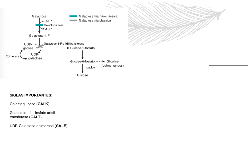 BCM-2 03/09/2019 METABOLISMO DA GALACTOSE A galactose encontra-se principalmente pela fosforilação a galactos-1-P e conversão a UDP-galactose e glicose-1-P. A fosforilação da galactose é realizada por uma quinase específica, a galactoquinase. A formação de UDP-galactose é conseguida por ataque de oxigênio do fosfato da galactose-1-P sobre o fosfato a da UDP-glicose, liberando glicose-1-P enquanto forma UDP-galactose. A enzima que catalisa essa reação é a galactose-1-P-uridililtransferase. A UDP- galactose é convertida a UDP-glicose pela UDP-glicose-epimerase reversível. O resultado total dessa sequência ade reações é que a galactose é convertida a glicose-1-P, às custas de uma ligação de ATP tica em energia. O transportador responsável pela absorção de galactose nos eritrócitos será a SGLT. Já a transportadora galactose atinge a circulação (saída) será pelo GLUT2. A principal diferença entre Glicose e Galactose é que elas são estereoisômeros, seus atomos estão ligados na mesma ordem porem tridimensionalmente diferentes A glicose promove a secreção de insulina. Para gerar ATP, a galactoe será empregada na célula UDP-Galactose: Unadina Difosfato CASO CLÍNICO – GALACTOSEMIA Um recém-nascido aparentemente normal começou a vomitar e teve diarreia após ingerir leite materno. Esses problemas, e a desidratação, continuaram por vários dias, quando a criança começou a recusar alimentos e a desenvolver icterícia indicativa de lesão no fígado, seguidas por hepatomegalia e opacificação do cristalino (catarata). A dosagem de glicose no sangue pelo ensaio da glicose oxidada indicou que a concentração de glicose estava baixa, compatível com falha na absorção de nutrientes. Entretanto, a glicose dosada pelo método colorimétrico, que mede o açúcar redutor total, indicou que a concentração de açúcar estava bastante alta, tento no sangue quanto na urina. O açúcar redutor acumulado foi identificado por fim como galactose, indicado uma anormalidade no metabolismo da galactose conhecida como galactosemia clássica. Esses achados foram consistentes com a observação de que, quando o leite foi removido da dieta e substituído por uma fórmula infantil contendo sacarose em vez de lactose, o vômito e a diarreia pararam, e a função hepática melhorou gradativamente. 1. A deficiência de qual enzima está relacionada com o caso acima? Galactose-1-P 2. O que causa a lesão hepática? 2 Como o nível da enzima é insuficiente, a galactose se acumula no sangue. Esse acúmulo pode causar sérios danos ao fígado, rins, sistema nervoso central e outros sistemas corporais. Se não for detectada precocemente, a galactosemia é fatal. 3. Como pode ser feito o diagnostico desta doença? Atrves de exames como o de sangue, urina ou amniocentese. 4. De que forma o acúmulo de galactose pode causar catarata? baixos níveis de epimerase galactose. 5. A galactose é um monossacarídeo constituinte de glicoproteínas de membranas plasmáticas. Como os indivíduos galactosêmicos poderão sintetizar galactose para as suas glicoproteínas, se suas dietas deverão ter um baixo teor de lactose?