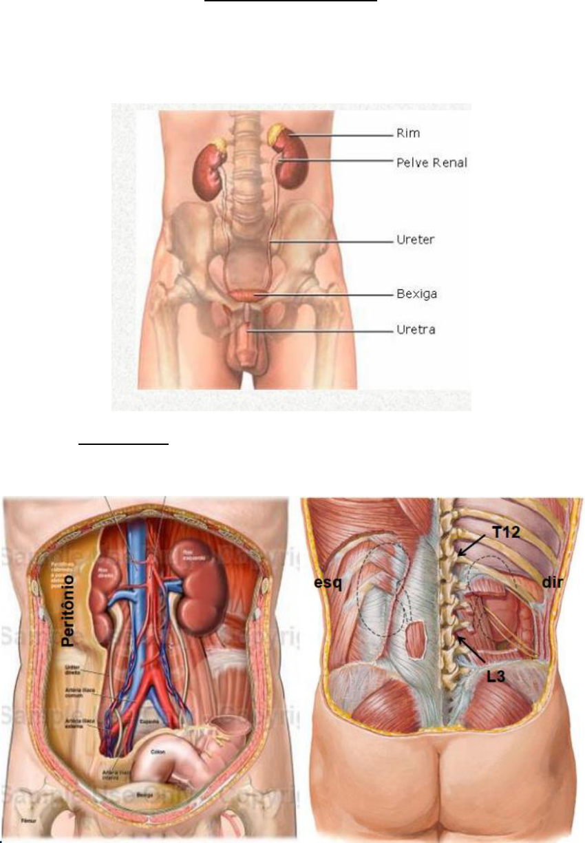 Anatomia do Sistema Urinário Este sistema possui uma dupla função, sendo elas: excretora e secretora (endócrina). É formado por quatro órgãos: os rins, os ureteres, a bexiga e o ureter. O Rim, além de sua função vital de filtragem do plasma sanguíneo, tem a capacidade de síntese de alguns hormônios, dentre eles a eritropoietina, sendo assim um órgão com função glandular. Diz-se que a holotopia renal é retroperitonial, entre o peritônio e a parede posterior, e entre as vértebras T11-L2 o esquerdo e T12-L3 o direito. O rim direito encontra-se mais caudal que o esquerdo devido a presença do fígado neste lado do corpo. O rim em sua morfologia externa possui duas faces (anterior e posterior), duas margens (interna ou medial e externa ou lateral) e duas extremidades (superior e inferior). Na margem medial existe o hilo renal, estrutura pela qual transpassam vasos sanguíneos (artéria e veia renal, que partem da artéria aorta abdominal e veia cava inferior), nervos do plexo renal e por onde saem os ureteres. Geralmente, a veia cava inferior encontra-se posicionada à direita da artéria aorta abdominal, no entanto existe uma variação anatômica, denominada situs inversus, onde essa condição é trocada, isto é: a artéria passa a se localizar à direita da veia, e o indivíduo sobrevive sem nenhum problema. Este órgão possui uma estratigrafia de camadas de revestimento, sendo da mais externa para a mais interna: fáscia renal, cápsula adiposa e cápsula fibrosa. Estas três camadas são formadas de tecido adiposo com função de sustentar, proteger e posicionar, além de ancorar o rim na parede posterior do abdome. A cápsula fibrosa está em contato com a camada mais externa do córtex renal, porém não faz parte do rim. A morfologia interna renal possui características próprias, sendo diferente de qualquer outra encontrada em outros órgãos. O rim é dividido internamente em córtex renal (região mais externa) e medula renal (região mais interna). O córtex renal apresenta-se projetando parte de seu tecido para o espaço medular, formando as colunas de Bertin e dividindo a medula em pirâmides. Essa estrutura possui esse nome por possuir uma morfologia semelhante a esta figura geométrica, seguindo a analogia, o ápice das pirâmides é sempre voltado ao centro do órgão sendo denominados papilas renais. As papilas são envoltas pelos cálices menores, estruturas que funcionam como primeira câmara de armazenamento e direcionamento da urina, quando gotejadas nesta região a urina já está pronta para ser direcionada para fora do organismo. A junção de aproximadamente quatro cálices menores forma um cálice maior, os quais se juntam formando a pelve renal, de onde parte o ureter. Os ureteres são ductos de 25 a 30 centímetros de comprimento e com diâmetro de 3 milímetros, no entanto este é inconstante ao longo do ducto. Existem ao longo de sua extensão três pontos de contrição, áreas onde o diâmetro do ureter é reduzido. O primeiro ponto de constrição está localizado no início do órgão, na região de transição entre pelve e ureter; o segundo no ponto de sintopia com a artéria ilíaca, ele se forma devido à força exercida pela contração da musculatura arterial, assim, a pressão da condução do sangue neste vaso reduz o calibre do ureter; e o terceiro no trajeto intramural deste órgão com a vesícula urinária, devido à maior resistência do muro da bexiga. A bexiga ou vesícula urinária é um órgão em formato de bolsa responsável por armazenar a urina. Nele desembocam os ureteres e parte a uretra. Os ureteres entram na bexiga pelos óstios dos ureteres e a uretra tem início no colo da bexiga e sai pela região da úvula da bexiga. Estas três aberturas juntas formam o chamado trígono da bexiga. Nas pessoas do sexo masculino a próstata se projeta sobre a parede posterior deste órgão formando o utrículo no meio do trígono. A bexiga masculina esta diretamente anterior ao reto, enquanto a feminina encontra-se anterior à vagina e abaixo do útero e a vagina anterior ao reto. A parede interna da bexiga possui uma projeção superior ao óstio do ureter que impede o refluxo urinário. A uretra é um órgão em formato de ducto que parte da bexiga ao óstio externo da uretra, direcionando a urina para fora do organismo. A uretra masculina possui cerca de 15 centímetros, sendo dividida em três partes: a parte prostática, parte membranácea e parte esponjosa. A parte prostática é a mais curta, a maior é a esponjosa. Recebem seus nomes de acordo com a região que se encontram. Já a feminina possui apenas 4 centímetros e desemboca na vagina.
