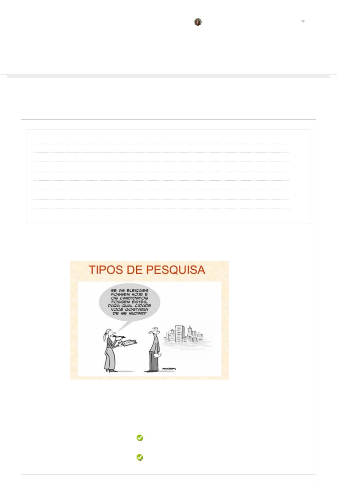Revisar envio do teste: ATIVIDADE 2 AIM0687 METODOLOGIA CIENTIFICA EAD (ON) - 201910.100862.05 Atividades N1 Revisar envio do teste: ATIVIDADE 2 Usuário PAOLA DE MORAES LENZ Curso AIM0687 METODOLOGIA CIENTIFICA EAD (ON) - 201910.100862.05 Teste ATIVIDADE 2 Iniciado 20/03/19 08:31 Enviado 20/03/19 10:42 Status Completada Resultado da tentativa 2 em 2 pontos Tempo decorrido 2 horas, 11 minutos Resultados exibidos Respostas enviadas, Respostas corretas, Comentários Pergunta 1 Resposta Selecionada: e. Resposta Correta: e. Observe a charge abaixo: Fonte da imagem: http://oficinadepesquisa.com.br Conhecendo os tipos de pesquisa, sobre a perspectiva dos procedimentos técnicos, podemos afirmar que a charge representa: Levantamento de campo. Levantamento de campo. Minha Área 0,2 em 0,2 pontos PAOLA DE MORAES LENZ Pergunta 2 Resposta Selecionada: c. Resposta Correta: c. Sobre os diversos tipos de leitura que devemos realizar para obter conhecimento e material para o embasamento teórico, analise as afirmações abaixo e classifique-as como verdadeira (V) ou falsa (F). ( ) A leitura interpretativa é realizada para que o pesquisador pratique a leitura e consiga interpretar os dados de sua própria pesquisa. ( ) A leitura exploratória é uma leitura rápida do material selecionado, e ajuda o pesquisador a verificar se as informações podem ser aproveitadas no estudo. ( ) A leitura seletiva é uma leitura obrigatória e rápida, que tem como objetivo localizar, de forma geral, o material com potencial para ser utilizado no estudo. ( ) A leitura reflexiva é uma leitura mais crítica do material selecionado e, tem como objetivo ordenar as informações e categorizá-las. Assinale a alternativa com a relação correta: F, V, F, V. F, V, F, V. Pergunta 3 Resposta Selecionada: d. Resposta Correta: d. A pesquisa de abordagem quantitativa objetiva quantificar informações, opiniões e ideias, fazendo uso de instrumental técnico e processos estatísticos para classificação e análise dos resultados. Assinale a alternativa que apresenta um tema de abordagem quantitativa: Pesquisa de intenção de votos para a próxima eleição. Pesquisa de intenção de votos para a próxima eleição. Pergunta 4 Resposta Selecionada: João deu início a uma pesquisa bibliográfica sobre os estudos realizados em uma determinada espécie de peixe. Ao longo de sua pesquisa, ele deve consultar os trabalhos já publicados sobre seu objeto de estudo. Avalie as afirmações abaixo sobre este assunto: I. João deve utilizar parâmetros cronológicos para selecionar os artigos que deve consultar. PORQUE II. Os parâmetros cronológicos são as obras que irão relacionar o tema ao objeto de estudo. É correto afirmar que: 0,2 em 0,2 pontos 0,2 em 0,2 pontos 0,2 em 0,2 pontos d. Resposta Correta: d. As afirmações I e II são falsas. As afirmações I e II são falsas. Pergunta 5 Resposta Selecionada: d. Resposta Correta: d. A pesquisa científica pode ter diferentes procedimentos metodológicos e técnicas para a coleta de dados. Dessa forma, um mesmo tema pode ser apresentado de diferentes formas, dependendo das características e objetivos do estudo. Parâmetros temáticos, linguísticos e cronológicos são critérios para definir as coletas de dados de que tipo de pesquisa? Bibliográfica. Bibliográfica. Pergunta 6 Resposta Selecionada: b. Resposta Correta: b. Se podemos considerar que toda pesquisa científica tem um pouco da pesquisa qualitativa e da pesquisa quantitativa, tal constatação, por outro lado, não deve impedir que façamos as necessárias distinções entre ambas. Desta forma, para o alargamento do processo de desenvolvimento de nossos conhecimentos sobre a Metodologia Científica, é imprescindível organizar as diferenças e similaridades entre as pesquisas qualitativa e quantitativa antes de quaisquer decisões sobre os elementos mais adequados ao nosso projeto de pesquisa. Assim, devemos considerar os seguintes aspectos para esta organização entre ambas as pesquisas: I – Características da pesquisa; postura do pesquisador; estratégias de coleta de dados; estudo de caso; papel do sujeito, aplicabilidade e uso dos resultados da pesquisa. II - Definição do tema; postura do pesquisador; estratégias de coleta de dados; papel do sujeito, aplicabilidade e uso dos resultados da pesquisa. III - Estratégias de coleta de dados; elaboração do resumo; estudo de caso; papel do sujeito, aplicabilidade e uso dos resultados da pesquisa. IV – Características da pesquisa; estudo de caso; papel do sujeito, aplicabilidade e uso dos resultados da pesquisa e elaboração das considerações finais. V - Características da pesquisa; definição do tema; elaboração do resumo; postura do pesquisador; estratégias de coleta de dados; papel do sujeito; elaboração das considerações finais. Assinale a alternativa em que todos os itens estão corretos: I, apenas. I, apenas. Pergunta 7 0,2 em 0,2 pontos 0,2 em 0,2 pontos 0,2 em 0,2 pontos Resposta Selecionada: b. Resposta Correta: b. Ao escolher o tema que irá pesquisar, você deve delimitá-lo, ou seja, ser o mais específico possível. Considerando as alternativas a seguir, assinale as que possibilitam a delimitação do tema, a fim de definir todo o projeto de pesquisa: I. Identificação das publicações científicas mais atuais sobre o assunto. II. Definição do tema, conforme a coleta de dados – por exemplo, delimitação do local e das circunstâncias do tempo, de acordo com o tipo de pesquisa – estudo de caso, documental, levantamento etc. III. Buscar orientação com algum professor ou tutor para otimizar a concentração de informações. Apenas I e III estão corretas. Apenas I e III estão corretas. Pergunta 8 Resposta Selecionada: a. Resposta Correta: a. A pesquisa científica é base para a produção de novos conhecimentos ou comprovação daquilo que é dito como verdade. Para que isso ocorra, diversos pontos devem ser observados. A r