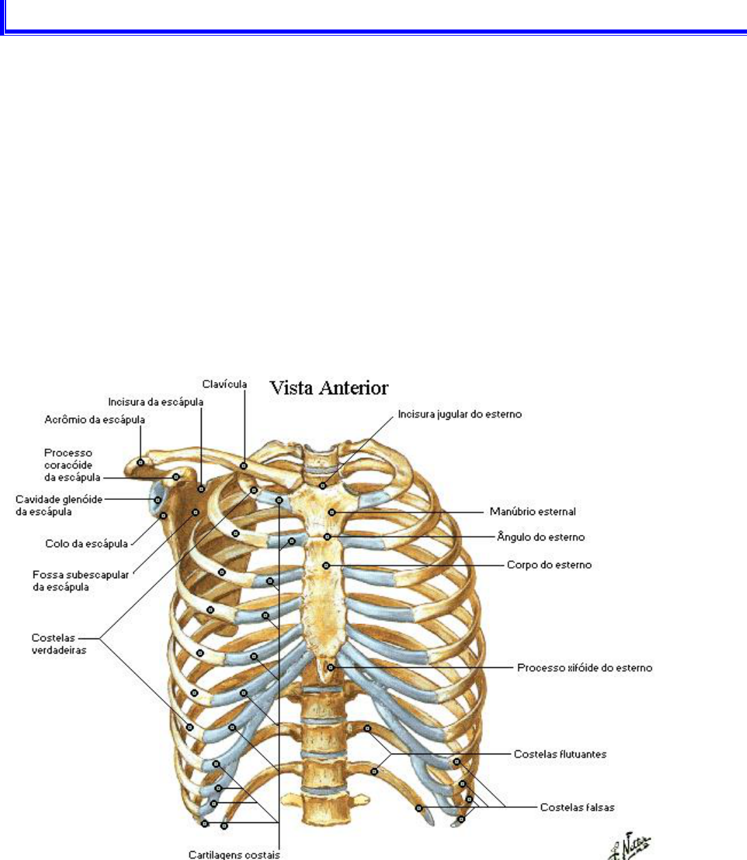 Anatomia do Tórax - Osteologia Esse material não substitui o livro didático - 1 EESSQQUUEELLEETTOO DDOO TTÓÓRRAAXX O esqueleto do tórax, também chamado de “caixa torácica”, é uma estrutura osteocartílagínea que protege as vísceras torácicas e alguns órgãos abdominais. O esqueleto do tórax inclui 12 pares de costelas e cartilagens costais associadas, 12 vértebras torácicas e os discos intervertebrais interpostos entre elas, e o esterno. As costelas e as cartilagens costais formam a maior parte da caixa torácica. O tórax tem a forma de um cone truncado, com vértice superior e base inferior. Limites: ✓ Superior o corpo da primeira vértebra torácica, primeira costela de ambos os lados e a incisura jugular do manúbrio do esterno; ✓ Inferior o músculo diafragma; ✓ Anterior o osso esterno e as cartilagens costais; ✓ Posterior as vértebras torácicas; ✓ Laterais gradil costal direito e esquerdo; Anatomia do Tórax - Osteologia Esse material não substitui o livro didático - 2 EESSTTEERRNNOO É um osso plano, alongado, que forma a região intermediária da parte anterior da caixa torácica. O esterno possui três partes: manúbrio do esterno, corpo do esterno e processo xifóide. Manúbrio localizado superiormente e se une ao corpo do osso chamado ângulo esternal, articula-se com a clavícula e primeiro par de costelas. Apresenta ainda as incisuras costal, jugular e clavicular. Importância do ângulo esternal: 1) é referência para a segunda costela e, assim, permite a contagem das costelas in vivo; 2) corresponde ao ponto mais elevado do arco aórtico; 3) e também à bifurcação da traquéia nos brônquios principais. Corpo localizado medialmente, recebe do 2o par (dividindo com o manúbrio) até o 7o par de costelas verdadeiras, diretamente; a 8a, 9a e 10a costelas falsas, indiretamente, articulando-se com cartilagem costal da 7a. costela; e a 11a e 12a flutuantes, que não se articulam com o esterno. A articulação esterno-costal é uma sincondrose, ou seja, cartilagem do tipo hialina. Processo Xifóide inferiormente, fixa o reto abdominal e o diafragma. Posição Anatômica: Incisura jugular superior e ângulo esternal anteriormente. Corpo Processo Xifóide Manúbrio Ângulo Esternal Incisura Jugular Incisura Clavicular Incisura Costal Anatomia do Tórax - Osteologia Esse material não substitui o livro didático - 3 CCOOSSTTEELLAASS São ossos planos e curvos que formam a maior parte da caixa torácica. São muito leves, porém muito resilientes (elásticos). Cada costela possui um interior esponjoso contendo medula óssea, tecido formador de células do sangue. Existem três tipos de costelas: Costelas verdadeiras (costelas I-VII): se fixam diretamente ao esterno através de suas próprias cartilagens costais; Costelas falsas (costelas VIII-X): suas cartilagens são unidas à cartilagem da costela acima delas, desta forma, sua conexão com o esterno é indireta; Costelas flutuantes (costelas XI e XII): as cartilagens rudimentares dessas costelas não se conectam com o esterno, nem mesmo indiretamente, terminando na musculatura abdominal posterior. OBS: A costela X geralmente é falsa, mas algumas vezes pode se apresentar como uma costela flutuante. Costelas típicas apresentam: cabeça da costela (face articular, crista da cabeça da costela), colo da costela, corpo da costela (tubérculo da costela, face articular do tubérculo da costela), ângulo da costela, sulco da costela. Costela I (atípica): tubérculo do músculo escaleno anterior, sulco da artéria subclávia e sulco da veia subclávia. Costela II (atípica): tuberosidade do músculo serrátil anterior. Posição Anatômica: Cabeça voltada posteriormente e borda inferior (cortante) inferiormente