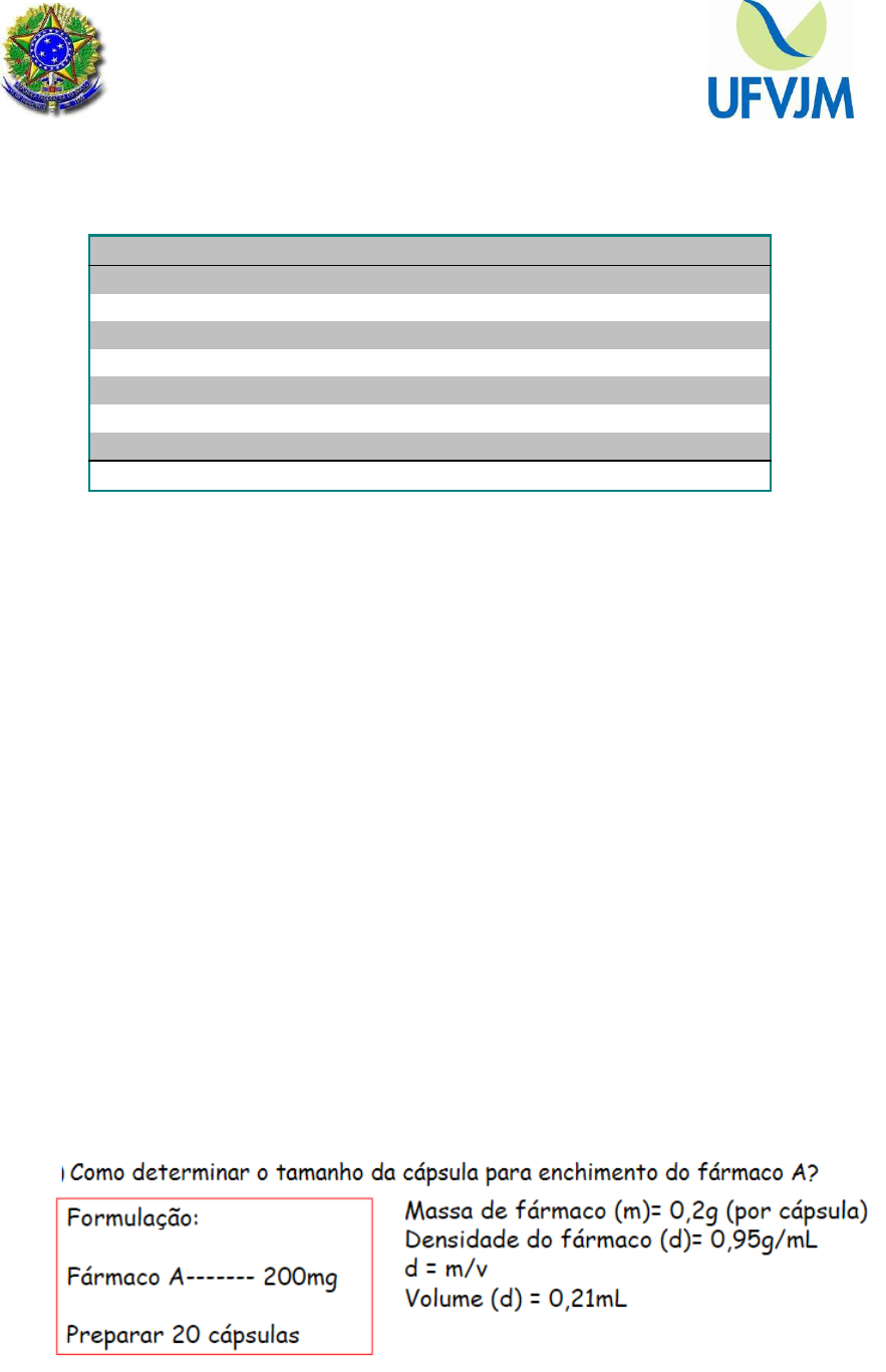 MINISTÉRIO DA EDUCAÇÃO UNIVERSIDADE FEDERAL DOS VALES DO JEQUITINHONA E MUCURI PRÓ-REITORIA DE GRADUAÇÃO DIAMANTINA – MG ESTUDO DIRIGIDO PREPARAÇÃO DE CÁPSULAS Número Volume aproximado 000 1,40 mL 00 0,95 mL 0 0,67 mL 1 0,50 mL 2 0,37 mL 3 0,27 mL 4 0,20 mL 5 0,13 mL Tabela : Número de cápsulas disponíveis com o respectivo volume que cada uma comporta 1) Calcule a quantidade de matéria prima necessária para preparar 20 cápsulas dessa formulação: - Digoxina - diluição 1:10 - 0,1 mg. Excipiente q.s.p. 100,0 mg. Dados: A digoxina está sendo utilizada na dosagem de 1 mg (de digoxina) a cada 10 mg da mistura. 2) Envie Carbonato de magnésio 500 mg Mande 10 cápsulas Dados: Supondo que Vp = 9,1 mL número da cáps. utilizada? volume de excipiente? densidade aparente = ? 3) 4) Repasse a seguinte ordem de manipulação. Fluoxetina........................... 20 mg Excipiente.............qsp........ 1 cáps Mande 60 cápsulas. Tomar uma capsula pela manhã. Dados: Fluoxetina cloridrato Feq : 1,12 Fc : 1,04 Fumid: 1,03 d aparente : 0,72 g/mL 5) Quanto se deve utilizar de cálcio quelato, adquirido em uma concentração a 20%, para preparar 30 cápsulas de 500mg? Utilizando a tabela acima como parâmetro do tamanho de cápsula disponível e seguindo estes valores de volume para cada tamanho, resolva os exercícios 6, 7 e 8 abaixo. - Para cada formulação descrita, calcular a quantidade necessária de excipiente para compor a formulação total. Escolher o tamanho de cápsula mais viável, justificando com os cálculos. Obs. Resposta padrão: - Número da cápsula escolhida:________. - Quantidade de cada componente da formulação para o total de cápsulas: Componente A: ______g. Componente B:______g. Componente C:______g. Excipiente: _________g. - Cálculos:___________. 6) Formulação 1. Alprazolan 1mg Excipiente qsp 20 capsulas Manipular 20 cápsulas. Dado: volume de 2g da mistura de pós sem excipiente = 7,8mL. Volume de 1,5g de excipiente = 2,0mL. Alprazolan está diluído na proporção de 1:10. 7) Formulação 2. Paracetamol 400mg. Cafeína 30mg. Excipiente qsp 35 capsulas Manipule 35 cápsulas. Dado: volume de 5g da mistura de pós sem excipiente = 3,6mL. Volume de 5g de excipiente = 6,6 mL. Cafeína apresenta teor declarado em laudo de análise do fornecedor de 87%. 8) Formulação 3. Cloridrato de difenidramina 25mg Paracetamol 325mg Excipiente qsp 20 capsulas Manipular 20 cápsulas. Dado: volume de 3g da mistura de pós sem excipiente = 2,2mL. Volume de 5g de excipiente = 6,6 mL. Paracetamol apresenta no laudo de análise do fornecedor umidade de 6%. 9) Proponha uma formulação para um principio ativo de classe ( explique o porquê do uso de cada excipiente) a) Classe I b) Classe II c) Classe III d) Classe IV e) Cápsula gastroressistente