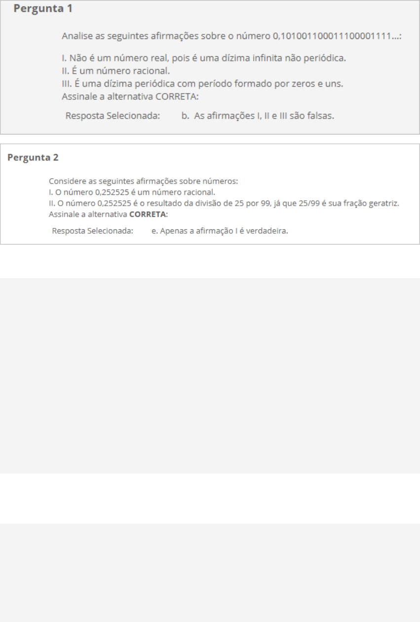 Fundamentos de Análise Matemática – AS_III Pergunta 3 Compare as representações decimais dos números dois mil trezentos e quarenta e trezentos mil, quatrocentos e dois. Sobre essas representações, é CORRETO afirmar que: I. No 1º número, o algarismo 2 corresponde a um valor que é 1000 vezes o valor do mesmo algarismo no 2º número. II. No 2º número, o algarismo 3 corresponde a um valor que é 1000 vezes o valor do mesmo algarismo no 1º número. III. As afirmações I e II podem ser generalizadas para todos os algarismos presentes, isto é: “qualquer algarismo do 1º número corresponde a um valor que é 1000 vezes maior ou menor que o valor do mesmo algarismo no 2º número”. Assinale a alternativa CORRETA: Resposta Selecionada: c. Apenas as afirmações I e II são verdadeiras. Pergunta 4 Para demonstrar que o conjunto dos números reais não é enumerável, foi usada a seguinte abordagem: I. Definimos o conjunto A dos números reais que pertencem ao intervalo 0 < x < 1. II. Supusemos que o conjunto A era enumerável. III. Se o conjunto é enumerável, é possível construir uma tabela com as linhas numeradas, em que em cada linha se coloque um dos números que pertencem ao conjunto. Todos os números que pertencem ao conjunto devem estar presentes na tabela. IV. Mostramos que para qualquer tabela que seja proposta no passo II, sempre é possível encontrar um número que pertence ao conjunto A e não aparece na tabela. V. Consequentemente, o conjunto dos números reais não é enumerável. Sobre essas afirmações, é CORRETO afirmar que: Resposta Selecionada: e. Todas as afirmações são verdadeiras, mas falta uma etapa para constituírem de fato a descrição da demonstração de que o conjunto dos reais não é enumerável.