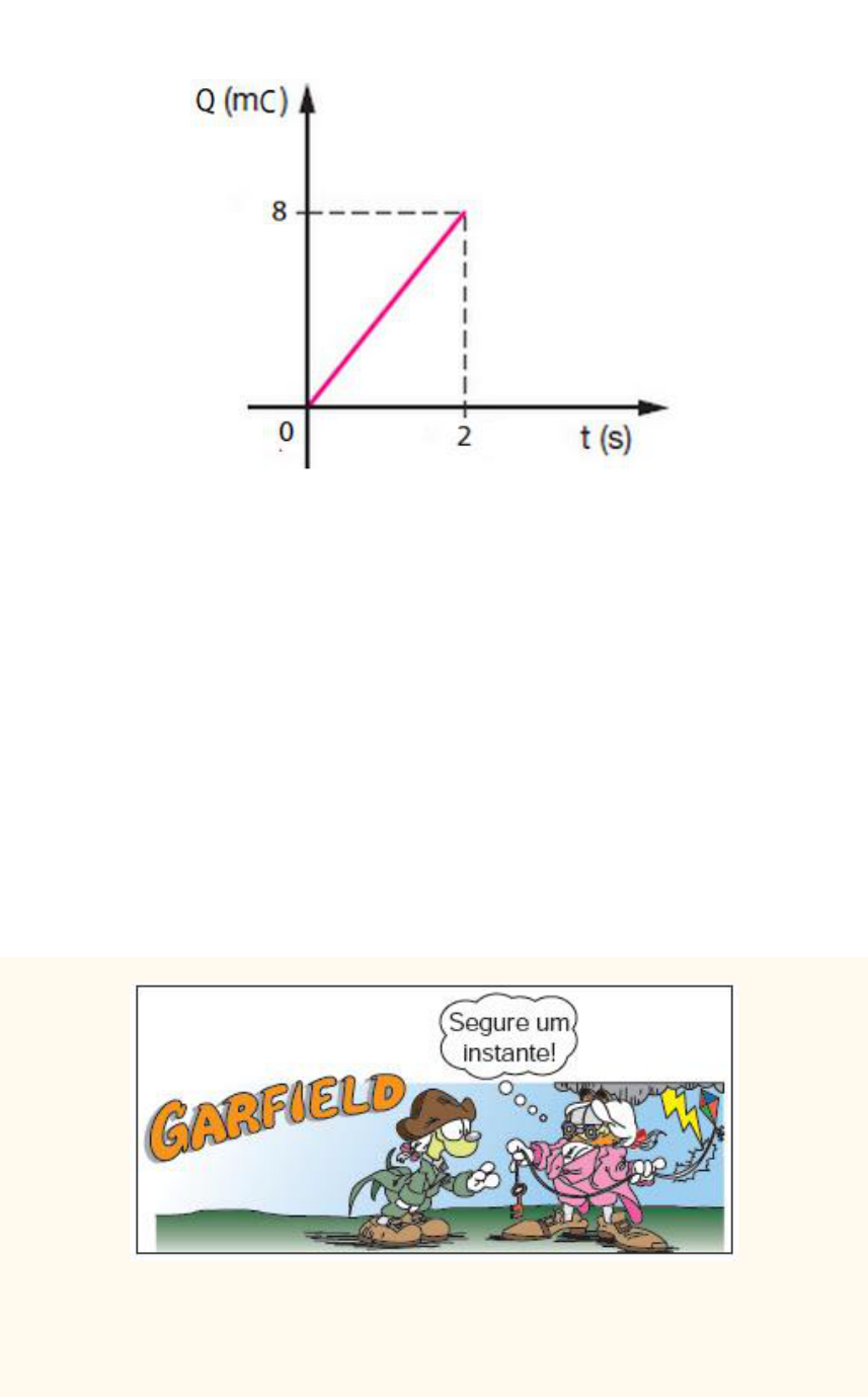 01. O gráfico seguinte mostra a variação da carga Q que atravessa um condutor em função do tempo t. Com base neste gráfico, a CORRENTE ELÉTRICA que circula neste condutor vale: a) 16 mA. b) 8 mA. c) 4 mA. d) 8 A. i = Q/Δt = 8/2 = 4 mA. 02. Na tira, Garfield, muito maldosamente, reproduz o famoso experimento de Benjamin Franklin, com a diferença de que o cientista, na época, teve o cuidado de isolar a si mesmo de seu aparelho e de manter-se protegido da chuva de modo que não fosse eletrocutado como tantos outros que tentaram reproduzir o seu experimento. Franklin descobriu que os raios são descargas elétricas produzidas geralmente entre uma nuvem e o solo ou entre partes de uma mesma nuvem que estão eletrizadas com cargas opostas. Hoje sabe-se que uma descarga elétrica na atmosfera pode gerar correntes elétricas da ordem de 105 ampères e que as tempestades que ocorrem no nosso planeta originam, em média, 100 raios por segundo. Isso significa que a ordem de grandeza do número de elétrons que são transferidos, por segundo, por meio das descargas elétricas, é, aproximadamente, Use para a carga de 1 elétron: 1,6.10−19 C. a) 1022 b) 1024 c) 1026 d) 1028 e) 1030 Da definição de intensidade média de corrente elétrica, (im) temos: im = n.e/∆t → 100.105 = n.1,6.10-19/1 → n = 6,25.1025 elétrons → n ~ 1026. 03. Observe a ilustração do movimento de elétrons livres no interior de um fio condutor. Para se obter um movimento como o representado na figura acima é necessário: a) colocar o fio na vertical para que os elétrons caiam sob a ação do campo gravitacional da Terra. b) aplicar no fio um campo magnético vertical e para cima. c) fazer a ligação das extremidades do fio em uma bateria que proporcione uma diferença de potencial, sendo que na extremidade esquerda deve ficar o pólo positivo. d) fazer a ligação das extremidades do fio em uma bateria que proporcione uma diferença de potencial, sendo que na extremidade direita deve ficar o pólo positivo. e) aplicar no fio um campo elétrico horizontal e para a esquerda. Como o elétron tem carga negativa eles se movem no sentido contrário ao do campo elétrico. Assim a corrente elétrica vai do pólo negativo para o positivo. Veja a figura. 04. Uma lâmpada fluorescente contém em seu interior um gás que se ioniza após a aplicação de alta tensão entre seus terminais. Após a ionização, uma corrente elétrica é estabelecida e os íons negativos deslocam-se com uma taxa de 1,0.1018 íons/segundo para o pólo A. Os íons positivos se deslocam-se, com a mesma taxa, para o pólo B. Sabendo-se que a carga de cada íon positivo é de 1,6.10-19 C, pode-se dizer que a corrente elétrica na lâmpada será: a) 0,16 A b) 0,32 A c) 1,0.1018 A d) nula i = n.e/∆t = 2.1.1018.1,6.10-19 /1 = 3,2.10-1 = 0,32 A. 05. Uma residência usa alguns equipamentos elétricos, cuja potência de cada um e o tempo de funcionamento em um mês encontram-se especificados na tabela abaixo: Equeipamento Quantidade Tempo de funcionamento Potência (W) Lâmpada 04 120 h 60 (cada uma) Ferro elétrico 01 30 h 600 Televisor 01 60 h 120 A energia elétrica total consumida, em quilowatt-hora (kWh), pelos equipamentos vale: a) 42,0 b) 66,0 c) 32,0 d) 54,0 e) 72,0 ELÂMPADA = N.P.∆t/1000 = 4.60.120/1000 = 28800/1000 = 28,8 KWh. EFERRO = N.P.∆t/1000 = 1.600.30/1000 = 18000/1000 = 18 KWh. ETELEVISOR = N.P.∆t/1000 = 1.120.60/1000 = 7200/1000 = 7,2 KWh. Logo: ETOTAL = 28,8 + 18 + 7,2 = 54 KWh. EXERCÍCIOS PROPOSTOS 01. O gráfico a seguir mostra como varia a tensão elétrica em um resistor mantido a uma temperatura constante em função da corrente elétrica que passa por esse resistor. Com base nas informações contidas no gráfico, é correto afirmar que a) a corrente elétrica no resistor é diretamente proporcional à tensão elétrica. b) a resistência elétrica do resistor aumenta quando a corrente elétrica aumenta. c) a resistência do resistor tem o mesmo valor qualquer que seja a tensão elétrica. d) dobrando-se a corrente elétrica através do resistor, a potência elétrica consumida quadruplica. e) o resistor é feito de um material que obedece a Lei de Ohm. Vemos que, a medida que a corrente elétrica aumenta a reta tangente inclina-se cada vez mais em relação ao eixo das correntes, sendo assim, a resistência elétrica aumentará. 02. Na figura abaixo está representado um circuito elétrico simples, composto por uma bateria, fios de conexão e uma lâmpada. Sobre o circuito mostrado, marque a única alternativa correta. a) A corrente elétrica não é consumida e circula, inclusive, dentro da bateria. b) A quantidade de elétrons na corrente antes da lâmpada é menor que depois da mesma. c) A corrente elétrica é formada por íons que circulam em sentidos contrários. d) Elétrons são criados no pólo negativo e circulam, fora da bateria, em direção ao pólo positivo, onde são consumidos. Sabemos que uma bateria converte uma energia não elétrica em elétrica, assim haverá passagem de corrente elétrica através da bateria chegando até a lâmpada. 03. O gráfico abaixo mostra como varia a corrente elétrica i em função do tempo t através da secção transversal de um condutor. Calcule a carga elétrica total que circulou por esta secção. Dado: carga do elétron = 1,6.10−19 C. Q = B.h/2 = 10.10-3.120/2 = 60.10-2 = 0,6 C. 04. Pela secção reta de um condutor de eletricidade passam 12,0 C a cada minuto. Nesse condutor, a intensidade da corrente elétrica, em ampères, é igual a: a) 0,08 b) 0,20 c) 5,00 d) 7,20 e) 120 i = Q/Δt = 12/60 = 0,2 A. Obs.: 1 min = 60 s. 05. Estes circuitos representam uma pilha ligada a duas lâmpadas e uma chave interruptora. A alternativa que apresenta o(s) circuito(s) em que a ação da chave apaga ou acende as duas lâmpadas, simultaneamente, é: a) I b) II c) III d) I e II e) I e III Na figura I as lâmpadas estão em paralelo podendo acender ou apagar simultaneament