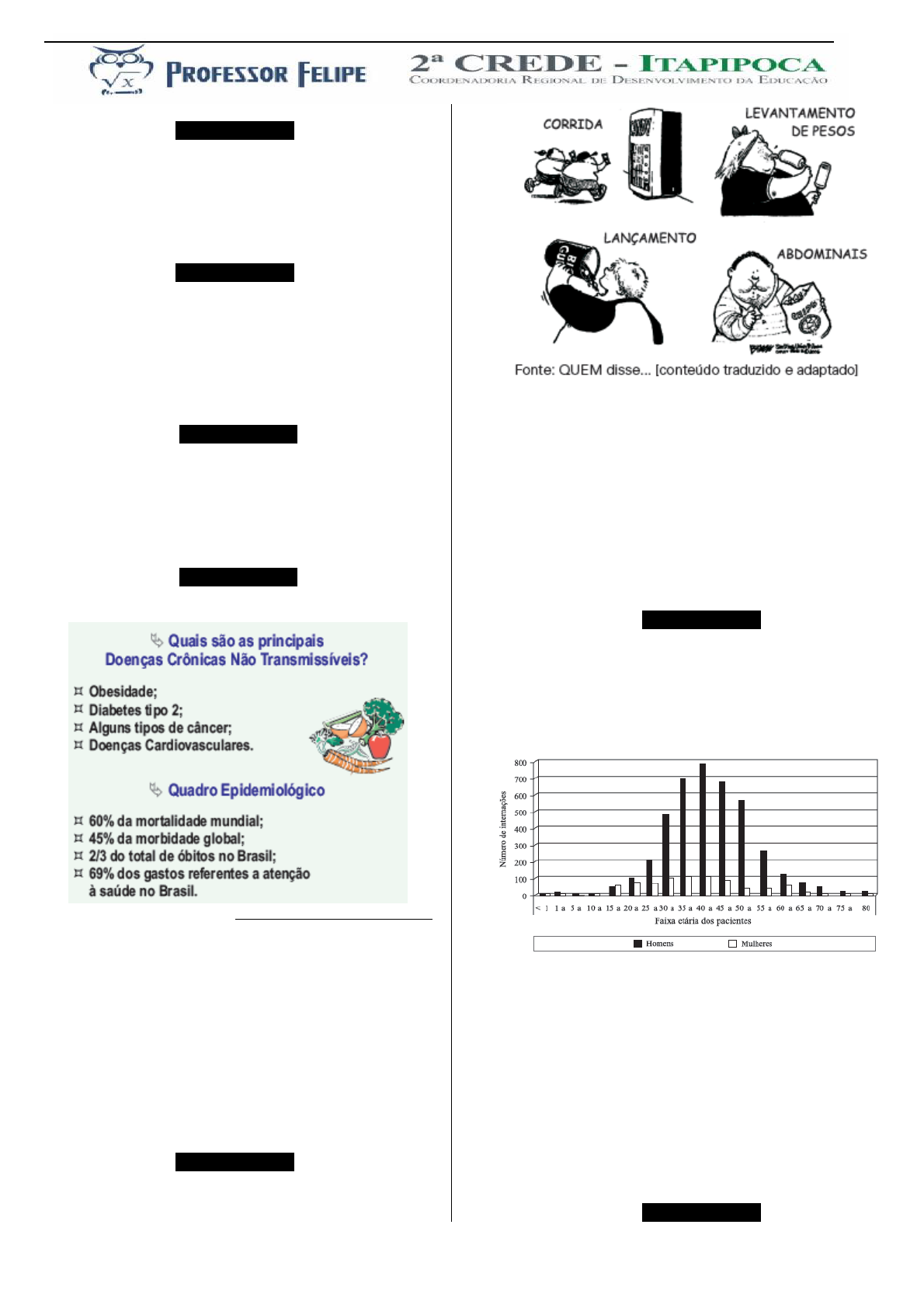 1 ––––––––– QUESTÃO 01 –––––––––– (SEDUC - ITAJUBÁ). O cobre e outros metais são utilizados na confecção de fios elétricos, pois possuem a propriedade de: A) serem bons condutores de eletricidade B) não se misturarem com a água C) serem formados de matéria orgânica D) serem formados por carbono ––––––––– QUESTÃO 02 –––––––––– (SEDUC - ITAJUBÁ). Pode ser considerado um fenômeno físico: (A) a queima de um papel (B) a formação do gelo (C) a formação da ferrugem (D) a fotossíntese –––––––––– QUESTÃO 03 –––––––––– (SEDUC - ITAJUBÁ). Pode ser considerada forma “limpa” e sustentável de produção de energia: (A) hidrelétrica (B) eólica (C) petróleo (D) nuclear –––––––––– QUESTÃO 04 –––––––––– (SARESP). Observe o slide a seguir, elaborado a partir de dados da Organização Pan-Americana para a Saúde (OPAS): Fonte:http://www.cve.saude.sp.gov.br Segundo as informações do slide, podemos concluir que são comportamentos importantes para evitar a ocorrência das principais doenças crônicas não transmissíveis: (A) não consumir proteínas nem se expor a agentes cancerígenos. (B) praticar atividades físicas e ter uma alimentação balanceada. (C) tomar remédios constantemente e fazer tratamentos preventivos. (D) tomar todas as vacinas e não entrar em contato com pessoas doentes. ––––––––– QUESTÃO 05 –––––––––– (SARESP). QUEM DISSE QUE NOSSAS CRIANÇAS NÃO SE EXERCITAM? A charge ironiza um dos problemas enfrentados pela sociedade atual, ou seja, trata da (A) obesidade, causada pelo excesso de comidas calóricas e a falta de atividade física. (B) desnutrição infantil, causada pela substituição de frutas e legumes por doces. (C) falta de escolas, que faz com que as pessoas compreendam mal as informações sobre os hábitos corretos de alimentação. (D) prática em excesso de exercícios físicos na infância, o que acaba provocando lesões musculares e obesidade. D14 ––––––––– QUESTÃO 06 –––––––––– (SARESP). A tuberculose é uma doença que afeta cerca de 15% da população mundial. O gráfico abaixo mostra o número de internações por tuberculose pulmonar no Estado de São Paulo, em 2004: Número de internações por tuberculose pulmonar segundo sexo e idade no Estado de São Paulo em 2004. Fonte: Ministério da Saúde - Sistema de Informações Hospitalares do SUS. De acordo com esses dados e seus conhecimentos sobre a doença, pode-se afirmar que (A) a tuberculose é uma doença característica da infância, afetando crianças até 10 anos de idade. (B) há mais mulheres internadas devido à tuberculose do que homens. (C) a maior parte das internações ocorre com pessoas entre 30 e 50 anos. (D) não é necessário vacinar crianças, pois não há casos de internações em pessoas com até 15 anos. D5 –––––––––– QUESTÃO 07 –––––––––– 2 (SARESP). Um aspecto muito importante que marca a passagem da infância para a adolescência é a puberdade, fase em que começam a ocorrer grandes modificações corporais. O corpo da garota se transforma: sua bacia se alarga, a cintura afina, nascem pelos em diversas regiões, os seios começam a despontar – motivo de orgulho ou de vergonha. Fonte: ESSLINGER, J.; KOVÁCS, M. J. Adolescência: vida ou morte? São Paulo: Ática, 2003. Os hormônios responsáveis pelas transformações ocorridas na puberdade, algumas delas descritas no texto, são (A) adrenocorticotrófico e ocitocina. (B) progesterona e estrogênio. (C) tiroxina e paratormônio. (D) glucagon e insulina. D9 –––––––––– QUESTÃO 08 –––––––––– (SARESP). O cientista Robert Boyle realizou, em 1660, uma experiência que nos ajudou a conhecer melhor o som. Ele colocou uma sineta em um recipiente de vidro, semelhante ao equipamento a seguir: Boyle programou a sineta para tocar e retirou o ar desse recipiente. Então, no instante em que começou a tocar, ele podia observar o movimento da sineta, mas não se ouvia o som. Dessa forma, o cientista pôde concluir que (A) a luz precisa do ar para se propagar. (B) o som precisa do ar para se propagar. (C) a luz se propaga mais lentamente que o som. (D) o som se propaga no vácuo, mas a luz não. D6 –––––––––– QUESTÃO 09 –––––––––– (SARESP). Fonte: GONSALES Fernando, Níquel Nóuser: vá pentear macacos! São Paulo: Devir 2004 Graças à coordenação exercida pelos sistemas endócrino e nervoso, nosso organismo pode reagir rapidamente a estímulos captados pelos órgãos dos sentidos. Na situação de fuga apresentada no quadrinho, a respiração e os batimentos cardíacos (A) permanecem iguais, pois somente os músculos das pernas sofrem estímulos para a fuga. (B) diminuem, pois assim o sistema nervoso processa informações com mais eficiência. (C) aumentam, pois isso causa maior oxigenação do cérebro e dos músculos. (D) não sofrem alterações, pois o sistema nervoso não atua sobre eles. D16 –––––––––– QUESTÃO 10 –––––––––– (SARESP). Sexo seguro é o nome dado à prática de sexo sem o risco de que as pessoas envolvidas sejam contaminadas por doenças sexualmente transmissíveis (DSTs). Esta segurança só pode ser atingida através da prática sexual com parceiro(a) comprovadamente sadio(a) ou quando ocorre sem o contato de fluidos corpóreos, como esperma, secreção vaginal e sangue. Fonte: <http://www.dst.com.br>. [Adaptado]. Sobre esse assunto, podemos afirmar que (A) a camisinha (ou preservativo) atua prevenindo a gravidez, mas não as DSTs. (B) ao evitar o contato entre o esperma e a vagina, também prevenimos a gravidez. (C) as DSTs são doenças muito raras, apenas grupos de risco podem apresentá-las. (D) ape