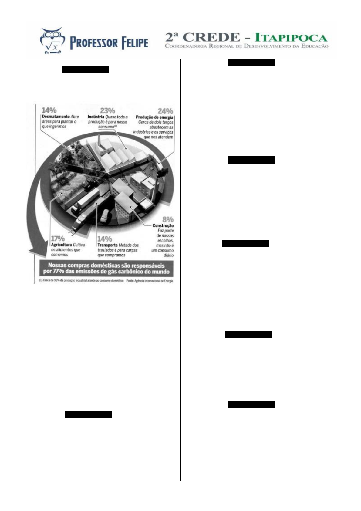 1 D1 ––––––––– QUESTÃO 01 –––––––––– Nossas compras domésticas (familiares) contribuem efetivamente para as emissões de gás carbônico na atmosfera. O quadro a seguir ilustra as principais fontes de emissões mundiais de gás carbônico. Compre verde: como nossas compras podem ajudar a salvar o planeta. Época, n. 515, 31 março 2008. De acordo com as informações dadas no quadro ilustrativo marque a afirmativa correta: A) A energia gasta na produção em geral não depende dos hábitos consumistas das pessoas. B) Todo e qualquer tipo de emissão de gás carbônico na atmosfera é de responsabilidade e competência do estado. C) Mudanças positivas de hábitos domésticos da sociedade pode impactar positivamente nas emissões de poluentes atmosféricos. D) Não existe relação entre o desmatamento e a produção em geral, pois, quem desmata não é quem produz. D22 ––––––––– QUESTÃO 02 –––––––––– São produtos exclusivamente derivados do petróleo: A) Biomassa e etanol B) Gasolina e etanol C) Etanol e óleo diesel D) Gasolina e querosene D18 –––––––––– QUESTÃO 03 ––––––––– Considere os seguintes materiais: 1 - Madeira 2 - Vidro 3 - Algodão 4 - Corpo humano 5 - Ouro 6 - Alumínio Entre os materiais listados, são bons condutores de energia: A) 1; 2; 3 B) 3; 4; 5 C) 4; 5; 6 D) 2; 3; 4 D10 –––––––––– QUESTÃO 04 ––––––––– O corpo humano apresenta um órgão com as seguintes funções: proteger o corpo contra agentes físicos, químicos e biológicos, além de ajudar a regular a temperatura do corpo e receber estímulos do ambiente. Assinale a alternativa que tenha este órgão. A) Coração B) Olho C) Pele D) Fígado D1 ––––––––– QUESTÃO 05 –––––––––– O uso de fontes alternativas de energia nos a ajuda a preservar a natureza. Sabendo disso, Rafael tem em sua casa um equipamento levar a água até a caixa d´água e outro para aquecer a água. O primeiro, funciona através da força dos ventos, enquanto que o segundo equipamento utiliza o calor do sol. Assim, estes aparelhos de Rafael utilizam energia A) elétrica e química (óleo diesel). B) eólica e solar. C) eólica e elétrica. D) elétrica e solar. D18 ––––––––– QUESTÃO 06 –––––––––– A potência de uma lâmpada pode determinar o seu consumo de energia. Quanto maior a potência, maior será o consumo energético. Desta forma, a potência de uma lâmpada pode ser medida em: A) Volts B) Ampéres C) Joules D) Watts D17 –––––––––– QUESTÃO 07 –––––––––– Considere o seguinte experimento: Deixe cair de uma mesma altura, duas folhas de papel iguais, sendo uma aberta e outra amassada. Porque a folha amassada chega primeiro ao hão? A) pesa mais que a folha aberta. B) tem maior massa do que a folha aberta. C) oferece menor resistência ao ar. D) oferece maior resistência ao ar. 2 D10 ––––––––– QUESTÃO 08 –––––––––– Os hormônios são os responsáveis pelas mudanças que ocorrem no corpo dos adolescentes durante a puberdade. O sistema responsável pela produção e ação dos hormônios corresponde ao: A) Sistema circulatório B) Sistema nervoso C) Sistema endócrino D) Sistema vascular D16 –––––––––– QUESTÃO 09 ––––––––– Na figura temos a imagem de uma campainha elétrica Na campainha ocorre a transformação de energia elétrica em: A) Energia luminosa B) Energia eólica C) Energia térmica D) Energia sonora D15 –––––––––– QUESTÃO 10 ––––––––– Observe a figura: Nesta figura temos a representação do efeito estufa. Desta forma a fonte de energia que mais contribui para a intensificação do efeito estufa: A) Hidrelétrica B) Nuclear C) Petróleo D) Biomassa