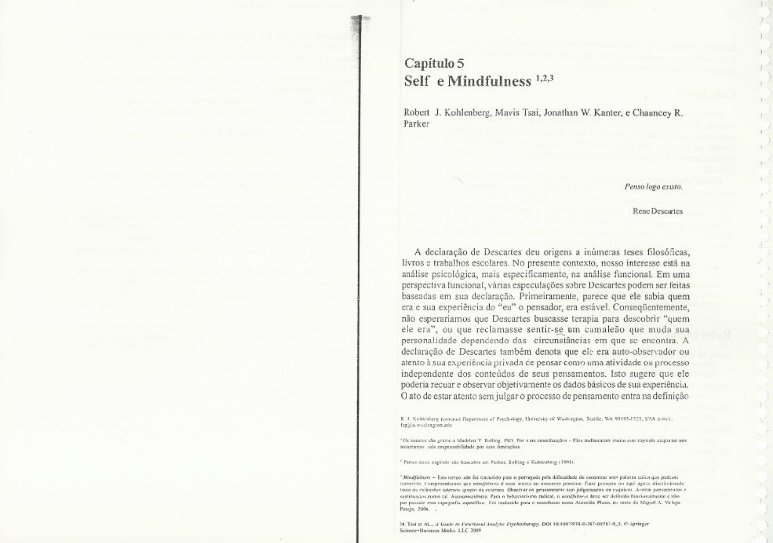 Capítulo 5 Self e Mindfulness ",2,3 Robert J. Kohlenberg, Mavis Tsai, Jonathan W. Kanter, e Chaunccy R. Parker Penso logo existo. Rcnc Dcscurlcs A declaração dc Descartes deu origens a inúmeras leses filosóficas, livros e trabalhos escolares. No presente contexto, nosso interesse está na análise psicológica , mais especificamente, na análise funcional. Em uma perspectiva funcional, várias especulações sobre Descartes podem ser feitas baseadas em sua declaração. Primeiramente , parece que ele sabia quem era c sua experiência do "eu" o pensador, era estável. Consequentemente, não esperaríamos que Descartes buscasse terapia para descobrir "quem ele era" , ou que reclamasse sentir-se um camaleão que muda sua personalidade dependendo das circunstâncias em que sc encontra. A declaração dc Descartes também denota que cie era auto-observador ou atento à sua experiência privada de pensar como uma atividade ou processo independente dos conteúdos de seus pensamentos. Isto sugere que ele poderia recuar e observar objetivamente os dados básicos de sua experiência. O ato de estar atento sem julgar o processo de pensamento entra na definição K I Xavvrf*.; Uv.;,.,,, fep.").». ..í P.jxholsgy. irtMtftil: Sítírte VI» ! «.» c -i! ' Oi íjiu-rf -v> ítiiií Miifclm V n-llinj. I"»D o>rrb«i<Ort - fkí nwllerir.iT omo me upiink «i uirw «u< i.uiriiiioi iih rttpiwSi&IUi ycc «i»i , P«n«» «piía.» 5-J MasMtos m iTvr. Uolii»: KuUcjhiig 1 IWil - liw uno »lo tu ll liado pira o jcli diiícuiiií: di cxtnW iro< pilou laui ptlbm ioBi"1»« <*uitpf<Kai)ci»M oíc "iirf . W-vo c tau «raro i» nnsfmo p;ti<n*. Pm; çtcvtit no fcjw i;on «(Krrnlí-n.li. loiut o< <pui>o -i nu rui o"icn»í ™ (oiuirunn «n> jMlparaciwti »i ' «ram.i.lK mm* Hl AKiimUMU Pia " «luv-íixn» ra.(«V o «KiJ.I.Af.t Uvl «r iblinuk. (iiiil.n.Jii.iiir c .»* pir |>juiir urra Mpignlii cço>fi:a I M invlujiila |\1« li tnorlUoO lioil Atcicrto NcM. r>> WWÍl M«Wl A. M Tl» .< AL.. . .w r.n.Ih» lO.KXiWí-MSt-»»»-».* " S«íokc-I1u.«co Ucdu. LLC XB» 140 R. J. Kotilcnbwg d «I. de mind/ulness, uma estratégia cada vez mais popular no (rolamento dc problemas psicológicos (c.g., Linchan, 1993; Hayes, Follcitc, & l.inchan, 2004), c que desempenha um papel importante cm muitos casos da PAR O objetivo deste capítulo é fornecer uma explicação behaviorista do self e dc mind/ulness, explicar como a falia dc senso dc self pode interferir no mindfulnesst c prover sugestões para modelar intervenções de (rolamentos que focam o self e o mindfulness na FAP. Uma Visão Behaviorista do Self Vamos começar com um simples exercício de dois passos. Faça o I° passo agora - olhe para sua mfio por aproximadamente cinco segundos. Agora o 2° passo - olhe novamente para sua mão por alguns segundos, mas enquanto faz isso, lente tomar-se consciente de quevocê está olhando. Se este exercício der certo, os passos devem ter envolvido duas fornias de conscienc ia. Durante o 1 ° passo você eslava simplesmente olhando para sua mão - notando a mão em si. Você deve ter notado algumas características e se perguntado sobre o que qnci íamos que você visse. Essa atenção envolve discriminações simples, feitas por todas as criaturas, verbais ou nào. f- atcnçào pura. automática e inconsciente. O 2° passo, todavia, incorporou um segundo tipo dc consciência. Você nào estava simplesmente vendo sua mio. mas estava "vendo " que vocc estava vendo sua mão. Isto é,você estava cicntc de um "você", alguma " coisa " ou "alguém" que estava olhando, notando, imaginando. Você deve ter até tentado metaforicamente recuar para observar-se olhando pnrn sua mão. A experiência de um "você" que está observando é aquela a que o público em geral c a maioria dos cientistas sociais se referem como sendo "o self. Dcikman (1999) define este self como um "Eu" com uma consciência permanente, descaracterizada e imutável, alguma coisa central que testemunha todos os eventos, tanto internos quanto externos. A Experiência do Self Neste capítulo os termos 'consciência,, "autoconsciência , , c ' auto- obscrvaçào' são usados alternadamente para referir-se ao 2t (ipo de consciência descrita noexcrcicio acima. Skinner afirmou que. %..)uma pessoa se torna consciente de um modo diferente quando uma comunidade verbal arranja contingências sob as quais ele não só vê um objeto mas ele "vê" que está vendo. Neste modo especial, a conscicntização c um produto social"(Skinner, 1974, p. 220). Skinner, assim, enfati/ou o modo pelo qual uma história social particular é necessária para um homem aprender a ver que ele vê. Sendo esta história normativa cm nossa cultura, unidades comuns podem ser esperadas nas descrições dc um self "norma!> ou ,ideal*. Nem todos, entretanto, desenvolvem o selfdeal almejado. Isto é, apesar dc algumas 5 Self c MindfiilDess similaridades, um senso dc self é aprendido c por isso depende das peculiaridades desta história dc aprendizagem; consequentemente , a experiência do self pode variar bastante. Nós conccitualizamos um contínuo dc experiência; cm um extremo há uma experiência ideal de continuidade e uniformidade do self , "algo central" correspondente às descrições de Descartes c Dcikman; no outro extremo , um senso dc self vazio e instável . correspondente às cxpenências de clientes que afirmam , " eu não sei quem sou " , ou que reportam múltiplos selves. Nossa visão behaviorista ê que a experiência dc self consiste em *algo central' que é expericnciado, c o processo de estar cicntc de ou reconhecer este 1algocentral,. A análise funcional de experiência doje focali/a, então, os estímulos discriminativos (Sds) dos quais alguém se torna ciente e identifica este 'algo central,. Este foco no self como um objeto ê congruente com seu uso por clientes e por psicólogos convencionais do self Nossa tarefa c , então, identificar este algo expericnciado que ê o self.