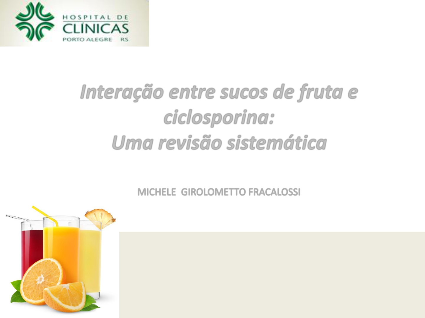 Residência Integrada Multiprofissional em Saúde Área de concentração: Onco – Hematologia MICHELE GIROLOMETTO FRACALOSSI Interação entre sucos de fruta e ciclosporina: Uma revisão sistemática Orientadora: Farm. Ms. Joice Zucckermann Co-orientadora: Nut. Ana Maria Keller Jochims Introdução TCTH Restaurar a função da medula Doenças hematológicas Anormalidades genéticas Neoplasia Hemorragia Infecções Falência orgânica Doença do enxerto contra o hospedeiro (DECH) falha ou rejeição do enxerto Doença recorrente SERBER A. Transplante de células progenitoras em pediatria. Pediat Mod. 1999; 35(8):630-4. LOZANO JE, CUÉLLAR F. Transplante de médula ósea. Revisión de actualidad. Acta Med Colomb. 1991; 16(6):322-32. Evitar complicações do tipo DECH, falha ou rejeição do enxerto no pós-transplante protocolo padrão de imunossupressão Terapia imunossupressora. ciclosporina (CsA) KAHAN BD. Cyclosporine. N Engl J Med. 1989 Dec 21;321(25):1725-38. McMILLAN, M. A. Clinical pharmacokinetics of cyclosporin. Pharmac Ther, v. 42, n. 1, p. 135-56, 1989. Introdução Metabolizada no CYP3A4 Distribui-se no sangue 25 metabólitos CsA Substrato da glicoproteína P (P-gp) Biotransformação hepática 50% eritrócitos 10% leucócitos 40% a lipoproteína MUKHERJEE S, MUKHERJEE U. A comprehensive review of immunosuppression used for liver transplantation. J Transplant. 2009;701464:1-20. Introdução Mecanismos farmacocinéticos Sucos Medicamentos ROE, D.A. Medications and nutrition in the elderly. Primary Care, Philadelphia, v.21, n.1, p.135-147,1994. Introdução Realizar uma revisão sistemática sobre as possíveis interações entre os sucos de frutas e a CsA. Objetivo Bases de dados Metodologia Descritores em Ciências da Saúde criados pela Biblioteca Virtual em Saúde desenvolvido a partir do Medical Subject Headings da U.S. National Library of Medicine Metodologia Critérios de Inclusão Metodologia Artigos encontrados BVS ( n= 17) PubMed (n=4) Artigos selecionados para leitura de texto completo (n= 9) Artigos incluídos na revisão (n= 6) Artigos excluídos por não preencherem os critérios de inclusão ou supressão de duplicatas (n= 12) Artigos excluídos (n= 3) 1 Por avaliar a diferença étnica da interação do suco de toranja com a ciclosporina 1 Comparar a biodisponibilidade da ciclosporina com uso de refrigerante cítrico 1 Por comparar a biodisponibilidade da ciclosporina com suco de toranja com o fitoquimico furanocumarina e livre de furanocumarina Resultados n = 11 pacientes pós transplante renal Suco de toranja = aumento na Cmax (145,3 ± 44,7 ng/ml-1) 1 2 = Aumento de 32% 2 3 = Redução de 27% # Não houve diferença ao comparar a fase 1 à fase 3 , consideradas fases de controle. * Utilizado intervalo de confiança de 95%. * Utilizado teste ANOVA. Ducharme MP, Provenzano R, Dehoorne-Smith M, Edwards DJ. Trough concentrations of cyclosporine in blood following administration with grapefruit juice. Br J Clin Pharmacol; 36(5): 457-9, 1993 Nov. n = 14 adultos saudáveis Suco toranja Suco laranja Água p AUC 7057 ± 2172 4871 ± 2045 4932 ± 1451 <0,0001 Cmax 1269 ± 381 972 ± 379 1080 ± 269 0,01 * Utilizado teste ANOVA. Yee GC, Stanley DL, Pessa LJ, Dalla Costa T, Beltz SE, Ruiz J, Lowenthal DT.Effect of grapefruit juice on blood cyclosporin concentration. Lancet; 345(8955): 955-6, 1995 Apr 15. 8 pacientes pós transplante renal Suco toranja Água p Tmax 91 64 >0,05 Cmax 1011 935 >0,05 Houve aumento significativo de 38% na área sob a curva (p <0,05). * Utilizado teste Wilcoxon. Bistrup C, Nielsen FT, Jeppesen UE, Dieperink H. Effect of grapefruit juice on Sandimmun Neoral absorption among stable renal allograft recipients. Nephrol Dial Transplant; 16(2): 373-7, 2001 Feb. 15 pacientes pós transplante renal Suco toranja Água p Cmin 280,9 ± 78,5 234,4 ± 45,5 <0,01 Cmax 778 ± 241 595 ± 146 <0,005 * Utilizado teste t pareado. Mehrsai AR, Pourmand G, Mansour D, Zand S, Rezaali A. Effect of grapefruit juice on serum concentration of cyclosporine in Iranian renal transplant patients. Transplant Proc; 35(7): 2739-41, 2003 Nov n = 10 pacientes pós transplante renal Suco laranja Água p AUC 3473 ± 924 3456 ± 686 0,63 Cmax 801 ± 164 706 ± 121 0,37 Suco tangerina Água p AUC 3100 ± 1193 3456 ± 686 0,28 Cmax 736 ± 308 706 ± 121 0,32 Suco de laranja e tangerina não apresentaram efeito na farmacocinética da CsA num período de 12 horas. * Utilizado intervalo de confiança de 95%. * Utilizado teste t student. Sorkhi H, Oliaei F, Moghadamnia AA, Pouramin M, Firoozjahi AR. Effect of orange and tangerine juice on cyclosporine levels in renal transplant recipients. Transplant Proc; 39(4): 1228-30, 2007 May n = 12 adultos saudáveis Suco Uva preta Água p AUC 3962 ± 567 2771 ± 714 <0,05 Cmax 943 ± 167 679 ± 152 <0,05 Houve aumento em torno de 50% no clearence. A diferença no clearence provavelmente seja uma alteração na absorção, mas não no processo de depuração. * Utilizado teste t Student Oliveira-Freitas VL, Dalla Costa T, Manfro RC, Cruz LB, Schwartsmann G. Influence of purple grape juice in cyclosporine bioavailability. J Ren Nutr; 20(5): 309-13, 2010 Sep. A toranja (Citrus x paradisi) é um citrino híbrido, resultante do cruzamento do pomelo (Citrus maxima) com a laranja (Citrus x sinensis) nativa do sudeste da Ásia e comum nos trópicos asiáticos Discussão Suco de toranja foi utilizado para mascarar o sabor e aroma do etanol. Primeiro relato de interação do suco de toranja com medicação Bailey DG, Spence JD, Edgar B, Bayliff CD, Arnold JM. Ethanol enhances the hemodynamic effects of felondipine. Clin Invest Med 1989;12:357-362. Maiores efeitos adversos Aumento dos níveis séricos Sucos de maçã, lima e toranja Ciclosporina Inibição da expressão; Decréscimo do metabolismo de primeira passagem Aumento da biodisponibilidade oral. Atuarem sobre o CYP 3A4 Redução da expressão enzimática por um período de até 24 horas Bailey DG, Dr