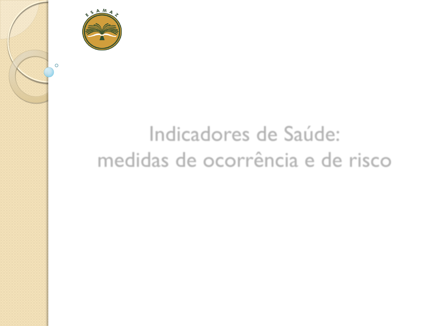 Indicadores de Saúde: medidas de ocorrência e de risco Prof. MSc. Bruno Gomes Escola Superior da Amazônia Uma Grande Faculdade. Um Grande Futuro O que são Indicadores de Saúde Importância dos Indicadores Principais Indicadores Incidência Prevalência Morbidade Mortalidade Letalidade Risco Relativo Odds Ratio Incidência É a frequência de casos novos de uma determinada doença ou problema de saúde que ocorrem em determinado período em uma população específica. Prevalência É a frequência de casos (novos + antigos) de uma determinada doença ou problema de saúde que ocorrem em determinado período em uma população específica. Fatores que podem influenciar a Prevalência Diferenças entre incidência e Prevalência Diferenças entre incidência e Prevalência Exemplo Morbidade Risco de adoecer. Relação entre indivíduos sãos e doentes em uma população predefinida. Os dados sobre morbidade são frequentemente úteis no entendimento de certas tendências na mortalidade. Mudanças nas taxas de mortalidade podem ser decorrentes de modificações no padrão de morbidade ou de letalidade de determinada doença. Mortalidade Risco de morrer. Mortalidade: é uma medida muito utilizada como indicador de saúde porque permite avaliar as condições de saúde de uma população. Coeficiente de mortalidade geral O coeficiente de mortalidade geral (taxa de mortalidade geral) é calculada da seguinte forma: Cobertura do sistema de Informações sobre Mortalidade. Brasil e Regiões - 1991 a 2004 Coeficiente de mortalidade Infantil Coeficiente de mortalidade Infantil Coeficiente de Mortalidade Materna Letalidade Mede a gravidade de uma doença e é definida como a proporção de mortes dentre aqueles doentes por uma causa específica em um certo período de tempo. Exemplo: Escabiose e Raiva Humana Risco e Fator de Risco Risco: Probabilidade de ocorrência ou aparecimento de uma doença, agravo ou condição relacionada à saúde (cura, recuperação ou melhora), em uma população ou grupo, durante um período determinado. Fatores de Risco: condições associadas ao aparecimento de doenças ou agravos. Um fator de risco refere-se a aspectos de hábitos pessoais ou de exposição ambiental, que está associado ao aumento da probabilidade de ocorrência de alguma doença. Os efeitos dos fatores de risco podem ser prevenidos diminuindo a ocorrência de doenças. Risco Relativo É uma medida da força da associação entre um fator de risco e o desfecho em um estudo epidemiológico, indicando quantas vezes a ocorrência do desfecho nos expostos é maior do que aquela entre os não-expostos. É definido como a razão entre a incidência entre indivíduos expostos pela incidência entre os não expostos. Ex: incidência de câncer de pulmão em fumantes por incidência de CP em não fumantes. O risco relativo é o resultado da divisão entre a ocorrência de doença no grupo exposto pela ocorrência de doença no grupo não exposto. Risco Relativo Risco Relativo Qual o Risco Relativo? Odds Ratio (Razão de chances) Mede a probabilidade de exposição a um evento. Odds Ratio (Razão de chances) Odds Ratio (Razão de chances) Outros Indicadores Indicadores nutricionais: condições de saúde e nutrição de populações. Indicadores demográficos: dados demográficos como fonte primária de informação. Indicadores sociais ou socioeconômicos: indicadores sanitários indiretos, são fundamentais para compreender os fatores de risco para determinados agravos. Indicadores ambientais (sanitários): estão diretamente relacionados às condições socioeconômicas.