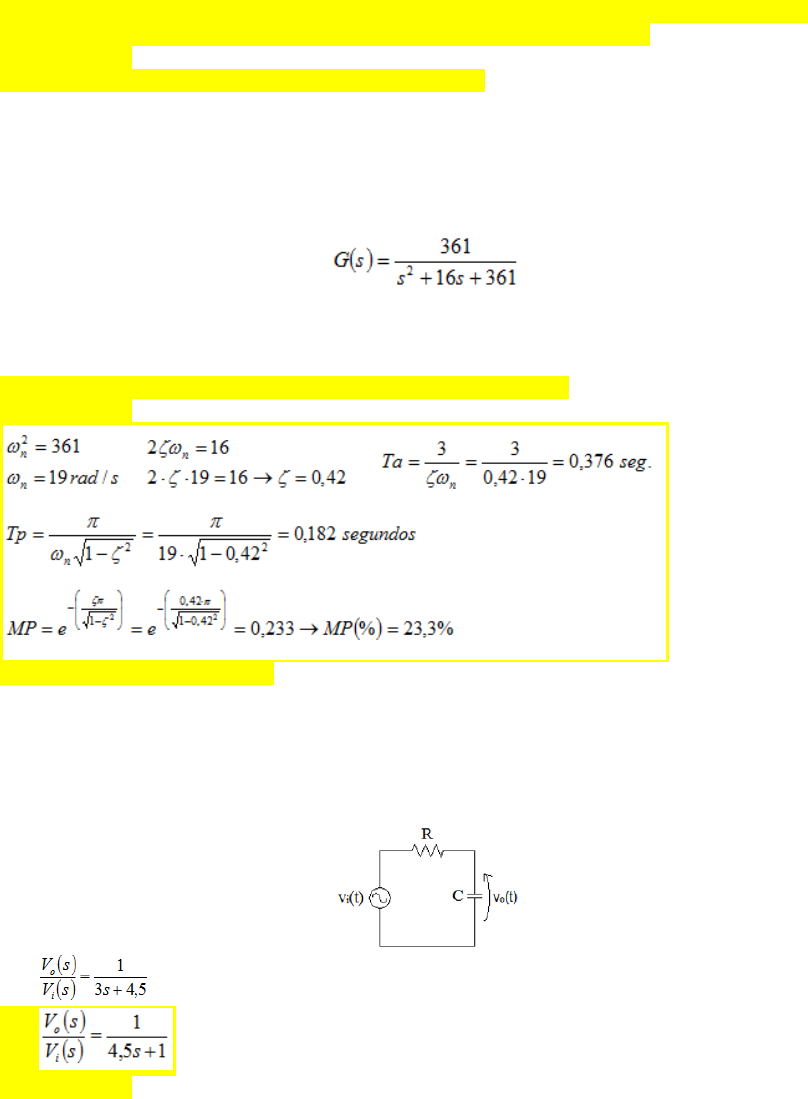 Questão 1/5 - Controle Contínuo Algumas plantas industriais são sistemas de primeira ordem que apresentam uma resposta característica. Um exemplo de plantas de primeira ordem são sistemas térmicos para controle de temperatura utilizando resistências. Considerando um sistema para controle de temperatura conforme descrito no enunciado assinale a alternativa correta. A – Se submetido a uma entrada do tipo degrau unitário, a saída do sistema térmico apresentará um sobressinal. B – A velocidade de resposta depende da posição do polo da planta, quanto mais afastado da origem do plano s, mais lenta será a resposta. C – Os sistemas de primeira ordem podem possuir um polo complexo com parte real e parte imaginária. D – O sistema térmico em questão apresenta uma função de transferência na forma G(s) = B/(s+A), onde A representa o módulo do polo da função de transferência. Você acertou! Resposta na Aula 3, páginas 5 e 6 e Vídeo 2 da aula 3 E – O sistema térmico em questão apresenta uma resposta cujo valor final não depende dos valores de B e A da função de transferência G(s) Questão 2/5 - Controle Contínuo Calcule o tempo do pico, o tempo de acomodação e o sobressinal considerando a função de transferência. considerando uma entrada do tipo degrau unitário. A – Tp = 0,182 segundos; Ta = 0,376 segundos, MP(%) = 12,1% B – Tp = 0,364 segundos; Ta = 0,598 segundos, MP(%) = 23,3% C – Tp = 0,182 segundos; Ta = 0,376 segundos, MP(%) = 23,3% Você acertou! Resposta na Aula 3, página 10 D – Tp = 0,364 segundos; Ta = 0,598 segundos, MP(%) = 12,2% E – Tp = 0,364 segundos; Ta = 0,376 segundos, MP(%) = 12,2% Questão 3/5 - Controle Contínuo No circuito elétrico a seguir, R = 3 ? e C = 1,5 F. Considerando estes valores, obtenha a função de transferência Vo(s)/ Vi(s). A – B – Você acertou! C – D – E – Questão 4/5 - Controle Contínuo Considere o seguinte diagrama de blocos em malha fechada: Determine o valor de Kp para que a resposta do sistema a uma entrada do tipo degrau unitário seja criticamente amortecida. A – 0,25 Você acertou! Resposta na Aula 3, páginas 6, 7, 8 e 9 B – 0,35 C – 0,30 D – 0,90 E – 0,85 Questão 5/5 - Controle Contínuo Um sistema de primeira ordem teve como dados de saída de a uma entrada do tipo degrau unitário os seguintes dados: Terceira constante de tempo: 1,2 segundos Valor em regime permanente: 0,56 Encontre a função de transferência do sistema que possui as características descritas acima. A – B – C – D – E – Você acertou!