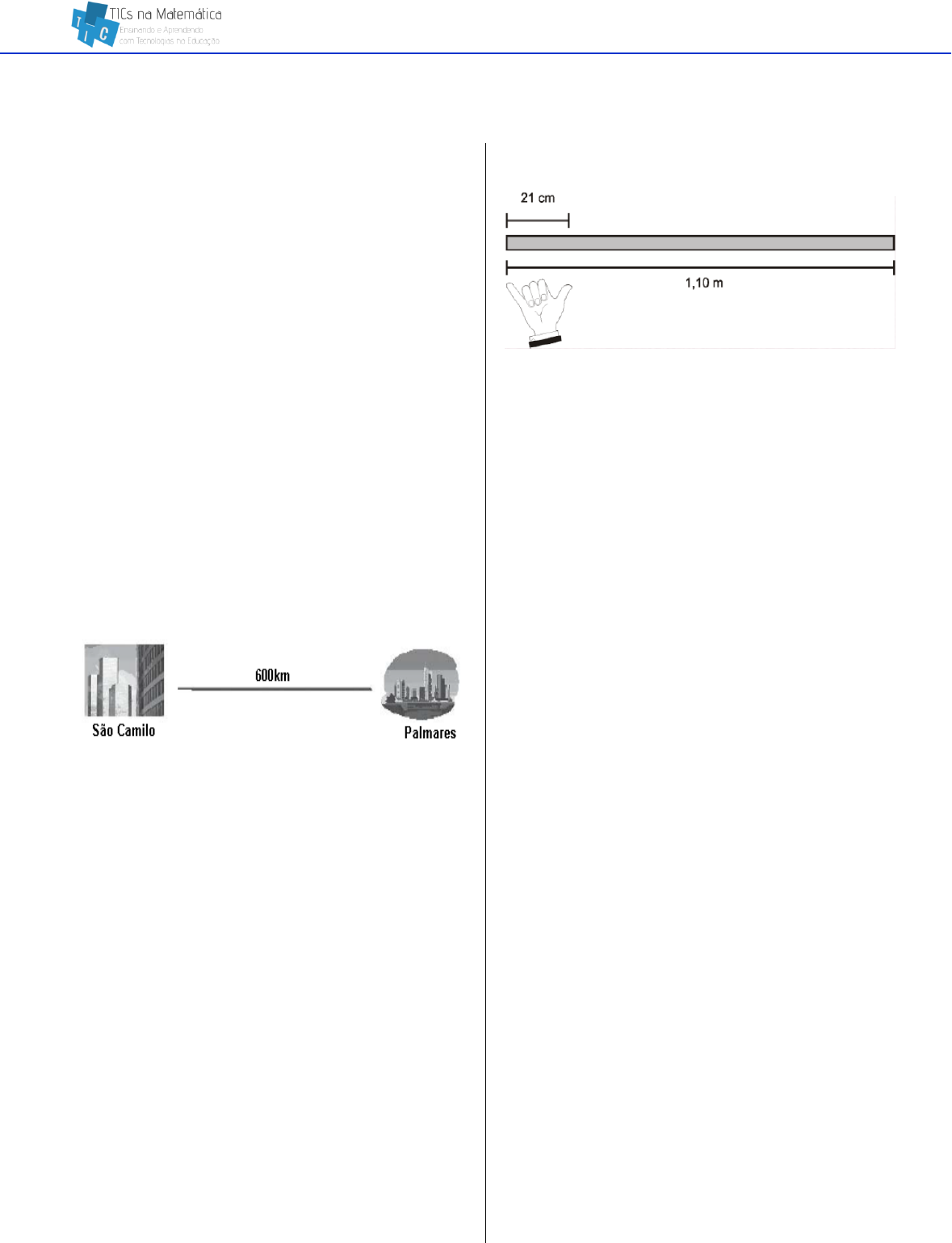 D7 – Resolver problemas significativos utilizando unidades de medida padronizadas como km/m/cm/mm, kg/g/mg, l/ml Questões referentes ao descritor 07 de Matemática do 5º ano Para fazer uma receita, Regina precisa de 1 kg de carne. Ao tirar o pacote de carne da geladeira, vê que ele tem apenas 625 gramas. De quantos gramas de carne ela ainda precisa para fazer a receita? A) 375 gramas. B) 325 gramas. C) 425 gramas. D) 485 gramas. ________________________________________________________ Gilda comprou copos descartáveis de 200 mililitros, para servir refrigerantes, em sua festa de aniversário. Quantos copos ela encherá com 1 litro de refrigerante? (A) 3 (B) 5 (C) 7 (D) 9 ________________________________________________________ Carlos viajou de São Camilo para Palmares. Veja na figura abaixo a distância entre essas cidades. Quantos metros Carlos percorreu nessa viagem? (A) 6.000 metros. (B) 60 000 metros. (C) 600.000 metros. (D) 6.000.000 metros. ________________________________________________________ Alice comprou uma garrafa de refrigerante com 2500 mililitros. Quantos litros de refrigerante ela comprou? (A) 0,25 (B) 2,5 (C) 25 (D) 250 ________________________________________________________ Dona Clara está fazendo bolinhos de 60 g cada um. Quantos desses bolinhos ela fará com 1,2 kg de massa? (A) 20 (B) 50 (C) 72 (D) 200 ________________________________________________________ João quer medir uma tábua e, para isso, está usando seu palmo, que mede 21 cm. Assim sendo, essa tábua deve conter (A) 4 palmos mais 16 cm. (B) exatamente 5 palmos. (C) 5 palmos mais 5 cm. (D) exatamente 6 palmos. ________________________________________________________ O comprimento de uma mesa é de 1m. Quantos palmos aproximadamente mede a mesa se, em média, um palmo tem 22 cm? (A) 4 palmos (B) 4 palmos e meio (C) 5 palmos (D) 5 palmos e meio ________________________________________________________ Em um pacote há 36 balas e cada uma pesa 50 g. Quanto pesa esse pacote, em quilos? (A) 1,8 kg (B) 14 kg (C) 18 kg (D) 86 kg ________________________________________________________ A capacidade média de um copo é de 250 ml de água. Quantos copos podemos encher com 2 litros de água? (A) 4 copos. (B) 6 copos. (C) 8 copos. (D) 10 copos. ________________________________________________________ Utilizei meio metro de cartolina para fazer um desenho. Qual o valor desta medida em centímetros? (A) 65 cm (B) 60 cm (C) 55 cm (D) 50 cm ________________________________________________________ Quantas jarras com capacidade para 1 litro são necessárias para guardar 5 copos com 250 ml de suco? (A) Uma. (B) Duas. (C) Três. (D) Quatro. ________________________________________________________ Em um vaso cabem 3 kg de terra. Quantos sacos de 500g de terra devo comprar para encher este vaso? (A) 6 (B) 8 (C) 10 (D) 12 ________________________________________________________ Para lavar seu carro, Fernanda precisa comprar uma mangueira que vá da bica da varanda de sua casa até a calçada em frente. Essa distância mede 500 centímetros Qual o tamanho ideal de mangueira que ela deve comprar? (A) 1 metro (B) 7 metros (C) 4 metros (D) ½ metro ________________________________________________________ Dona Lúcia foi ao sacolão comprar frutas e legumes. Ela comprou 2.300 gramas de bananas, 1.800 gramas de tangerinas, 1.500 gramas de uvas, 3.200 gramas de batatas e 1.900 gramas de cenouras. Quantos quilogramas (kg) de alimentos Dona Lúcia comprou no total? (A) 8,7 kg (B) 10,7 kg (C) 10.700 kg (D) 8 kg ________________________________________________________ Claudia comprou 2 metros de tecido para fazer um vestido. Podemos afirmar que em 2 m há: (A) 2000 cm (B) 20 cm (C) 2 cm (D) 200 cm ________________________________________________________ Observe a ilustração abaixo e observe o tamanho das chaves. Qual a diferença em centímetros da chave maior para a chave menor? (A) 5 cm (B) 2 cm (C) 8 cm (D) 6 cm ________________________________________________________ Dona Marinalva tem um cachorrinho e ele come por semana aproximadamente 1,4 kg de ração. Esta quantidade equivale a: (A) 140 gramas (B) 1.400 gramas (C) 14 gramas (D) 104 gramas ________________________________________________________ Gabriel foi comprar um refrigerante para o almoço. Ele comprou esta garrafa de 2 litros. Quantos mililitros (ml) de refrigerante há na garrafa? (A) 2 (B) 20 (C) 200 (D) 2.000 ________________________________________________________ Lucas caminha cerca de meio quilômetro para ir à escola todos os dias. Qual a distância que ele caminha em metros? (A) ½ metro (B) 50 metros (C) 100 metros (D) 500 metros ________________________________________________________ Uma das brincadeiras mais antigas de festa junina é o pau de sebo. Um menino resolveu subir no pau de sebo. Primeiro ele subiu 2 m e escorregou meio metro. A que distância ele ficou do chão? (A) 2,5 m (B) 4 m (C) 1,5 m (D) 0,5 m ________________________________________________________ Karine e Mariana adoram brincar de elástico na hora do recreio. Para isso compraram 3 m de elástico. Podemos afirmar que 3 m correspondem a: (A) 3.000 cm (B) 300 cm (C) 3 cm (D) 30 cm ________________________________________________________ Carolina comprou um rolo com 1 metro de fita para embalar alguns presentes. No primeiro presente ela usou 25 centímetros, no segundo ela gastou o dobro do primeiro. Quantos centímetros de fita sobraram? (A) 25 centímetros (B) 75 centímetros (C) 50 centímetros (D) 100 centímetros ________________________________________________________ Antônio é jogador de basquete de um clube. Ele viaja todos os dias 73 km de trem e 15 km de ônibus. A quantos metros correspondem essa distância no total? (A) 73.000 m (B) 860 m (C) 88.000 m (D) 8.800 m ________________________________________________________ Leia a notícia abaixo: A cobra tem 5 metros. Em centímetros, essa medida representa: (A) 5 cm (B) 50 cm (C) 500 cm (D) 5.000 cm _____________________