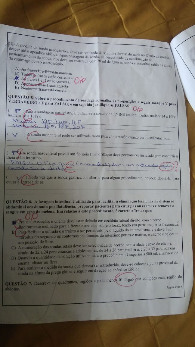 Sobre o procedimento de sondagem nasogástrica, analise as proposições a seguir e marque V para VERDADEIRO e F para FALSO: A) Para homem utiliza-se sonda de LEVINE (calibre médio: 16Fr) e para mulher 14, 16 ou 18Fr. B) A sonda nasoenteral pode ser utilizada tanto para alimentação quanto para medicamentos. C) A sonda nasoenteral possui fio guia (mandril) que deve permanecer instalado para conduzir e evitar entrada de ar. D) Toda vez que a sonda gástrica for aberta para algum procedimento, deve-se dobrá-la. E) Nenhuma frase está correta.