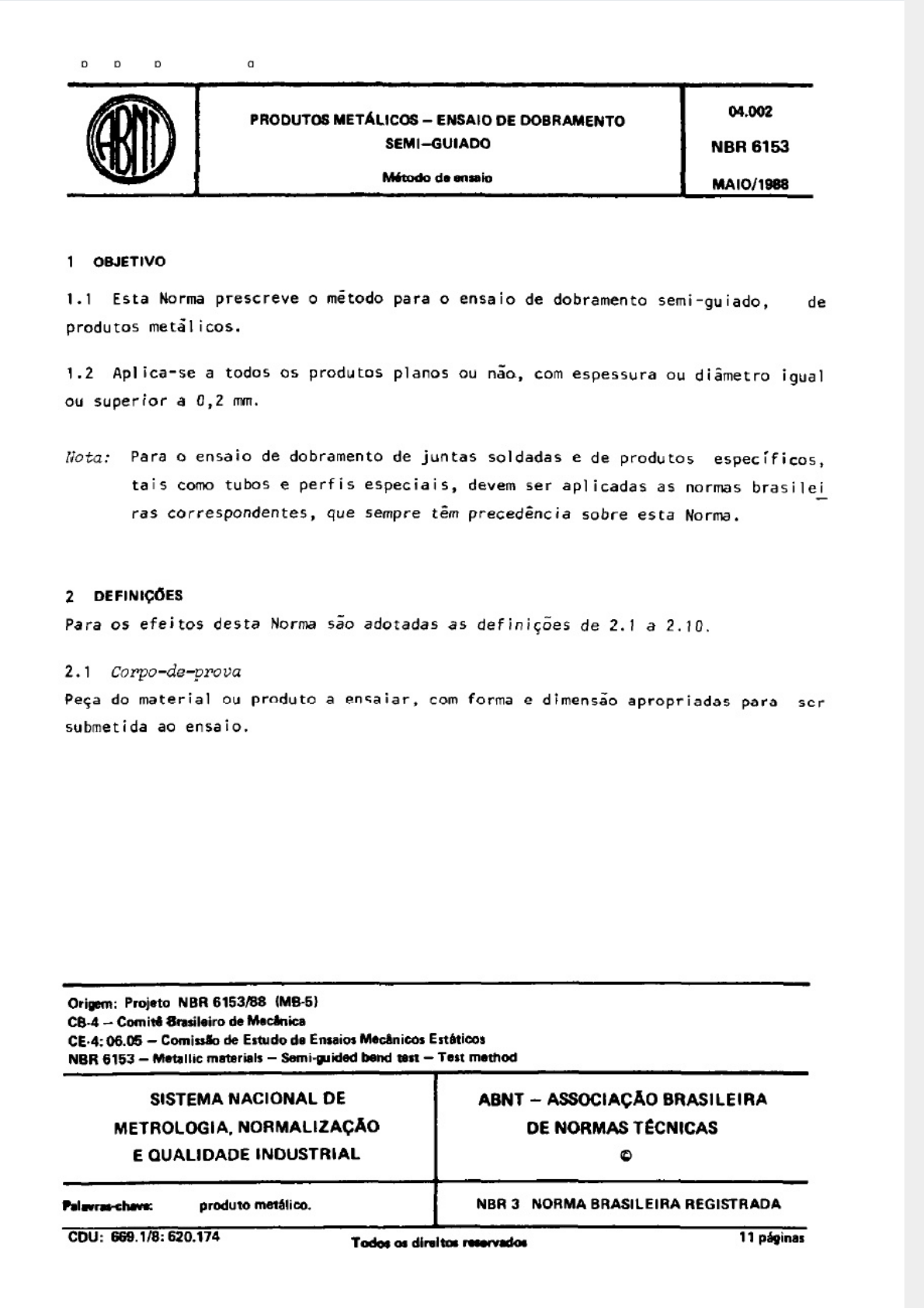 8/3/2019 ABNT6153 http://slidepdf.com/reader/full/abnt6153 1/11 C6pia impressa pelo Sistema CENWIN PRODUTOS METALICOS - ENSAIO DE DOBRAMENTO SEMI-GUIADO 1 ORJETIVO 1.1 Esta Norma prescreve o metodo para o ensaio de dobramento semi-guiado, de produtos metil ices. 1.2 Aplica-se a todos OS produtos planOS ou nk, corn espessura ou dismetro igual ou superior a 0,2 mm. Nota: Para o ensaio de dobramento de juntas soldadas e de produtos especificos, tais coma tubas e perfis especiais, devem ser aplicadas as normas brasilei ras correspondentes, que sempre t;m preced&cia sobre esta Norma. 2 DEFlNlCdES Para OS efeitos desta Norm s& adotadas as definiqoes de 2. I a 2.10. 2. I corpo-de-prom Pega do material ou produto a ensaiar, corn forma e dimens% apropriadas para ser submetida ao ensaio. Origcm: Projeto NBR 6153/88 (MS-51 C&4 - Comitd 8nsileiro de Mw6nii CE.4: 06.05 - Combs& de Estudo da Ensaios Mtinicos Estbticor NBR 6153 -Metallic materials - Semi-glided bend test-Test method SISTEMA NACIONAL DE ABNT - ASSDCIA~AO BRASILEIRA METROLDGIA. NORMALIZACAO DE NORMAS TECNICAS E QUALIDADE INDUSTRIAL 8 PhWmhWDZ produn, met8lico. I NBR 3 NORMA BRASILEIRA REGISTRADA CDU: 669.118: 620.174 Todoe oa dinlta muwda 11 p&ginas Licença de uso exclusivo para Petrobrás S/A Có ia im ressa elo Sistema Tar et CENWeb 8/3/2019 ABNT6153 http://slidepdf.com/reader/full/abnt6153 2/11 C6pia impressa pelo Sistema CENWIN 9 NBR 615311988 2.2 Esspessum do corpo-de-prom2 (621 flaior dimens& de sua seqao transvwsal, medida antes do ensaio, em direG:o nor mal ao ei xo de dobrarnento (ver Figura 1). b FIGURA 1 2.3 L-hzw%ro c?? corym-deprom Cd) Dia^metro da segao transversal circular ou dia^mtro do circulo inscrito das se@+. transversais poligonais (ver Figura 2). FIGURA 2 2.4 Largura do corpo-de-;7rom Ibl Maior dirwnsao de sua segao transversal, Edida antes do ensaio, em dirqao parale .- la ao eixo de dobramento (ver Figura I). 2.5 Intermlo entre apoios CL) Interval” entre OS apoios do corpo-de-prova ou a abet-turd do dispositivo corn perfis em U ou V (ver Figura 3) /FlGURA 3 Licença de uso exclusivo para Petrobrás S/A Cópia impressa pelo Sistema Target CENWeb 8/3/2019 ABNT6153 http://slidepdf.com/reader/full/abnt6153 3/11 C6pia impressa pelo Sistema CENWIN NBR 6153/1988 3 FIGURA 3 2.6 &quto de dobramto (al Suplemento do hgulo formado pelos eixos das parts retilineas do corpo-de-prova dobrado (hgulo AOB) (ver Figura 4) FIGURA 4 2.7 MO do cuteto (RI Raio da borda de ataque do cutelo, do rolete ou do pino usado corpo-de-prow (ver Figura 5) “0 dobramnto do FIGURA 5 Licença de uso exclusivo para Petrobrás S/A Cópia impressa pelo Sistema Target CENWeb 8/3/2019 ABNT6153 http://slidepdf.com/reader/full/abnt6153 4/11 C6pia impressa pelo Sistema CENWIN . NBR 6153IlWB fbio interior da dobra do corpo-de-prova ao final do doliramento,sob forsa de com press% (ver Fi gura 4). 2.9 ~atp de dobmmnto Calgo utilizado para regular a dFst%cia entre as dues superficies faciais para lelas internas do corpo-de-prova. no dobramento d l8ao conforma a especificagao do produto (ver Figura 6). FIGURA 6 2.10 Gzrga Forga de ensaio. 3 APARELHAGEM 3.1 Us ensaios devem ser executados em &quinas ou dispositivos apropriados corn as seguintes caracterlsticas e recursos: a) controle de velocidade de aplicagao de carga; b) cutelos e apoios corn dihetro ou raios das partes arredondadas,condizentes corn as exighcias de especificagao do produto a ensaiar; c) pratos paralelos sem articulagao; d) guias em U, em V ou especiais, cujas arestas de atrito corn o corpo-de-prova devem ser arrecbndadas; e) jogo de calsos de dobramnto de variadas espessuras, conforme especifica$oes de orodutos a ensaiar. 3.2 OS pratos, cutelos e apoios recomendados devem ser de material corn dureza na faixa entre 700 HV e 800 HV (60 HRC a 64 HRC). Licença de uso exclusivo para Petrobrás S/A Cópia impressa pelo Sistema Target CENWeb 8/3/2019 ABNT6153 http://slidepdf.com/reader/full/abnt6153 5/11 Copia impressa pelo Sistema CENWIN NBR 616311988 6 4 EXECU@G W ENSAl 4.1 tire$o de dobmnmto No case de msteriais laminados ou forjados, o dobramento pode ser longitudinal ou tranversal em relagso 5 diregso de laminaga’o ou forJamento (Figuras 7 e 8 , respectivamente). FIGURA 7 FIGURA 8 Note: As setas indicam a dlresSo de lamlna$so. 4.2 corpo8-deprolkz 4.2.1 A amostragem e a preparaga’o dos corpos-de-prova devem obedecer ss normas do produto a ensaiar. 4.2.2 As dimens;es dos corpos-de-prova, quando na’o especificadas, devem estar compreendidas entre 200 mn e 500 nm de comprimento e entre 20 mn e 50 mm de largura ou dismetro. 4.2.2.1 A espessura do corpo-de-prova deve ser menor ou igual 5 sua largura, e quando nio especlficado, fica estlpulada em 20 mm para produtos semi-acaba - dos e pegas forjadas. Para chapas e perfis, a espessura i sempre que possivel a do pr6prio produto a ensaiar. Caso a espessura do produto seja maior do que a largura estipulada para o corpo-de-prova, desbastar este por usinagem I-lUilM das faces at; que sejam satisfeitas as condig6es acima, deixando a outra face corn sua superficie original, a qua1 no ensaio, deve obrigatoriamente ser a fa ce externa do corpo-de-prova dobrado. 4.2.2.2 0 dlkretro do corpo-de-prova, sempre que posslvel, deve ser o da pr6 pria barra, no case de segso circular, ou o dismetro do circulo inscrlto , no case de segzo poligonal. e nzo exceder 50 mm. No case do dismetro do produto ser maior que 50 mn, usinar o corpo-de-prova para urn valor compreendido entre 20 mn e 50 mn (Figuras 9 e lo), tendo o cuidado de deixar no corpo-de-provausl nado uma parte da superficie original da barra, a qual, no ensalo, deve obriga toriamente ficar voltada para o lado externo da dobra. Licença de uso exclusivo para Petrobrás S/A Cópia impressa pelo Sistema Target CENWeb 8/3/2019 ABNT6153 http://slidepdf.com/reader/full/abnt6153 6/11 C6pia impressa pelo Sistema CENWIN 6 NBR 5153/1888 N&u: As Figuras 3 e 4 correspondem respectivamente as barras de segzes circular
