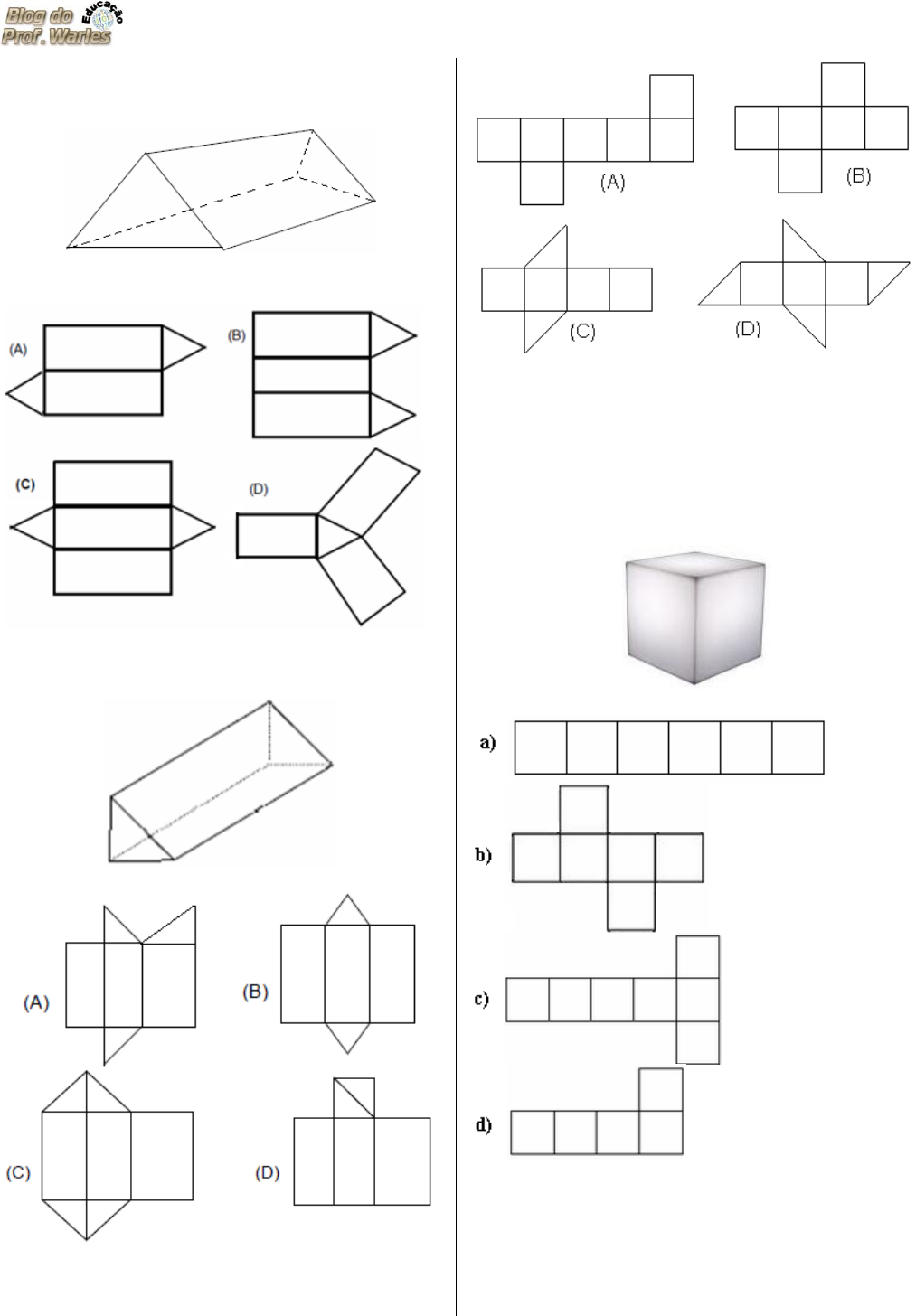 D2 - Identificar propriedades comuns e diferenças entre figuras bidimensionais e tridimensionais, relacionando-as com suas planificações. (Prova Brasil). É comum encontrar em acampamentos barracas com fundo e que têm a forma apresentada na figura abaixo. (☻☻) Qual desenho representa a planificação dessa barraca? ******************************************** (Prova Brasil). O desenho abaixo representa um sólido. (☻☻) Qual é a planificação deste sólido. *************************************** Observe as figuras abaixo: Entre elas, a planificação de uma caixa em forma de cubo é a figura; (A) A (B) B (C) C (D) D ************************************************** Uma embalagem tem o formato de um cubo, como mostra a figura abaixo: Uma possível planificação desta embalagem é: ************************************************** A fazer um molde de um copo, em cartolina, na forma de cilindro de base circular qual deve ser a planificação do mesmo. *************************************************** Observe a representação de um tetraedro regular. Qual das seguintes planificações é a desse tetraedro regular? Resp. B ***************************************** Glória quer fazer um molde para construir caixas sem tampa, em forma de bloco retangular. Como mostra a figura abaixo. (☻☻) Para obter o molde, ela desmontou a caixa. O desenho que representa essa caixa desmontada é: Resp. A. *************************************** (SPEACE). Observe o dado representado pela figura abaixo. Que planificação corresponde a esse dado? Res. C ****************************************************** (SPAECE). A figura abaixo representa um cubo em que as faces opostas têm o mesmo símbolo. A planificação correta desse cubo é: Resp. C *************************************** Na aula de geometria, Letícia fez um molde para construir um poliedro, como mostra a figura abaixo. Qual poliedro Letícia poderá construir com esse molde? A) Uma pirâmide. B) Um paralelepípedo. C) Uma esfera. D) Um cubo. ******************************************************* (SPAECE). Observe, abaixo, a representação de um prisma e sua respectiva planificação, em que as faces estão numeradas. Nessa planificação, os pares de faces paralelas são A) 1 e 2, 4 e 6, 5 e 8. B) 1 e 2, 6 e 8, 7 e 4. C) 2 e 3, 4 e 7, 5 e 8. D) 3 e 6, 4 e 7, 5 e 8. *************************************** (PROEB). Observe o bloco retangular representado no desenho. Dentre as planificações abaixo, a que corresponde à planificação desse bloco retangular é: Resp. B *************************************** (SIMAVE). Veja a planificação do poliedro abaixo. Quantas arestas esse poliedro possui? A) 5 B) 7 C) 8 D) 12 ************************************** A figura abaixo representa a planificação de um sólido geométrico. Qual é esse sólido? A) Pirâmide da base hexagonal B) pirâmide de base triangular C) Prisma de base hexagonal D) Prisma de base triangular *************************************** Veja o prisma reto abaixo. A planificação desse prisma é Resp. D ************************************** Observe esta figura: Para construir uma caixa fechada com a forma desse poliedro, Marina precisa recortar algumas figuras geométricas em papelão e colar umas às outras usando fita adesiva. Então, as figuras que Marina precisa recortar são, no mínimo, (A) 1 triângulo e 2 retângulos. (B) 1 triângulo e 3 retângulos. (C) 2 triângulos e 2 retângulos. (D) 2 triângulos e 3 retângulos. ************************************** (PB 2011). Uma empresa confecciona embalagens para acondicionar um determinado produto. Veja a planificação desta embalagem abaixo. A embalagem depois de pronta é ******************************************************* (PB 2011). Juliana fez algumas figuras planas em papel cartão, como mostra abaixo. Ao juntar todas essas partes forma o sólido chamado (A) cone (B) prisma (C) cilindro (D) pirâmide *************************************** (PB – 2011). Um dado (cubo) foi desmontado da seguinte forma: Qual das letras é oposta a letra T quando montar o dado (cubo). (A) P (B) R (C) V (D) U *************************************************** (Saresp 2002). Observe os diferentes tipos de caixas utilizadas por uma loja de presentes: (☻☻) A vendedora monta de acordo com a escolha do cliente. Se ela utilizar os modelos que aparecem abaixo, vai obter caixas do tipo: (A) 4 e 1 (B) 3 e 4 (C) 2 e 3 (D) 1 e 2 ************************************************* (Saresp 2005). Abaixo estão desenhadas as vistas superior e frontal de uma figura. (☻☻) Dentre as opções abaixo, a única figura com essas vistas é: ****************************************************** (Saresp 2005). Bia montou a figura abaixo e, em seguida, fez uma colagem para obter um sólido de papelão. O sólido que Bia obteve foi: ******************************************************* (Saresp 2007). Melissa fez uma caixinha para guardar seus brincos. A planificação da caixinha está representada na figura abaixo. Como ficou a caixinha de Melissa depois de colada? ******************************************************* 1