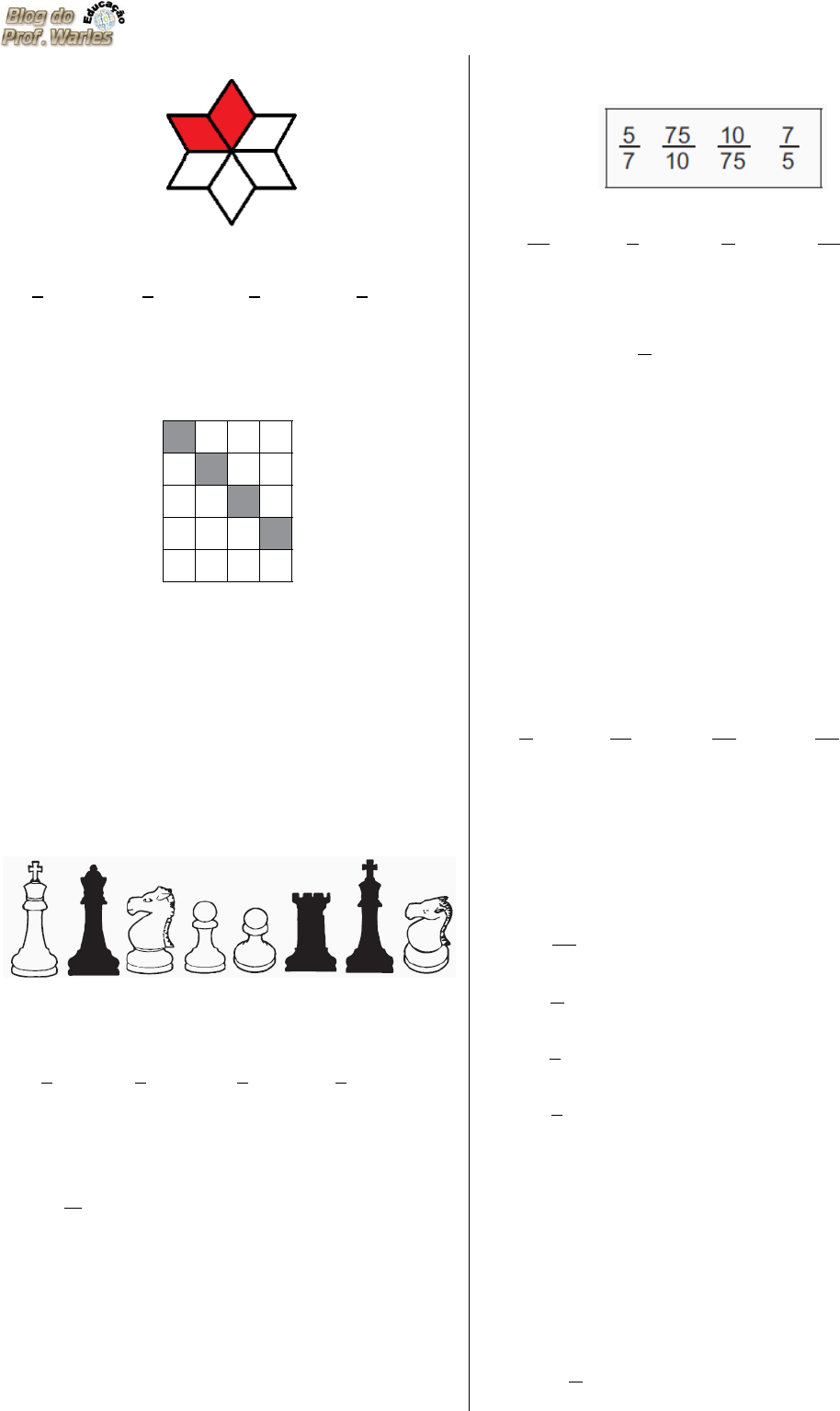 D24 - Identificar fração como representação que pode estar associada a diferentes significados. (SAEP 2013). Observe a figura abaixo. A fração que corresponde à parte colorida na figura acima é A) B) C) D) ----------------------------------------------------------------------- (SAEGO). O retângulo abaixo foi dividido em 20 quadradinhos iguais. Qual é a fração correspondente ao número de quadradinhos coloridos de cinza em relação ao total de quadradinhos que esse retângulo foi dividido? A) 4/20 B) 4/16 C) 16/20 D) 20/4 ----------------------------------------------------------------------- (SAEPI). Observe abaixo o desenho de algumas peças de um jogo de xadrez. Qual é a fração que representa a quantidade de peças pretas em relação ao número total de peças desse desenho? (A) (B) (C) (D) ----------------------------------------------------------------------- (PAEBES). José foi ao aniversário de seu primo e comeu dos docinhos que foram servidos. De que outra maneira essa fração pode ser representada? A) 3,3 B) 3 C) 0,3 D) 0,03 ----------------------------------------------------------------------- (SPAECE). Observe as frações abaixo. Qual dessas frações representa o número decimal 7,5? (A) (B) (C) (D) ----------------------------------------------------------------------- Ana fez suco com das laranjas que comprou. Qual foi a porcentagem de laranjas que Ana usou para fazer esse suco? A) 50% B) 40% C) 25% D) 10% ----------------------------------------------------------------------- Um dia tem 24 horas, 1 hora tem 60 minutos e 1 minuto tem 60 segundos. Que fração da hora corresponde a 35 minutos? (A) (B) (C) (D) ----------------------------------------------------------------------- Sara fez um bolo para seus filhos e o repartiu em 24 pedaços iguais. João comeu 3 pedaços, Pedro comeu 4, Marta comeu 5 e Jorge não comeu nenhum pedaço. Que parte do bolo foi consumida? (A) (B) (C) (D) ----------------------------------------------------------------------- Nas provas finais do 2º bimestre da Escola Municipal um aluno obteve o seguinte resultado: Matemática: 8 questões corretas em 10. A fração que corresponde às questões corretas na prova de matemática é: (A) (B) (C) (D) ----------------------------------------------------------------------- (Prova Brasil). Das 15 bolinhas de gude que tinha, Paulo deu 6 para o seu irmão. Considerando-se o total de bolinhas, a fração que representa o número de bolinhas que o irmão de Paulo ganhou é (Resp. A) ----------------------------------------------------------------------- (Saresp-2010). As partes sombreadas na figura abaixo representam que fração do todo? A) B) C) D) ----------------------------------------------------------------------- Em uma classe, há 16 meninas e 20 meninos. Que fração do total de alunos dessa classe as meninas representam? A) B) C) D) ----------------------------------------------------------------------- Renata trouxe um bolo para comemorar o seu aniversário com os colegas de turma. Ela dividiu o bolo em 10 pedaços iguais e distribuiu 7 pedaços para os colegas. (Resp. B) Que parte do bolo Renata deu para os colegas? ----------------------------------------------------------------------- Eva recebeu os amigos para a abertura da Copa do Mundo. Ela preparou uma pizza para o lanche e a dividiu em 4 pedaços iguais. Durante o intervalo foram consumidos 3 pedaços da pizza. A fração que representa os pedaços da pizza que foram consumidos é (REsp. B) ----------------------------------------------------------------------- Saul ganhou figurinhas para colar em seu álbum. Um quinto das figurinhas vieram repetidas! A fração que também representa o número de figurinhas repetidas é (Resp. A) (A) . (B) . (C) . (D) . ----------------------------------------------------------------------- Observe esta figura: A parte pintada representa que fração da figura toda? (A) (B) (C) (D) ----------------------------------------------------------------------- (PB – 2011). Joãozinho gosta construir pipas. Para a pipa acima, ele pintou uma parte de cinza. A parte pintada é (A) (B) (C) (D) ----------------------------------------------------------------------- (PB 2011). A fração da parte colorida da figura é (A) (B) (C) (D) ----------------------------------------------------------------------- (Saresp). Observe a figura: A fração que representa a parte pintada em relação ao total é (A) (B) (C) (D) ----------------------------------------------------------------------- (Saresp 2010). Considerando as partes pintadas, a figura que corresponde à fração é: (Resp. C) ----------------------------------------------------------------------- (Prova da cidade 2009). Márcia fez um bolo e usou meio “quilo” de farinha de trigo. A quantidade de farinha de trigo usada por Márcia pode ser representada pelo número (A) (B) (C) (D) ----------------------------------------------------------------------- (Prova da cidade 2009). Jorge coloriu de cinza de acordo com malha quadriculada abaixo. A fração parte cinza da malha corresponde a: (A) (B) (C) (D) ----------------------------------------------------------------------- (Prova da cidade 2009). Ana fez uma torta de chocolate. A torta foi dividida em 12 pedaços iguais. Ela deu 7 pedaços para sua vizinha e ficou com o restante. Que fração do total representa os pedaços de torta que restaram para Ana? (A) (B) (C) (D) ----------------------------------------------------------------------- (Projeto consequir – DC) Um sorveteiro colocou em seu carrinho 4 tipos de sorvetes e foi vendê-los na vizinhança. No total, ele conseguiu vender METADE dos sorvetes. Observe a fração que representa esta venda: Qual das frações abaixo também pode representar a quantidade vendida de sorvetes? (Resp. C) ----------------------------------------------------------------------- (Projeto consequir – DC) Mariana comprou tecido para sua fantasia de ca