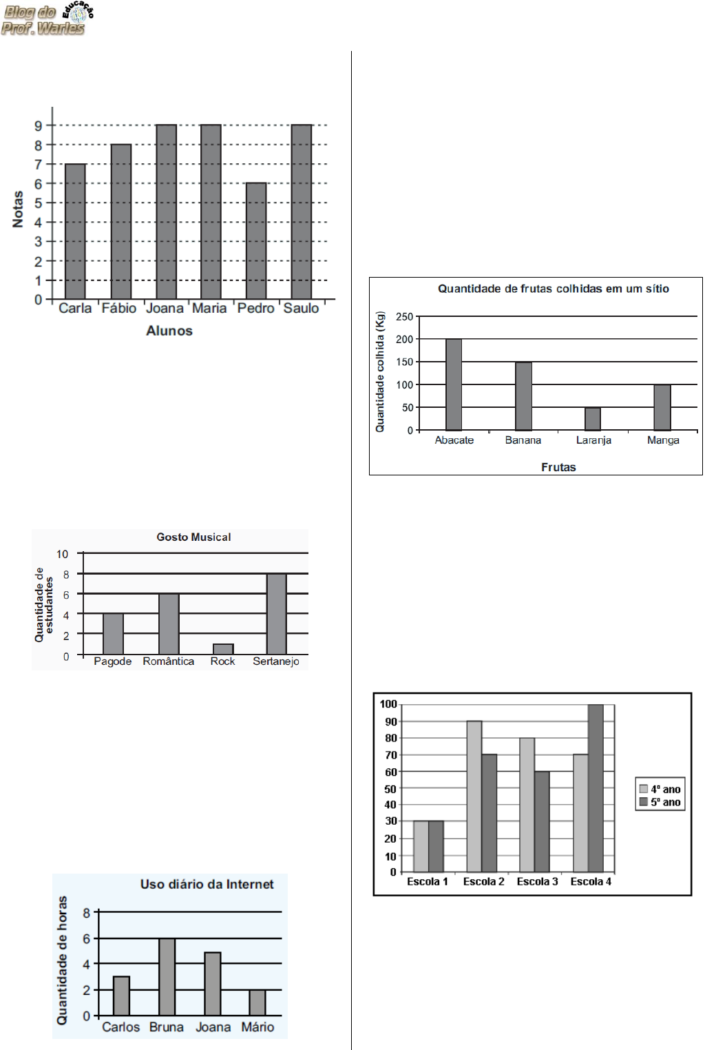 D28 - Ler informações e dados apresentados em gráficos (particularmente em gráficos de colunas). ------------------------------------------------------------------ (SAEP). Observe no gráfico abaixo as notas de alguns alunos do 4º ano. Qual desses alunos tirou nota 7? A) Carla. B) Fábio. C) Joana. D) Saulo. ------------------------------------------------------------------ (PAEBES). Observe no gráfico abaixo o resultado de uma pesquisa realizada no 5º ano de uma escola sobre a preferência por estilos musicais. De acordo com esse gráfico, qual é o estilo musical escolhido pela maior quantidade de estudantes dessa turma? A) Pagode. B) Rock. C) Romântica. D) Sertanejo. ------------------------------------------------------------------ (PAEBES). Observe no gráfico abaixo a quantidade de horas diárias que quatro adolescentes usam a internet. De acordo com esse gráfico, qual dos quatro adolescentes usa a internet por mais tempo em um dia? A) Bruna. B) Carlos. C) Joana. D) Mário. ------------------------------------------------------------------ (SEAPE). No gráfico abaixo está representada a quantidade de frutas, em quilogramas, colhidas em um sítio no mês de outubro. De acordo com esse gráfico, quantos quilogramas de laranja foram colhidos nesse sítio no mês de outubro? A) 50 B) 100 C) 150 D) 200 ------------------------------------------------------------------ (SIMAVE). No gráfico abaixo são apresentados dados sobre o número de alunos do 4° e do 5° ano de quatro escolas. Em qual dessas escolas há o maior número de alunos no 4° ano? A) Escola 1. B) Escola 2. C) Escola 3. D) Escola 4. ------------------------------------------------------------------ (PROEB). A escola “Quatro Estações” realizou eleições para escolher os representantes de turma. A professora Mara, da turma do terceiro ano, registrou os votos de cada um dos candidatos no gráfico abaixo: Quem ganhou a eleição nessa turma do terceiro ano? A) Mônica B) Márcia C) Maurício D) Marcelo ------------------------------------------------------------------ O gráfico abaixo mostra a quantidade de pontos feitos pelos times A, B, C e D no campeonato de futebol da escola. De acordo com o gráfico, quantos pontos o time C conquistou? (A) 50 (B) 40 (C) 35 (D) 30 ------------------------------------------------------------------ No final do ano os alunos do 5º ano fizeram uma pesquisa na sala para saber onde cada um ia passar as férias. Cada aluno podia escolher um só lugar. O gráfico mostra o resultado da pesquisa. Qual dos locais foi o menos escolhido pelos alunos para passarem as férias? (A) Casa. (B) Fazenda do tio. (C) Praia. (D) Sítio da vovó. ------------------------------------------------------------------ Os estudantes do 5º ano realizaram uma entrevista com quatro turmas da escola para verificar que profissões os estudantes desejam seguir futuramente. Observe o gráfico abaixo que representa o resultado dessa pesquisa. Nessa pesquisa, qual foi a profissão mais escolhida? (A) Advogado. (B) dentista (C) médico (D) professor ------------------------------------------------------------------ (SPAECE). O gráfico abaixo mostra a quantidade de alunos de uma escola, de 1ª a 4ª série. Quantos alunos têm essa escola? A) 12 B) 15 C) 48 D) 50 ------------------------------------------------------------------ Este gráfico apresenta o perfil de altitude de alguns dos morros da cidade do Rio de Janeiro. O número de metros que o Morro Pão de Açúcar tem a mais que o seu vizinho, Morro da Urca, é de (A ) 176 m. (B) 196 m. (C) 314 m. (D) 490 m. ------------------------------------------------------------------ Os alunos de uma escola participaram de uma campanha solidária para arrecadar roupas, mantimentos e água potável para os desabrigados das enchentes no Nordeste. Observe o gráfico. A semana em que a turma A conseguiu arrecadar mais de 60 itens, foi a (A) 1ª semana. (B) 2ª semana. (C) 3ª semana. (D) 4ª semana. ------------------------------------------------------------------ Observe o gráfico. Ele apresenta o número de alunos que participam dos Jogos Estudantis organizados entre várias escolas. O esporte que está com o maior número de alunos inscritos é o (A) atletismo. (B) basquete. (C) handebol. (D) voleibol. ------------------------------------------------------------------ A turma de Luis está estudando sobre os bairros da cidade do Rio de Janeiro. À medida que os bairros são estudados, eles colocam os dados coletados em gráficos. Observe o gráfico com o número aproximado de habitantes de alguns bairros já pesquisados pela turma de Luis. De acordo com este gráfico, o bairro que, aproximadamente, tem a população 3 vezes maior que a população de Madureira é (A) Vargem Grande. (B) São Cristóvão. (C) Copacabana. (D) Campo Grande. ------------------------------------------------------------------ (Saresp 2007). O gráfico abaixo mostra a quantidade de chuva em uma cidade nos meses de janeiro a junho. Observando o gráfico, podemos afirmar que: (A) Janeiro foi o mês com a menor quantidade de chuva. (B) Em fevereiro choveu mais do que em abril. (C) A diferença entre a quantidade de chuva dos meses de março e de junho foi de 500 litros. (D) O mês de março foi o mês em que mais choveu. ------------------------------------------------------------------ (Saresp 2007). O gráfico abaixo mostra a quantidade de árvores de um sítio. Quantas árvores estão plantadas nesse sítio? (A) 39 (B) 38 (C) 29 (D) 26 ------------------------------------------------------------------ (Saresp). O gráfico abaixo mostra a venda de caixas de papelão de uma fábrica de embalagens no primeiro semestre de 2005. A diferença entre a quantidade de caixas vendidas nos meses de maior e de menor venda foi: (A) 7065 caixas (B) 1271 caixas (C) 631 caixas (D) 288 caixas ------------------------------------------------------------------ (Prova da cidade 2009). Os alunos de uma turm