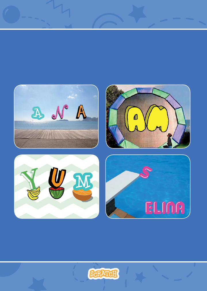 1Animate Your Name Anime as letras do seu nome, suas iniciais ou palavra favorita. Cartões Anime um Nome scratch.mit.edu Conjunto de 7 cartões 2Animate Your Name Cartões Anime um Nome scratch.mit.edu Conjunto de 7 cartões Use estes cartões na ordem que preferir: • Mude a cor ao clicar • Gire • Reproduza um som • Faça uma letra dançar • Altere o tamanho • Pressione uma tecla • Deslize 3Animate Your Name 1 Faça uma letra mudar de cor quando você clicar nela. Mude a cor ao clicar Anime um Nome scratch.mit.edu ADICIONE ESTE CÓDIGO Experimente números diferentes. TESTE Clique na sua letra. Mude a cor ao clicar PREPARE-SE Escolha uma letra na Biblioteca de Atores. scratch.mit.edu Escolha um cenário. Boardwalk Para ver apenas as letras, clique na categoria Letras na parte superior da Biblioteca de Atores. Animate Your Name 2 Faça uma letra girar quando você clicar nela. Gire Anime um Nome scratch.mit.edu PREPARE-SE Gire ADICIONE ESTE CÓDIGO Experimente números diferentes. TESTE Clique na sua letra. DICA Clique neste bloco para redefi nir a direção do ator. scratch.mit.edu Vá para a Biblioteca de Atores. Clique na categoria Letras Escolha uma letra. Animate Your Name 3 Clique na letra para reproduzir um som. Reproduza um som Anime um Nome scratch.mit.edu PREPARE-SE Reproduza um som ADICIONE ESTE CÓDIGO Escolha um som. TESTE Clique na guia Código. Clique na guia Sons. Escolha um cenário. scratch.mit.edu Boardwalk Escolha um som no menu. Clique na sua letra. Vá para a Biblioteca de Atores. Clique na categoria Letras Escolha uma letra. Animate Your Name 4 Faça uma letra se mover conforme o ritmo. Faça uma letra dançar Anime um Nome scratch.mit.edu PREPARE-SE Faça uma letra dançar ADICIONE ESTE CÓDIGO Você pode escolher outro som no menu. Use o sinal de menos para o ator se mover para trás. Clique em Adicionar uma Extensão (no canto inferior esquerdo). Em seguida, clique em Música para adicionar blocos de música. Escolha um cenário. Escolha uma letra na Biblioteca de Atores. Stage TESTE Clique na sua letra. Animate Your Name 5 Faça uma letra aumentar de tamanho e depois diminuir. Altere o tamanho Anime um Nome scratch.mit.edu PREPARE-SE Altere o tamanho ADICIONE ESTE CÓDIGO TESTE Clique na sua letra. Use o sinal de menos para diminuir o tamanho. DICA Clique neste bloco para redefi nir o tamanho. scratch.mit.edu Vá para a Biblioteca de Atores. Clique na categoria Letras Escolha uma letra. Animate Your Name 6 Pressione uma tecla para a letra mudar. Pressione uma tecla Anime um Nome scratch.mit.edu PREPARE-SE Pressione uma tecla ADICIONE ESTE CÓDIGO TESTE DICA Você pode escolher outra tecla no menu. Depois, pressione essa tecla! Experimente números diferentes. Escolha um cenário. Escolha uma letra na Biblioteca de Atores. scratch.mit.edu Wall 1 Pressione a tecla espaço. Animate Your Name 7 Faça uma letra deslizar suavemente de um lugar para outro. Deslize Anime um Nome scratch.mit.edu ADICIONE ESTE CÓDIGO TESTE DICA Clique na sua letra para começar. Quando você movimenta um ator, sua posição x e y é alterada. x é a posição da esquerda para a direita. y é a posição de cima para baixo. PREPARE-SE Deslize Experimente números diferentes. Escolha um cenário. Escolha uma letra na Biblioteca de Atores. scratch.mit.edu Jurassic scratch.mit.edu Conjunto de 8 cartões Use a animação para dar vida a seus atores. Cartões Anime um Ator Use estes cartões na ordem que preferir: • Movimente o ator com as setas do teclado • Faça um ator pular • Defi na uma tecla de ação • Deslize de um ponto a outro • Faça um ator andar • Faça um ator voar • Faça um ator falar • Desenhe uma animação Cartões Anime um Ator scratch.mit.edu Conjunto de 8 cartões Dance Party! Movimente o ator com as setas do teclado Use as setas do teclado para mover seu ator pelo palco. 1Anime um Ator scratch.mit.edu Movimente o ator com as setas do teclado PREPARE-SE ADICIONE ESTE CÓDIGO Escolha um ator.Soccer 2Escolha um cenário. Pico Walking Altere o valor de x Mova seu ator de um lado para outro. Altere o valor de y Mova seu ator para cima e para baixo. Use o sinal de menos para o ator se mover para baixo. Use o sinal de menos para o ator se mover para a esquerda. TESTE Pressione as setas do teclado para fazer seu ator se mover. 2Anime um Ator Faça um ator pular Pressione uma tecla para pular para cima e para baixo. scratch.mit.edu Faça um ator pular PREPARE-SE ADICIONE ESTE CÓDIGO TESTE Escolha um ator. Blue SkyEscolha um cenário. Giga Walking Use o sinal de menos para o ator voltar para baixo. Giga Walking Pressione a tecla espaço em seu teclado. Defi na a altura do pulo. Dance Party!3Anime um Ator Defina uma tecla de ação Faça seu ator se mover quando você pressionar uma tecla. scratch.mit.edu Defi na uma tecla de ação PREPARE-SE ADICIONE ESTE CÓDIGO Escolha uma fantasia. Clique na guia Código. Escolha um ator com várias fantasias, como Max. Max TESTE Clique na guia Fantasias para ver as outras fantasias do seu ator. (Alguns atores têm apenas uma fantasia). Escolha uma fantasia diferente. Max Pressione a tecla espaço em seu teclado. Dance Party!Dance Party!4Anime um Ator Deslize de um ponto a outro Faça um ator deslizar de um ponto a outro scratch.mit.edu Deslize de um ponto a outro PREPARE-SE ADICIONE ESTE CÓDIGO Escolha um ator.NebulaEscolha um cenário. Rocketship Defi na a posição inicial. Insira outro ponto para onde vai deslizar. Defi na o ponto fi nal. Quando você arrasta um ator, as posições x e y são atualizadas na paleta de blocos. WizardRocketship TESTE Clique na bandeira verde para iniciar. DICA Dance Party!Dance Party!5Anime um Ator Faça um ator andar Anime um ator fazendo-o andar ou correr. scratch.mit.edu Faça um ator andar PREPARE-SE ADICIONE ESTE CÓDIGO Escolha um ator para andar ou correr. JungleEscolha um cenário. Unicorn Running Unicorn Running TESTE Clique na bandeira verde para iniciar. DICA Caso q