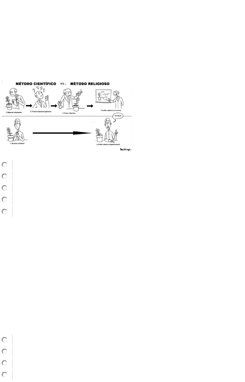 1. De acordo com a charge, podemos entender que: I. O método científico tem mais etapas do que o religioso, sendo, portanto, mais exato. II. O método religioso procura se abster das investigações, atribuindo todas as explicações para Deus. III. Há uma crítica ao conhecimento religioso, que pode ser percebida também ao observar o semblante dos personagens. A I e a III estão corretas Todas estão corretas. (Alternativa correta) A II e a III estão corretas Nenhuma está correta A I e II estão corretas 2. 4. Observando o texto a seguir, responda: qual tipo de conhecimento foi utilizado na definição de água: Este líquido é água. Quando pura é inodora, insípida e incolor. Reduzida a vapor, sob tensão e a alta temperatura, move os êmbolos das máquinas que, por isso, se denominam máquinas de vapor. É um bom dissolvente. Embora com exceções mas de um modo geral, dissolve tudo bem, bases e sais. Congela a zero graus centesimais e ferve a 100, quando à pressão normal. Senso comum. Conhecimento filosófico Conhecimento teológico. Conhecimento científico (Alternativa correta) Conhecimento popular 3. Sobre a palavra conhecimento, assinale a única incorreta: É uma ação natural, ocorrendo por meio da observação, assimilação de crenças religiosas, sentimentos, motivações, ocorridos de modo dinâmico, sendo formal ou informal. O termo deriva do latim, sendo composto de cune+noscere= cognoscere, significando “procurar saber”, “junto/com o saber”. O ato de conhecer possibilita a ação e o controle. É uma palavra plural, pois existem várias formas de conhecimentos. Todavia, devido à particularidade de suas regras, um conhecimento impede a coexistência de outro (Alternativa correta) Devido à pluralidade do termo, é possível haver um cientista voltado ao estudo da física, que pode praticar uma determinada religião, estar filiado a um sistema filosófico e agir segundo conhecimentos provenientes do senso comum. O ato de conhecer possibilita a ação e o controle, realizados de forma autônoma. Podem ser divididos em: conhecimento popular, filosófico, científico e religioso. 4. A alternativa que melhor explicaria o sentido da imagem é: O homem, que antes utilizava o conhecimento filosófico, para pensar e refletir, passa agora para o conhecimento científico, que tudo comprova. O homem, antes utilizava seu conhecimento filosófico, que lhe permitia reflexão sob diversos aspectos, hoje, devido à facilidade da tecnologia, as pessoas param de pensar para aceitar passivamente tudo em um click. (Alternativa correta) O conhecimento científico, representado pela tecnologia, dá ao homem autonomia, para alcançar o conhecimento sem precisar de tanta reflexão, como era com o conhecimento filosófico. O homem, sempre esteve em busca do conhecimento para facilitar sua vida. O homem hoje não precisa do conhecimento filosófico, pois o conhecimento popular já lhe dá meios de conseguir o que precisa. 5. A que tipo de conhecimento pertencem tais constatações? I. "O homem é a ponte entre o animal e o além-homem": Conhecimento filosófico. II. A chave está emperrando na fechadura e, de tanto experimentarmos abrir a porta, acabamos por descobrir (conhecer) um jeitinho de girar a chave sem emperrar: Conhecimento popular. III. Toda planta necessita de uma quantidade "X" de água e, se não a receber de forma "natural", deve ser irrigada: Conhecimento científico. Estão corretas: Apenas a II. Apenas a I e a II. (Alternativa correta) Apenas a II e a III. Apenas a I. Apenas a III. 6. No livro de Rubem Alves, por meio de uma série de metáforas, como essa da rede (usada para comprovar a existência de peixes no rio) ele nos ajuda a compreender as características: Do conhecimento científico, que vê na rede a possibilidade de verificação e comprovação dos fatos. (Alternativa correta) Do conhecimento filosófico, que não precisa de meios para verificação Do conhecimento popular, que permite-nos aprender por meio de tentativas. Do conhecimento popular, que se aprende sem questionamentos Do conhecimento religioso, por meio do qual se agradece a Deus tudo o que Ele nos dá. 7. Qual das alternativas apresenta apenas características do texto científico Crítico, assistemático, preciso, coerente, exato Sistemático, embasado, criterioso, preciso, objetivo (Alternativa correta) Objetivo, conciso, informal, criterioso, técnico Formal, técnico, dogmático, pessoal, parcial Sistemático, claro, subjetivo, embasado, criterioso 8. Um artigo, relatório científico, ou trabalho de conclusão de curso, podem ser considerados gêneros textuais dentro da tipologia: Da narrativa Dos textos argumentativos Dos textos instrucionais Do relato Dos textos expositivos (Alternativa correta) 9. Lehfeld (2007), para definir a ciência, começa comparando-a com a arte. Assinale a alternativa que não diz respeito a ambas: Permitem apreender e explicar o ser Possuem uma subjetividade, controlada por uma lógica racional e metodológica (Alternativa correta) Apresentam visões e concepções do homem e do mundo. Projetam inovações e novos modos de compreender a realidade São discutíveis 10. A metáfora da trama dos fios tecidos para falar da junção das palavras, formando um todo coeso, serve para entendermos: O que é monografia O que é conhecimento O que é ciência O que é Trabalho de conclusão de curso O que é um texto (Alternativa correta)