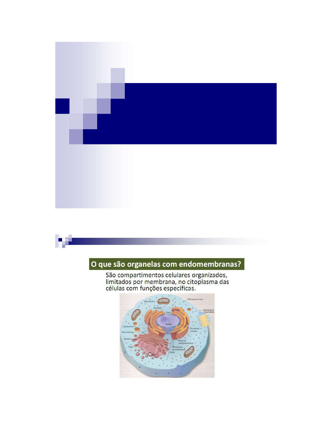 01/06/2015 1 ORGANELAS 01/06/2015 2 SISTEMA DE ENDOMEMBRANAS Composto por compartimentos(cisternas, sáculos e túbulos) que se comunicam entre si. A comunicação pode ser direta ou mediada por vesículas transportadoras 01/06/2015 3 COMO SURGIU ESSA ESTRUTURA? Hipótese autogênica Origem a partir de uma única linhagem celular (bactéria) BACTÉRIA PERDA DA PAREDE CELULAR INVAGINAÇÃO DE MEMBRANA COMPARTIMENTALIZAÇÃO DO DNA 01/06/2015 4 Hipótese endossimbiótica Origem a partir de mais de uma linhagem celular por endosimbiose BACTÉRIA ARCHAEBACTÉRIA PERDA DE PAREDE CELULAR E ENDOCITOSE SIMBIOSE E ORIGEM DO NÚCLEO 01/06/2015 5 Mitocôndrias e cloroplastos assemelham-se a bactérias, na forma, tamanho e estruturas membranares; Cloroplastos e mitocôndrias produzem as suas próprias membranas internas, dividem-se independentemente da célula e contêm DNA em moléculas circulares, não associado a proteínas; Os ribossomas dos cloroplastos e mitocôndrias são mais semelhantes aos dos procariontes do que dos eucariontes; 01/06/2015 6 RIBOSSOMOS DNA MEMBRANA PLASMÁTICA PAREDE CELULAR FLAGELO SISTEMA DE ENDOMEMBRANAS DIFERENCIANDO OS EUCARIOTOS... SISTEMA DE ENDOMEMBRANAS 01/06/2015 7 SISTEMA DE ENDOMEMBRANAS 01/06/2015 8 01/06/2015 9 01/06/2015 10 01/06/2015 11 RIBOSSOMOS 01/06/2015 12 01/06/2015 13 01/06/2015 14 Retículo Endoplasmático Rugoso (RER) Função As proteínas produzidas pelos ribossomos do retículo rugoso são lançadas da cavidade do retículo; São envolvidas por pedaços de membrana, formando pequenos “pacotes” ou vesículas cheias de proteína; Esses pequenos “pacotes” são enviados para o complexo golgiense, onde são empacotados; Do complexo golgiense podem ser secretadas, ou seja, lançadas para fora da célula; 01/06/2015 15 Destino das proteínas 01/06/2015 16 01/06/2015 17 01/06/2015 18 01/06/2015 19 01/06/2015 20 01/06/2015 21 01/06/2015 22 01/06/2015 23 Retículo Endoplasmático Liso (REL) Não Possui ribossomos na face citoplasmática de sua membrana, é continuo com o RER, mas há diferenças na composição enzimática das cisternas. O REL sistentiza lipídios para as membranas celulares. O colesterol e quase todos os lipídios da membrana são produzidos inicialmente no REL, mas os completados com glicídios são terminados no CG. 01/06/2015 24 01/06/2015 25 01/06/2015 26 01/06/2015 27 01/06/2015 28 RE e tolerância O etanol, ou mesmo certas drogas, como sedativos, quando ingeridos em excesso ou com freqüência, induzem a proliferação do retículo liso e de suas enzimas. Isso aumenta a tolerância do organismo à droga, o que significa que doses cada vez mais altas são necessárias para que ela possa fazer efeito. Esse aumento de tolerância a uma substância pode trazer como conseqüência o aumento da tolerância a outras substâncias úteis ao organismo, como é o caso de antibióticos. 01/06/2015 29 01/06/2015 30 01/06/2015 31 01/06/2015 32 01/06/2015 33 01/06/2015 34 Complexo de Golgi - Introdução É também chamado de aparelho de golgi ou zona de golgi. Pode ser encontrado próximo ao núcleo ou espalhado pelo citoplasma. É mais desenvolvido em células que sintetizam e exportam biomoléculas, fenômeno que depende do estado metabólico da célula. Recebe, prepara e exporta as proteínas a ele endereçadas pelo RER e outras biomoléculas derivadas do REL. Aparelho de Golgi: Conjunto de vesículas achatadas e empilhadas; Podem estar dispersos pelo citoplasma; Segrega, concentra e dá o acabamento final nas moléculas sintetizadas pelo retículo endoplasmático: Glicoproteínas / Glicolipídios / Lipoproteínas Acrescenta informações que determinam o seu destino final: Membrana plasmática Lisossomo Outras organelas Exocitose 01/06/2015 35 Composição química MEMBRANAS 40% Lipídios 60 % Proteínas (enzimas, proteínas estruturais, proteínas para formação de vesículas) LUZ Carboidratos Proteínas de secreção COMPLEXO GOLGIENSE É muito semelhante ao retículo endoplasmático, pois também é constituído por “sacos achatados” membranosos e vesículas; entretanto nunca apresenta ribossomos. Esses sacos são chamados de DICTIOSSOMOS. Atua como centro de armazenamento, transformação, empacotamento e remessa de substâncias na célula. DICTIOSSOMO 01/06/2015 36 Nas células há um sistema de troca de substancias por meio da continuidade das membranas e da formação de vesículas. As vesículas formadas são denominadas endossomos, que são vesículas de transporte interno entre C.G. e a membrana plasmática. As proteínas do RER são transferidas para o complexo de golgi por meio de vesículas, que chegam ao CG pela face cis. O transporte ocorre entre o RER e o CG e entre as cisternas do próprio CG. 01/06/2015 37 Após modificações pós-traducionais, as biomoléculas e principalmente as proteínas devem seguir até o seu alvo final no domínio celular. Algumas das proteínas vão para os lisossomos, outros vão para a membrana plasmática, organelas várias, serão diretamente exportados e outros tantos poderão formar vesículas de secreção. A destinação das moléculas protéicas se dava á seqüência de aminoácidos. A leitura dessa seqüência se dá por proteínas das vesículas transportadoras. 01/06/2015 38 São funções do COMPLEXO GOLGIENSE: 1 – GLICOLIZAÇÃO (adição de açúcares de determinadas proteínas produzidas no RE rugoso, como por exemplo mucopolissacarídeos produzidos por células do tubo digestivo. 01/06/2015 39 2 – SECREÇÃO CELULAR: Em todas as células que secretam substâncias, ou seja, nas que produzem substâncias e as “exportam”, para serem usadas fora da célula, observa-se um complexo golgiense muito desenvolvido. Como exemplo podemos dar as células do pâncreas que secretam o suco pancreático rico em enzimas digestivas que são empacotadas e armazenadas pelo complexo golgiense existente em grande quantidade nestas células. 3 – FORMAÇÃO DE LISOSSOMOS: As enzima