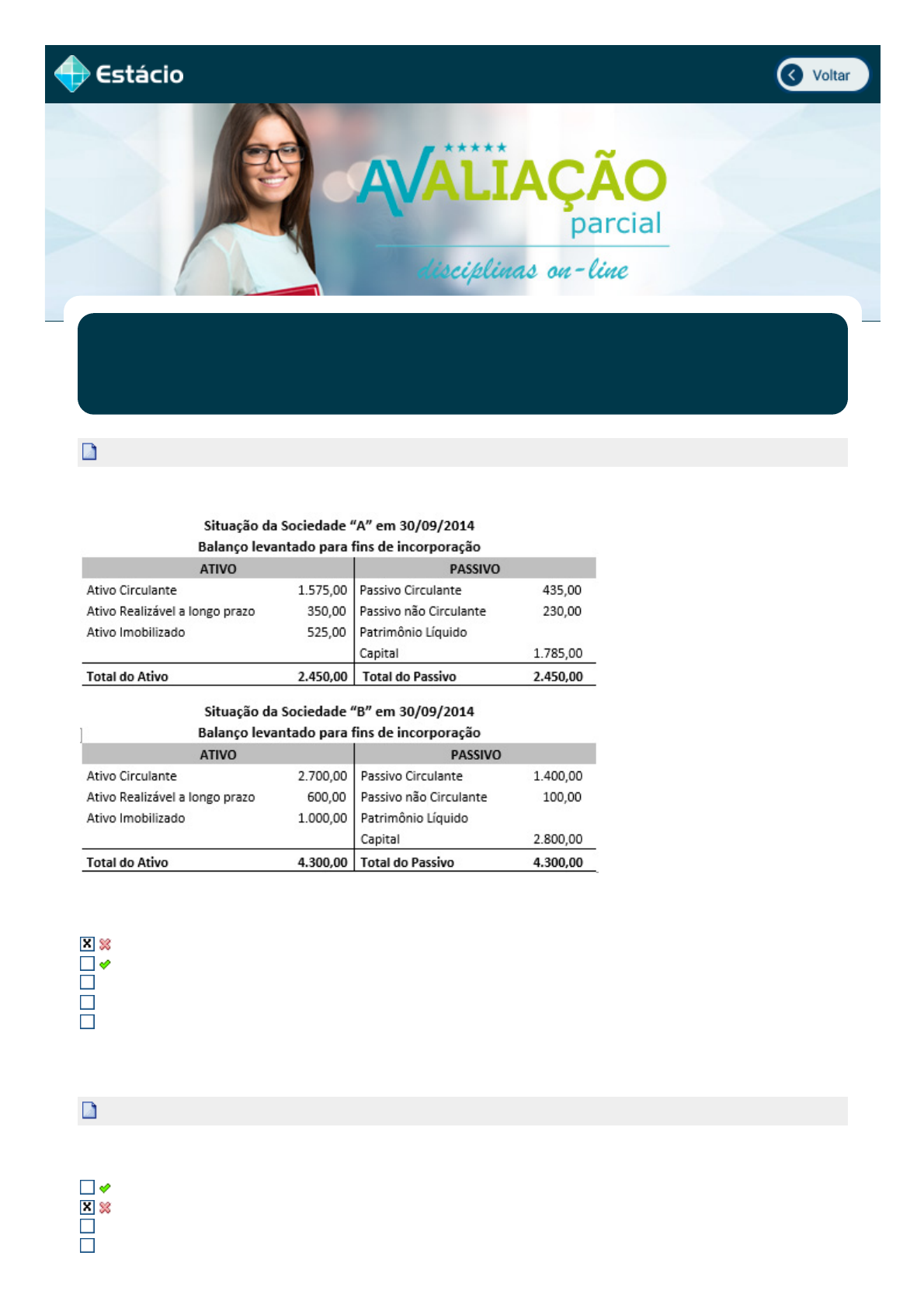 29/10/2019 EPS simulado.estacio.br/alunos/?user_cod=1895173&matr_integracao=201708009914 1/4 Disc.: CONTABILIDADE SOCIETÁRIA I Aluno(a): PRISCILA ALVES DA SILVA 201708009914 Acertos: 3,0 de 10,0 29/10/2019 1a Questão (Ref.:201708709256) Acerto: 0,0 / 1,0 A sociedade A (incorporada) encerra o seu balanço em 31/12/2014, e a sociedade B (incorporadora) encerra o exercício em 31/12/2014. Data da Incorporação: 30/09/2014. Após a incorporação, o valor do Patrimônio Líquido da sociedade B será de: R$ 2.450,00; R$ 4.585,00; R$ 10.000,00; R$ 4.275,00; R$ 330,00; Respondido em 29/10/2019 15:39:13 2a Questão (Ref.:201708130721) Acerto: 0,0 / 1,0 Quando uma sociedade deixa de existir devido a uma outra sociedade tê-la absorvida, mas esta nova sociedade continua com a personalidade jurídica , podemos afirmar que houve: Incorporação Cisão Fusão Integralização 29/10/2019 EPS simulado.estacio.br/alunos/?user_cod=1895173&matr_integracao=201708009914 2/4 Dissolução Respondido em 29/10/2019 15:39:22 3a Questão (Ref.:201709135263) Acerto: 0,0 / 1,0 A propósito dos conceitos relacionados à reorganização societária, analise as afirmativas abaixo: I - Fusão é a operação pela qual se unem duas ou mais sociedades para formar sociedade nova, que a elas sucederá em todos os direitos e obrigações. II - Quando uma ou mais sociedades são absorvidas por outra que a elas sucede em todos os direitos e obrigações, ocorre a cisão total. III - A incorporação é a operação pela qual a sociedade passa, independente de dissolução e liquidação, de um tipo para outro. Assinale a alternativa correta: I, II e III. III, apenas. II e III, apenas. I, apenas. II, apenas. Respondido em 29/10/2019 15:39:28 4a Questão (Ref.:201708649459) Acerto: 0,0 / 1,0 A base de avaliação de negócios de sociedades sob controle comum praticada nos países anglo-saxões faz referência ao conceito de: Full cost Arm's lenght Internal rate return Preço de transferência Custo de oportunidade Respondido em 29/10/2019 15:39:26 5a Questão (Ref.:201708709407) Acerto: 1,0 / 1,0 Numa operação de incorporação, quando o investidor incorpora uma empresa independente, com a qual não tem qualquer vinculo, os ativos e passivos identificáveis dessa incorporada serão avaliados pelo: Valor justo. Valor Justo ou valor de mercado líquido. Valor de mercado. Valor contábil. Valor realizável líquido. Respondido em 29/10/2019 15:39:29 6a Questão (Ref.:201708644161) Acerto: 0,0 / 1,0 Conforme preconiza as normas contábeis vigentes, as entidades devem contabilizar cada combinação de negócios pela aplicação do: Método da média ponderada Método da equivalência patrimonial Método da venda Método de aquisição Método do custo Respondido em 29/10/2019 15:39:32 29/10/2019 EPS simulado.estacio.br/alunos/?user_cod=1895173&matr_integracao=201708009914 3/4 7a Questão (Ref.:201708276457) Acerto: 1,0 / 1,0 A operação que ocorre à medida que, numa combinação efetivada apenas pela troca de elementos patrimoniais, a entidade que emitiu os títulos (adquirente legal) e os entregou aos proprietários da outra entidade (adquirida legal) o faz em tal quantidade que dilui significativamente a participação relativa dos que eram proprietários da entidade que emitiu os títulos patrimoniais, permitindo que o controle passe para os ex-proprietários da adquirida legal, é conhecida como: Consórcio empresarial Aquisição reversa Incorporação reversa Compra vantajosa Equivalência patrimonial Respondido em 29/10/2019 15:39:34 8a Questão (Ref.:201708709409) Acerto: 0,0 / 1,0 Podemos dizer que um dos principais objetivos da incorporação reversa é: afastar problemas societários. o ganho tecnológico. a obtenção de mercado. o ganho de escala. o planejamento tributário. Respondido em 29/10/2019 15:39:40 9a Questão (Ref.:201708897153) Acerto: 1,0 / 1,0 Quando se pode presumir que existe influência significativa em um investimento ? Quando o investidor adquire mais de 20% do poder de voto da investida. Quando o investidor adquire mais de 15% do poder de voto da investida. Quando o investidor adquire mais de 20% do Capital Social da investida. Quando o investidor vende menos de 15% do PL da empresa. Quando o investidor adquire menos de 20% do PL da investida. Respondido em 29/10/2019 15:39:38 10a Questão (Ref.:201709004862) Acerto: 0,0 / 1,0 A propósito dos investimentos em controladas, analise as afirmativas abaixo: I- Quando a entidade é gerida pelo poder de voto, onde para cada ação ordinária um voto, o detentor de 50% + 1% tem preponderância nas deliberações sobre políticas financeiras e operacionais da investida, ou seja, quem tem mais poder de voto controla a sociedade investida; II- Para ter poder sobre a investida, o investidor deve ter direitos existentes que lhe deem a capacidade atual de dirigir as atividades relevantes; III- Controlada é a entidade sobre a qual o investidor tem influência significativa; IV- Pode ser admitido o controle quando um investidor mantiver direta ou indiretamente 20% ou mais do poder de voto da investida, assim presumindo que ele tenha influência significativa, a menos que seja comprovado o contrário. Somente as alternativa II, IV estão incorretas Somente as alternativas III,IV estão incorretas Somente a alternativa I está incorreta Somente a alternativa I, II estão incorretas Todas as alternativas estão incorretas Respondido em 29/10/2019 15:39:44 29/10/2019 EPS simulado.estacio.br/alunos/?user_cod=1895173&matr_integracao=201708009914 4/4