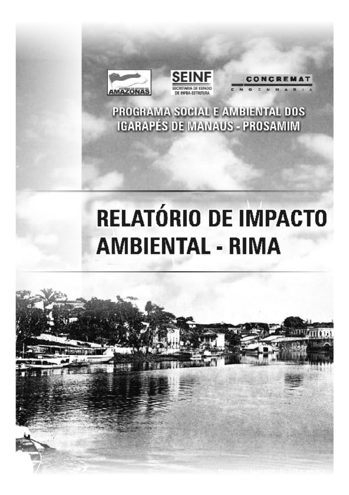 PROGRAMA SOCIAL E AMBIENTAL DOS IGARAPÉS DE MANAUS - PROSAMIM RELATÓRIO DE IMPACTO AMBIENTAL - RIMA 1 2 PROGRAMA SOCIAL E AMBIENTAL DOS IGARAPÉS DE MANAUS - PROSAMIM RELATÓRIO DE IMPACTO AMBIENTAL - RIMA PROGRAMA SOCIAL E AMBIENTAL DOS IGARAPÉS DE MANAUS - PROSAMIM RELATÓRIO DE IMPACTO AMBIENTAL - RIMA 3 PROGRAMA SOCIAL E AMBIENTAL DOS IGARAPÉS DE MANAUS RELATÓRIO DE IMPACTO AMBIENTAL - RIMA Julho 2004 4 PROGRAMA SOCIAL E AMBIENTAL DOS IGARAPÉS DE MANAUS - PROSAMIM RELATÓRIO DE IMPACTO AMBIENTAL - RIMA PROGRAMA SOCIAL E AMBIENTAL DOS IGARAPÉS DE MANAUS - PROSAMIM RELATÓRIO DE IMPACTO AMBIENTAL - RIMA 5 SUMÁRIO 1. O PROGRAMA SOCIAL E AMBIENTAL DOS IGARAPÉS DE MANAUS - PROSAMIM .............7 1.1 O PROBLEMA A RESOLVER ...........................................................................................................7 1.2 O QUE SERÁ FEITO ...........................................................................................................................8 1.2.2 ÁGUA POTÁVELE ESGOTAMENTO SANITÁRIO ..........................................................10 1.2.2.1 ABASTECIMENTO DE ÁGUA .........................................................................................10 1.2.2.2 ESGOTAMENTO SANITÁRIO .........................................................................................10 1.2.3 URBANISMO E HABITAÇÃO .............................................................................................11 2. A ÁREA ONDE OCORRERÃO AS OBRAS DO PROSAMIM ..........................................................12 2.1 INTRODUÇÃO ..................................................................................................................................12 2.2 O CLIMA DE MANAUS ..................................................................................................................15 2.3 A GEOMORFOLOGIA, GEOLOGIA E OS SOLOS DA ÁREA DO PROSAMIM .....................17 2.4 O COMPORTAMENTO DAS CHUVAS E DAS ÁGUAS ............................................................19 2.5 AS ÁGUAS SUBTERRÂNEAS. .....................................................................................................23 2.6 AS ÁGUAS SUPERFICIAIS E OS SEDIMENTOS ......................................................................26 2.7 A FAUNA DA ÁREA DO PROSAMIM ........................................................................................30 2.8 A FLORA ...........................................................................................................................................35 2.9 USO E OCUPAÇÃO DO SOLO .......................................................................................................36 2.10 A POPULAÇÃO DA ÁREA DO PROSAMIM: ASPECTOS SOCIOECONÔMICOS ............39 2.10.1 ORIGEM DA POPULAÇÃO DA ÁREA DO PROSAMIM ............................................40 2.10.2 POPULAÇÃO DOS BAIRROS DO PROSAMIM POR SEXO .......................................41 2.10.3 ESTADO CIVIL E ESTRUTURA ETÁRIA .........................................................................42 2.10.4 COMPOSIÇÃO DA FAMILIA ............................................................................................43 2.10.5 SITUAÇÂO DA MORADIA ................................................................................................44 2.10.6 ABASTECIMENTO DE ÁGUA ..........................................................................................45 2.10.7 ESGOTAMENTO SANITÁRIO .........................................................................................46 2.10.8 COLETA DE LIXO ................................................................................................................48 2.10.9 EDUCAÇÃO .........................................................................................................................49 2.10.10 SAÚDE ...............................................................................................................................51 2.10.11 TRANSPORTE E COMUNICAÇÃO ...............................................................................56 2.10.12 SITUAÇÃO DE EMPREGO E RENDA ...........................................................................58 2.10.13 PARTICIPAÇÃO COMUNITÁRIA ..................................................................................59 2.10.14 EXPECTATIVAS DOS MORADORES ............................................................................60 3. AS FORMAS DE IMPLANTAÇÃO DO PROSAMIM E SEUS IMPACTOS .....................................63 3.1 CENÁRIO TENDENCIAL ................................................................................................................65 3.2 CENÁRIO “SUCESSÃO” ................................................................................................................73 3.2.1 RESUMO COMPARATIVO DOS CENÁRIOS. ..................................................................87 6 PROGRAMA SOCIAL E AMBIENTAL DOS IGARAPÉS DE MANAUS - PROSAMIM RELATÓRIO DE IMPACTO AMBIENTAL - RIMA 4.MEDIDAS MITIGADORAS ......................................................................................................................95 4.1. INSTALAÇÃO E OPERAÇÃO DO CANTEIRO DE OBRAS .............................................................95 4.2. DESMOBILIZAÇÃO DO CANTEIRO DE OBRAS..............................................................................97 4.3. LIMPEZADE TERRENOSE DESTOCAMENTOS .............................................................................99 4.4. INSTALAÇÃO E OPERAÇÃO DE JAZIDAS DE MATERIAIS DE EMPRÉSTIMOS ................. 100 4.5. INSTALAÇÃO E OPERAÇÃO DE JAZIDA DE EMPRÉSTIMO ................................................... 102 4.6. INSTALAÇÃO E OPERAÇÃO DE ÁREAS DE BOTAFORA ......................................................... 102 4.7. SERVIÇO DE TERRAPLENAGEM ...............................................