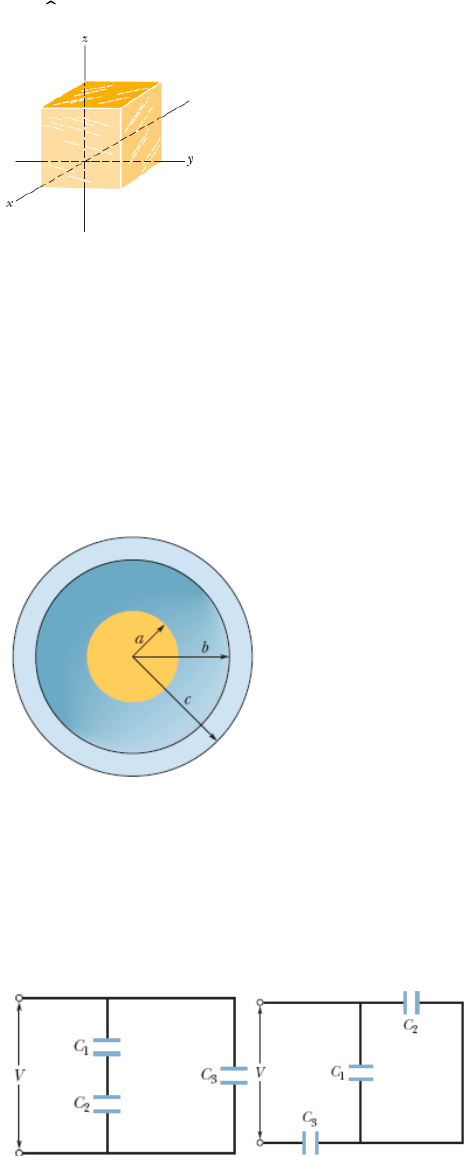 “Todos nós sabemos onde estivemos, tudo o que fazemos é viver para vencer (...)” Motörhead – Live To Win Disciplina: Física III Professor: Jheison Lopes dos Santos 3a Lista de Exercícios – Lei de Gauss e Capacitores 1) O cubo da figura tem 1,40 m de aresta e está orientado da forma mostrada na figura em uma região onde existe um campo elétrico uniforme. Determine o fluxo elétrico através da face direita do cubo se o campo elétrico, em newtons por coulomb, é dado por (a) 6,00î, (b) –2,00ĵ e (c) –3,00î + 4,00𝑘. 2) Um elétron é liberado a partir do repouso a 9,0 cm de distância de uma barra isolante retilínea muito longa com uma densidade de carga uniforme de 6,0 µC por metro. Qual é o módulo da aceleração inicial do elétron? 3) Na figura, uma esfera maciça, de raio a = 2,00 cm, é concêntrica com uma casca esférica condutora de raio interno b = 2,00a e raio externo c = 2,40a. A esfera possui carga uniforme q1 = +5,00 fC, e a casca, uma carga q2 = –q1. Determine o módulo do campo elétrico (a) em r = 0, (b) em r = a/2,00, (c) em r = a, (d) em r = 1,50a, (e) em r = 2,30a e (f) em r = 3,50a. Determine a carga (g) na superfície interna e (h) na superfície externa da casca. 4) Um capacitor de placas paralelas possui placas circulares com um raio de 8,20 cm, separadas por uma distância de 1,30 mm. (a) Calcule a capacitância. (b) Qual será a carga das placas se uma diferença de potencial de 120 V for aplicada ao capacitor? 5) Determine a capacitância equivalente dos circuitos abaixo, para C1 = 10,0 µF, C2 = 5,00 µF e C3 = 4,00 µF. 6) Na figura, uma bateria de 20,0 V é ligada a um circuito constituído por capacitores de capacitâncias C1 = C6 = 3,00 µF e C3 = C5 = 2,00C2 = 2,00C4 = 4,00 µF. Determine (a) a “Todos nós sabemos onde estivemos, tudo o que fazemos é viver para vencer (...)” Motörhead – Live To Win capacitância equivalente Ceq do circuito, (b) a carga armazenada por Ceq, (c) a diferença de potencial U1 e (d) q1 do capacitor 1. 7) Um capacitor de placas paralelas cujo dielétrico é o ar é carregado com uma diferença de potencial de 600 V. A área das placas é 40 cm2 e a distância entre as placas é 1,0 mm. Determine (a) a capacitância, (b) o valor absoluto da carga em uma das placas, (c) a energia armazenada, (d) o campo elétrico na região entre as placas. 8) Duas placas paralelas condutoras, de grande extensão, estão separadas por uma distância de 12 cm e possuem densidades superficiais de cargas de mesmo valor absoluto e sinais opostos nas faces internas. Uma força eletrostática de 3,9 × 10−15 N age sobre um elétron colocado na região entre as duas placas. (Despreze o efeito de borda.) (a) Determine o campo elétrico na posição do elétron. (b) Determine a diferença de potencial entre as placas. 9) Considere uma partícula com carga q = 1,0 µC, o ponto A a uma distância d1 = 2,0 m da partícula e o ponto B a uma distância d2 = 1,0 m da partícula. (a) Se A e B estão diametralmente opostos, como na figura a, qual é a diferença de potencial elétrico VA − VB? (b) Qual é a diferença de potencial elétrico se A e B estão localizados como na figura b? 10) Qual é o potencial elétrico produzido pelas quatro partículas da figura no ponto P, se V = 0 no infinito, q = 5,00 fC e d = 4,00 cm? 11) Duas pequenas esferas metálicas A e B, de massas mA = 5,00 g e mB = 10,0 g, possuem a mesma carga positiva q = 5,00 µC. As esferas estão ligadas por um fio isolante, de massa desprezível e comprimento d = 1,00 m, muito maior que os raios das esferas. (a) Qual é a energia potencial elétrica do sistema? (b) Qual é a intensidade da força entre elas? (c) Suponha que o fio seja cortado. Qual é a aceleração de cada esfera nesse instante?