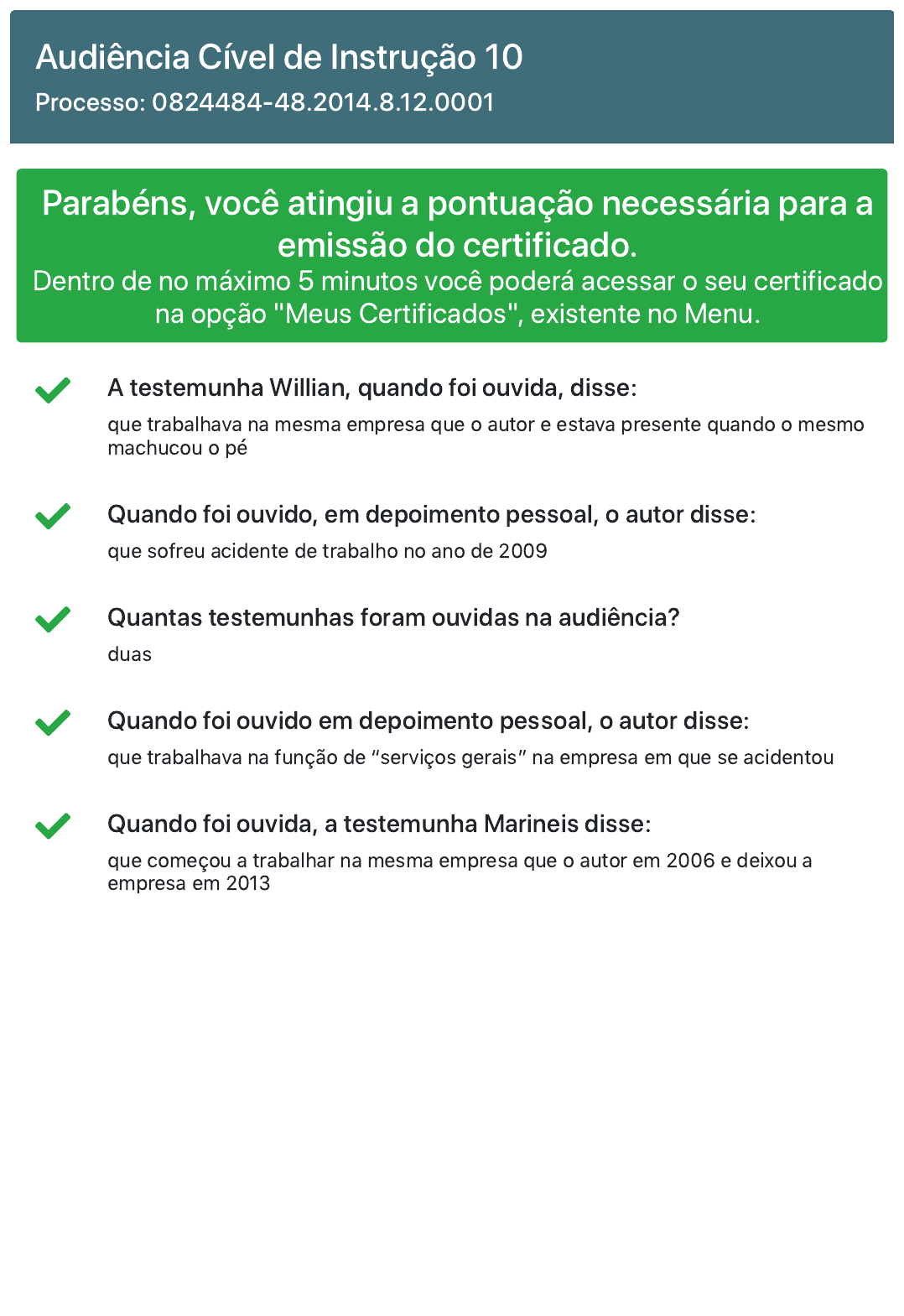 Audiência Cível de Instrução 10 Processo: 0824484-48.2014.8.12.0001 Parabéns, você atingiu a pontuação necessária para a emissão do certificado. Dentro de no máximo 5 minutos você poderá acessar o seu certificado na opção "Meus Certificados", existente no Menu. A testemunha Willian, quando foi ouvida, disse: que trabalhava na mesma empresa que o autor e estava presente quando o mesmo machucou o pé Quando foi ouvido, em depoimento pessoal, o autor disse: que sofreu acidente de trabalho no ano de 2009 Quantas testemunhas foram ouvidas na audiência? duas Quando foi ouvido em depoimento pessoal, o autor disse: que trabalhava na função de “serviços gerais” na empresa em que se acidentou Quando foi ouvida, a testemunha Marineis disse: que começou a trabalhar na mesma empresa que o autor em 2006 e deixou a empresa em 2013