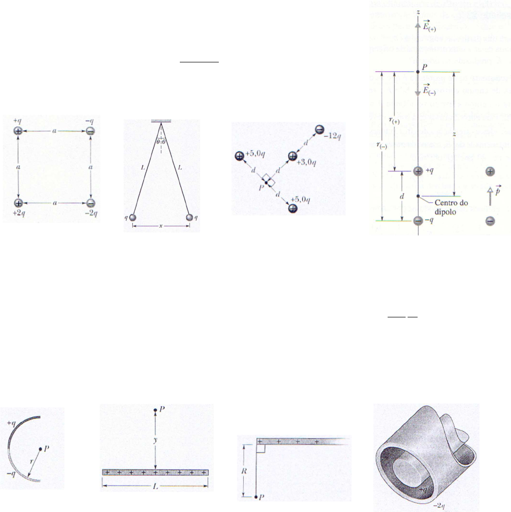 Primeira Lista de Exercícios – Física III – 2018.1 1. Na Figura 1 quais as componentes horizontais e (b) quais as componentes verticais da força eletrostática resultante sobre a partícula carregada no canto inferior esquerdo do quadrado se q = 1,0 x 10-7C e a = 5,0cm? 2. As cargas pontuais q1 e q2 estão situadas sobre o eixo x nos pontos x = -a e x = +a respectivamente. (a) Qual deve ser a relação entre q1 e q2 para que a força eletrostática resultante sobre a carga pontual +Q, colocada em x = +a/2 seja nula? (b) Repita (a), mas com a carga pontual +Q agora colocada em x = +3a/2. 3. Duas partículas livres (isto é, livres para se moverem) com cargas +q e +4q estão separadas por uma distância L. Uma terceira carga é colocada de modo que o sistema todo esteja em equilíbrio. (a) Encontre a localização, a intensidade e o sinal da terceira carga. (b) Mostre que o equilíbrio é instável. 4. Na Figura 2, duas esferas idênticas de massa m e carga q idêntica estão penduradas por fios não-condutores de comprimentos iguais a L. Suponha que θ seja tão pequeno que tgθ possa ser substituída pelo valor aproximado de senθ. (a) Mostre que, no equilíbrio, x � � q�L2π �� � �� onde x é a separação entre as bolas. (b) Se L = 120cm, m = 10g e x = 5;0 cm, qual o valor de q? Figura 1 Figura 2 Figura 3 Figura 4 5. Na Figura 3, qual a intensidade do campo elétrico no ponto P devido as quatro cargas pontuais mostradas? Considere d=5,0µm. Resp. E=0. 6. Na Figura 4, considere que as duas cargas sejam positivas. Supondo que z >> d, mostre que � � ����� ���� . 7. Uma haste fina de vidro é curvada em forma de semicírculo de raio r. Uma carga +q está uniformemente distribuída ao longo da metade superior e uma carga -q está uniformemente distribuída ao longo da metade inferior, como mostrado na Figura 5. Determine a intensidade, a direção e o sentido do campo elétrico ��⃗ no ponto P, no centro do semicírculo. Figura 5 Figura 6 Figura 7 Figura 8 8. Uma haste, Figura 6, fina não condutora de comprimento infinito L possui uma carga q distribuída uniformemente ao longo deste comprimento. Mostre que � � ������ ��������� � fornece a intensidade E do campo elétrico no ponto P sobre a bissetriz do segmento formado pela haste. 9. Na Figura 7, uma haste não condutora semi-infita (ou seja, infinita apenas em um sentido) possui densidade de carga linear uniforme λ. Mostre que o campo elétrico no ponto P faz um ângulo de 45° com a haste e este resultado independe da distância R. Resp. �" � �� � #����$ 10. Uma barra cilíndrica condutora muito longa de comprimento L com uma carga total +q está envolta por uma casca cilíndrica condutora (também de comprimento L) com carga total -2q, como mostrado na Figura 8. Use a lei de Gauss para determinar: (a) o campo elétrico em pontos fora da casca condutora, (b) a distribuição de carga sobre a casca e (c) o campo elétrico na região entre a casca e a barra. 11. Uma esfera sólida não-condutora de raio R possui uma distribuição de carga não-uniforme com densidade volumétrica de carga dada por % � &'($ , onde %) é uma constante e r é a distância ao centro da esfera. Mostre (a) que a carga total sobre a esfera é * � π%)+� e (b) que � � ����� ,$- .� fornece a intensidade do campo elétrico dentro da esfera. 12. Na Figura 9, uma esfera, de raio a e carga +q uniformemente distribuída por todo seu volume, é concêntrica com uma casca esférica condutora de raio interno b e raio externo c. Esta casca possui uma carga resultante -q. Determine as expressões para o campo elétrico, em função do raio r, (a) dentro da esfera (r < a), (b) entre a esfera e a casca (a < r < b), (c) no interior da casca (b < r < c) e (d) fora da casca (r > c). (e) Quais são as cargas nas superfícies interna e externa da casca? Figura 9 Figura 10 Figura 11 13. Uma distribuição volumétrica de carga com simetria esférica, mas não-uniforme, produz um campo elétrico de intensidade � � /.�, orientado radialmente do centro da esfera para fora. Nesta equação, r é a distância radial a partir desse centro e K é uma constante. Qual a densidade volumétrica ρ da distribuição de carga? 14. A Figura 10 mostra, em corte transversal, um cilindro oco isolante de comprimento muito longo com raio interno a e raio externo b que é concêntrico a um outro cilindro isolante (também de comprimento muito longo) com raio interno c e raio externo d. O cilindro interno oco possui uma distribuição de cargas uniforme com uma densidade volumétrica igual a + ρ e o cilindro oco externo possui uma distribuição de cargas uniforme com uma densidade volumétrica igual a - ρ. Determine o módulo, a direção e o sentido do campo elétrico em função de ρ e da distância r ao centro comum para as regões: (a) r < a, (b) a < r < b, (c) b < r < c, (d) c < r < d, (e) r > d. 15. O campo elétrico no interior de uma esfera não-condutora de raio R, com carga distribuída uniformemente em seu volume, possui direção radial e intensidade dada por ��.� � �(����$0. Nesta equação, q (positiva ou negativa) é a carga total dentro da esfera e r é a distância medida a partir do centro da esfera. (a) Tomando V = 0 no centro da esfera, encontre o potencial elétrico V (r) dentro da esfera. (b) Qual a diferença de potencial elétrico entre um ponto na superfície da esfera e o centro dela? (c) Se q for positiva, qual desses dois pontos está no potencial mais elevado? Resp. (a) 2 3.285 0+3 , (b) 2 3 85 0+, (c) Para q > 0, a diferença no item anterior é negativa, logo o centro tem potencial maior. 16. Uma carga q está distribuída uniformemente por todo um volume esférico de raio R. (a) Fazendo V = 0 no infinito, mostre que o potencial a uma distância r do centro, onde r < R, é dado por 8 � 3�3+22.2�85 0+3 . (b) Por qu