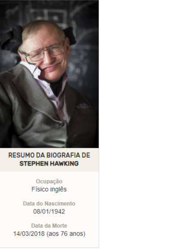 Stephen Hawking Stephen William Hawking foi um físico teórico britânico nascido em 8 de Janeiro de 1942, em Oxford, Inglaterra. Hawking, apesar de paralisado por uma doença degenerativa, tornou-se um dos maiores cientistas de todos os tempos e foi o responsável por grande parte das maiores descobertas relacionadas à astrofísica moderna. Seu pai cursou medicina e sua mãe estudou filosofia, política e economia, ambos na Universidade de Oxford. Com seis anos, já construía trens de brinquedo. Considerado uma criança precoce, os colegas da escola o apelidaram de Einstein. Stephen odiava matemática, porque achava fácil demais. Sua paixão era física e astronomia. Com 17 anos ganhou uma bolsa para estudar física na Universidade de Oxford. Seus colegas eram dois anos mais velhos que ele. Concluído o curso de Física, Stephen foi aceito no mestrado da Universidade de Cambridge. Doença Com 21 anos, após uma queda de patins, Stephen foi levado ao médico, que o diagnosticou com esclerose lateral amiotrófica (ELA), doença degenerativa que iria progressivamente paralisar seus músculos, e segundo o médico, o levaria à morte em no máximo três anos. Apesar do diagnóstico devastador, em 1965, Stephen casa-se com Jane Wilde, amiga de uma de suas irmãs. Na festa do casamento já se apoiava em uma bengala. Em 1970, Stephen parou de andar e começou a fazer uso de uma cadeira de rodas. Nessa época, já tinha três filhos e era um físico conhecido que trabalhava no Instituto de Tecnologia da Califórnia, nos Estados Unidos. Em 1985, com a saúde bastante agravada por uma pneumonia, durante uma viagem a Suíça, os médicos sugeriram desligar o respirador artificial, mas sua esposa não aceitou e levou o marido de volta para Cambridge. Submetido a uma traqueostomia, nunca mais falou. A partir de então, faz uso de um computador, com voz eletrônica, para se comunicar. Curiosidades Stephen Hawking nasceu exatamente 300 anos após a morte de Galileu Galilei(8 janeiro de 1642), famoso físico e astrônomo italiano. Como um grande incentivador das viagens espaciais, em 2007 teve a oportunidade de experimentar um ambiente sem gravidade ao participar de um voo que simula a sensação de uma viagem ao espaço. Voz robótica Uma das marcas de Stephen Hawking em vida foi a sua voz robótica produzida por um computador.O britânico passou a falar por meio de um sintetizador eletrônico logo depois que perdeu a capacidade de falar. Porém, a sua comunicação só se expandiu: foi justamente nessa época que o cientista escreveu o seu primeiro livro: Uma Breve História do Tempo, em 1988. A obra fala sobre a origem do universo, as partículas e o movimento das galáxias. O sucesso editorial fez com que o livro fosse traduzido para mais de 30 idiomas e popularizou ainda mais a pessoa carismática que era Hawking. Com o passar dos anos, para falar por meio da máquina, o físico escrevia as palavras somente com o movimentos dos olhos. Principais Livros Conheça os livros de Stephen Hawking: U m a b r e v e h is tó r ia d o te m p o , 19 8 8 S Sucesso editorial, livro Uma Breve História do Tempo foi escrito em 1988 (Foto: depositphotos) Stephen Hawking escreveu ‘Uma breve história do tempo’ em 1988, três anos após perder a voz por complicações da Esclerose Lateral Amiotrófica. De cara, esse livro foi um sucesso editorial. Com perguntas básicas sobre questões relevantes para a humanidade, Stephen Hawking buscou responder: Qual a origem do universo? Ele é infinito? E o tempo? Sempre existiu, ou houve um começo e haverá um fim? Existem outras dimensões além das três espaciais? E o que vai acontecer quando tudo terminar? Com um jeito peculiar e divertido, o físico britânico tratou das partículas e galáxias com uma linguagem simples para que qualquer leigo possa entender assunto complexos. B u r a c o s N e g r o s ,1993 Livro Buracos Negros é uma compilação de palestras de Hawking (Foto: depositphotos) Organizado pela BBC britânica, esse livro é um copilado das palestras proferidas por Hawking em 2016. A temática do evento não poderia ser outra a não ser os buracos negros, principal alvo de estudo do físico inglês. A obra explica como funciona essa região cósmica e como eles desafiam o espaço e o tempo. Além disso, o estudioso trata de como eles podem ser capazes de desvendar os segredos do universo. Tudo isso com uma linguagem divertida, objetiva e simples, marcas inconfundíveis de Stephen Hawking, conforme afirmou uma crítica do ‘The Observer’: “Hawking consegue explicar algumas das questões mais complexas da física cósmica com uma combinação perfeita de clareza e sagacidade”. O u n iv e r s o n u m a c a s c a d e n o z , 2 0 0 1 Sobre física, livro O Universo Numa Casca de Noz foi outro título de sucesso de Hawking (Foto: depositphotos) Em ‘O universo numa casca de noz’, Stephen Hawking trata mais da física, sua área de atuação. Dela, ele se vale para reproduzir ilustrações, fotos e esquemas detalhados sobre os processo mais complexos. Para você ter uma ideia, nessa obra Hawking faz comparações com cartas de baralho ou trens para que as pessoas comuns entendam mais sobre as leis da física, como o microcosmo quântico, macrocosmo universal, supergravidade, teoria quântica, teoria-M, holografia, dualidade. O físico cria personagens curiosos e incríveis, como astronautas, viajantes, moradores de outras galáxias para dar vida aos temas expostos em ‘O universo numa casca de noz’. M in h a B r e v e H is tó r ia , 2 0 13 Livro Minha Breve História nada mais é do que uma auto-biografia de Hawking (Foto: depositphotos) Aos 71 anos, Stephen Hawking lançou essa obra auto-biográfica. ‘Minha Breve História’ foi publicado pela primeira vez em 2013 e traz a trajetória do físico inglês desde a sua infância em Londres, passando pela descoberta da doença Esclerose Lateral Amiotrófica aos 21 anos até o seu reconhecimento