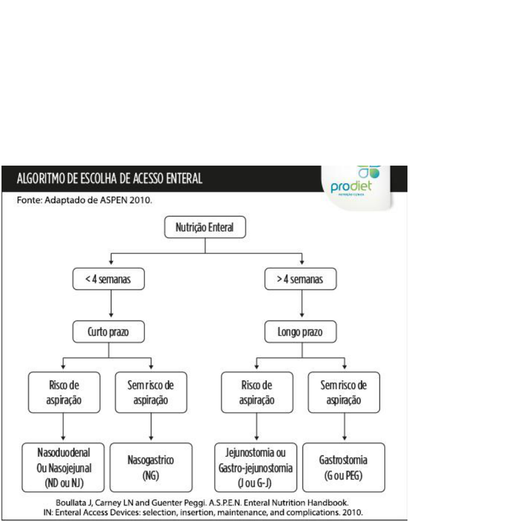 Sondas: São recomendadas por 3 a 4 semanas. A posição da sonda pode ser gástrica (Nasogástrica), duodenal e jejunal (Nasoentérica). A posição duodenal é indicada se houver gastroparesia (esvaziamento gástrico retardado) ou risco aumentado de broncoaspiração. Ostomias: A indicação para ostomia ocorre quando a indicação de TNE (Terapia Nutricional Enteral) exceder a 4 semanas. Quando não há risco de aspiração o ideal é a gastrostomia e a jejunostomia é recomendada em casos onde há o risco de aspiração. SISTEMAS DE ADMINISTRAÇÃO DA NUTRIÇÃO ENTERAL (SONDA) NUTRIÇÃO ENTERAL EM SISTEMA ABERTO Refere-se à nutrição enteral (NE), que exige manipulação prévia à administração, para uso imediato ou segundo recomendações do fabricante. Esse sistema tem a vantagem de permitir o ajuste dos nutrientes às necessidades do paciente, mas requer treinamento adequado dos manipuladores das fórmulas, para evitar as complicações relacionadas com a mistura e o envase incorretos dos nutrientes. Assim, tem-se menor custo quando há pessoal treinado. Podem ser utilizadas embalagens de plástico rígido, não esterilizadas, descartáveis, que devem obedecer a certos parâmetros, visando uma administração de boa qualidade, como: Lavagem das mãos das pessoas que manipulam a dieta; Frasco de boca larga para o envase da dieta, evitando assim o uso de conectores para transferir a dieta do dosificador para o frasco final, permitindo que a operação de transferência seja realizada por uma única pessoa; Manter o frasco fechado após o preparo e transportá-lo para o local de hospitalização ou de administração; Conectar o frasco, sem cortá-lo, ao equipo de infusão; O frasco deve ter um anel que permita pendurá-lo em um suporte; Deve permitir a correta observação do volume existente; Controlar os fatores para evitar contaminação, a qual ocorre por transferência de micro-organismos das mãos para os equipos conectados aos pacientes, devido à presença de contaminantes na dieta em pó industrializada, ou à água contaminada; ocorre também por condições inadequadas de administração, além das condições de temperatura externa a que são submetidas as fórmulas e ao tempo de infusão das mesmas; Obedecer às normas estabelecidas pelas autoridades de saúde pública com relação aos controles microbiológicos do pessoal que manipula alimentos; Recomenda-se envasar apenas a quantidade a ser utilizada nas próximas 4-5 horas. NUTRIÇÃO ENTERAL EM SISTEMA FECHADO É a NE industrializada, estéril, acondicionada em recipiente hermeticamente fechado, e já possuindo um conector para o equipo de infusão. A nutrição enteral pronta para uso permite ofertar os nutrientes em embalagens adequadas para o imediato consumo, mas quando não são bem indicados e utilizados podem aumentar o custo da terapia. Seu uso inclui os seguintes requisitos: Deve ser de fácil manuseio, para impedir contaminação; Infusão da fórmula enteral sem necessidade da agulha para a entrada de ar; Ensino do uso correto ao pessoal da enfermagem, ao paciente e/ou aos familiares, evitando erros e danos ao sistema de infusão. TIPOS DE SUPORTE NUTRICIONAL O ideal, sempre que possível, é ingerir os alimentos por via oral. Porém, alguns pacientes não conseguem se alimentar devido a problemas com a própria doença ou com os efeitos colaterais de seus tratamentos. Além do acompamento com nutricionista a terapia nutricional inclui bebidas supletivas e suporte enteral e parenteral. Os suplementos nutricionais ajudam os pacientes com câncer a obter os nutrientes necessários para se manterem saudáveis. Eles fornecem energia, proteínas, gorduras, carboidratos, fibras, vitaminas e minerais. Entretanto, não devem ser a única fonte de nutrição do paciente. O paciente que não consegue ingerir a quantidade adequada de calorias e nutrientes por via oral pode ser alimentado por: Via enteral. Na Nutrição enteral os nutrientes são administrados por uma sonda inserida no estômago ou intestino. Via parenteral. Na Nutrição parenteral os nutrientes são infundidos na corrente sanguínea. Os nutrientes são administrados em fórmulas líquidas que contém água, proteínas, gorduras, carboidratos, vitaminas e minerais. O suporte nutricional pode melhorar a qualidade de vida do paciente durante o tratamento, mas pode provocar problemas que devem ser levados em consideração antes de iniciar o tratamento. Discuta com seu médico os benefícios e riscos de cada tipo de suporte nutricional. NUTRIÇÃO ENTERAL A nutrição enteral consiste em administrar nutrientes ao paciente em forma líquida através de uma sonda inserida no estômago ou no intestino delgado. Os tipos de sondas de alimentação utilizados são: Sonda nasogástrica. Esse tipo de sonda é inserida pelo nariz e pela garganta até o estômago ou intestino delgado. É usada quando a nutrição é necessária apenas por algumas semanas. Sonda de gastrostomia ou Jejunostomia. Esses tipos de sonda podem ser colocadas no estômago ou no intestino delgado através de uma abertura feita no exterior do abdome, gastrostomia e jejunostomia respectivamente. Elas são normalmente utilizadas para alimentação enteral de longo prazo ou para pacientes que não podem usar a sonda nasogástrica. O tipo de fórmula para a nutrição que é utilizada se baseia nas necessidades específicas de cada paciente. Além disso, existem diferentes fórmulas para pacientes com condições especiais de saúde, como diabetes ou outras necessidades, como dietas religiosas ou culturais. NUTRIÇÃO PARENTERAL A nutrição parenteral é usada quando o paciente não pode receber alimentação por via oral ou por via enteral. A alimentação parenteral não usa o estômago ou os intestinos para digerir os alimentos. Os nutrientes são administrados diretamente no sangue, através de um cateter inserido em uma veia. Esses nutrientes incluem proteínas, gorduras, vitamin
