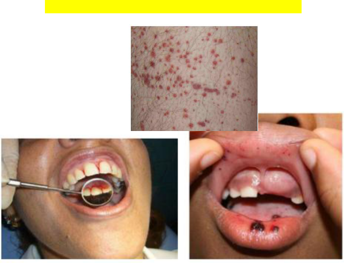 Púrpuras - Não é uma patologia, é uma lesão elementar - A lesão purpúrica decorre de hemorragia dos vasos da derme e/ou hipoderme, cujas hemácias extravasadas são fagocitadas pelos macrófagos que transformam o pigmento hemoglobínico em hemossiderina, resultando em coloração castanho-amarelada. - As lesões purpúricas diferem das eritematosas porque não desaparecem à vitropressão. É muito comum a associação do eritema à púrpura (lesão eritematopurpúrica); nesse caso, a vitropressão faz desaparecer parcialmente a lesão. - As lesões purpúricas surgem por alterações das plaquetas, dos vasos sanguíneos e da medula óssea. - Causas diversas Tipos: Petéquia – puntiforme Víbice – linear (trauma leve) Equimose – lesão em lençol Hematoma – grandes coleções - Classificação: *Refere-se ao mecanismo fisiopatológico das purpuras Púrpura Trombocitopênica - Diminuição do número de plaqueta - Caracterizam-se por hemorragias de certo porte (hematúria, melena), com hematomas e petéquias, em geral nos membros inferiores e superiores e nas nádegas. Surgem quando a quantidade de plaquetas está abaixo de 50.000/mL. OBS.: Para ser considerado trombocitopenia é necessário ter menos de 150mil, porém para ocorrer o extravasamento do sangue, é necessário que esteja abaixo de 50mil. Primaria/ idiopática – doenças autoimunes Púrpura Trombocitopênica Idiopática/ Doença de Werlhof Quadro clínico: plaquetopenia Hemorragia de mucosas Menstruação intensa Hematúria Lesões purpúricas na pele *Aguda: inicia-se por infecção do trato respiratório superior, acomete crianças e adolescentes e, em geral, desaparece espontaneamente em 2 meses *Crônica: instala-se insidiosamente, com fases de remissões e exacerbações. Ocorre com maior frequência em mulheres adultas. A maioria dos pacientes com esse tipo apresenta anticorpo circulante antiplaquetário. Diagnóstico de exclusão: quadro clínico + anamnese – excluir causas secundárias Secundária Patologias: A púrpura trombocitopênica secundária, ou sintomática, é observada nas: Farmacodermias (medicamentos) – agressão à MO ou autoimune (1) Complexo fármaco-anticorpo-complemento deposita-se sobre as plaquetas, causando a destruição delas (sulfa e quinidina); (2) A substância interage com a plaqueta, introduzindo haptenos na sua superİcie e provocando a reação citotóxica (penicilina); (3) O fármaco lesa a plaqueta, expondo anơgenos que estimulariam a produção de autoanticorpos (alfametildopa). (4) Alteração funcional das plaquetas (ácido aceƟlsalicílico, clopidogrel) ou depressão da medula (citostáticos, AZT). Colagenoses (lúpus, dermatomiosite, esclerodermia) – Anticorpos anti-plaquetários Neoplasias (principalmente hematológicas) – invasão da medula óssea – linfoma e leucemia Infecções – meningococcemia, endocardite, dengue etc Wiskot Aldritch (síndrome genética) – doença hereditária – Eczema + trombocitopenia + imunodeficiência *Trombocitopenia + quadro clínico igual a dermatite atópica *Geralmente, o tratamento é feito com corticosteroides, sendo, em alguns casos, indicada a esplenectomia Púrpura Intravascular - O problema está no sangue *Disfunção plaquetária ou alteração de outro fator de coagulação *Número de plaquetas está normal ou baixo, mas não a ponto de causar púrpura trombocitopênica Síndrome de Glanzmann Quadro raro Autossômico recessivo Deficiência da glicoproteína IIb/IIIa – faz parte da estrutura da plaqueta *Para ocorrer a agregação plaquetária, o fibrinogênio se liga a plaqueta através dessa proteína – nessa síndrome, não ocorre a formação do trombo – hemorragia Clínica variável *Púrpuras, epistaxis, hemorragia gengival e menorragia *Hemorragias gastrointestinais e hematúria Deficiência de vitamina K Cofator na gênese da protrombina e outros fatores – sem a vitamina K, não se forma protrombina *Coagulogramas: exames que medem a coagulação (tempo de protrombina, INR, tempo de sangramento) Causas: *Má absorção – pode ocorrer uma inflamação no TGI que cause *Hepatopatia – a vitamina K é ativada no fígado *Uso de antibióticos – pode alterar a microbiota normal *Anticoagulantes – varfarina Diagnóstico: tempo de protrombina, dosagem Vitamina K Tratamento: repõe a vitamina K e fatores de coagulação; tratar o que está causando a deficiência de vitamina K (tratar a doença de base) Púrpura Vascular - Problema no vaso sanguíneo *Alteração inflamatória da parede do vaso – vasculite ou alteração do colágeno vascular (da parede do vaso) e perivascular (que envolve e protege o vaso) Púrpura de Henoch-Shonlein Crianças e adultos jovens Pródromos – IVAS *Tem manifestações em outros sistemas que ajuda a fechar o caso clínico Tem caráter autoimune (?) Lesões purpúricas Membros inferiores e troncos (pode acometer todo o tegumento) Outros sintomas: febre, artralgia, dor abdominal (vômito e diarreia, sangramento), envolvimento renal (hematúria, proteinúria) Vasculite de pequenos vasos Diagnóstico: *Muitas vezes, tem que fazer biopsia da lesão e assim dá pra ver o processo inflamatório no vaso sanguíneo (vasculite) – através da clínica, epidemiologia e outros exames laboratoriais para saber qual é o tipo de vasculite Deficiência de vitamina C – Escorbuto Atualmente é raro Púrpuras muito características: petéquias (localizadas no folículo piloso); o pelo que está afetado pode ter uma alteração – pelo em saca rolha (fica enovelado) Principalmente membros inferiores Ocorre devido à diminuição da síntese de colágeno, na qual as células do endotélio vascular estão marcadamente alteradas Solicita: hemograma, coagulograma, dosagem de vitamina C – saber se tem algum distúrbio ou é só a absorção Púrpura Senil Mais comum em pessoas com + de 50 anos Caracteriza-se por hematomas e algumas petéquias nos antebraços e no dorso das m